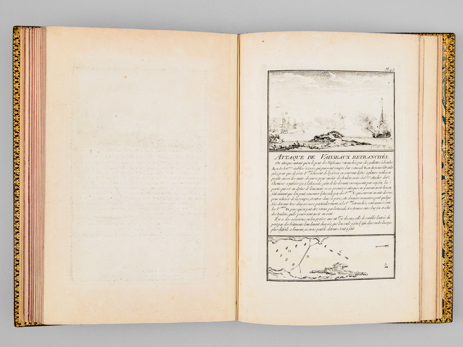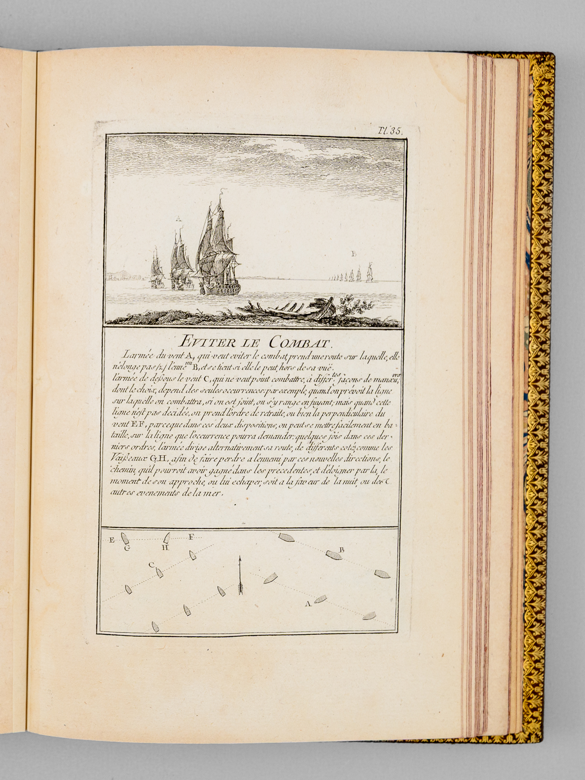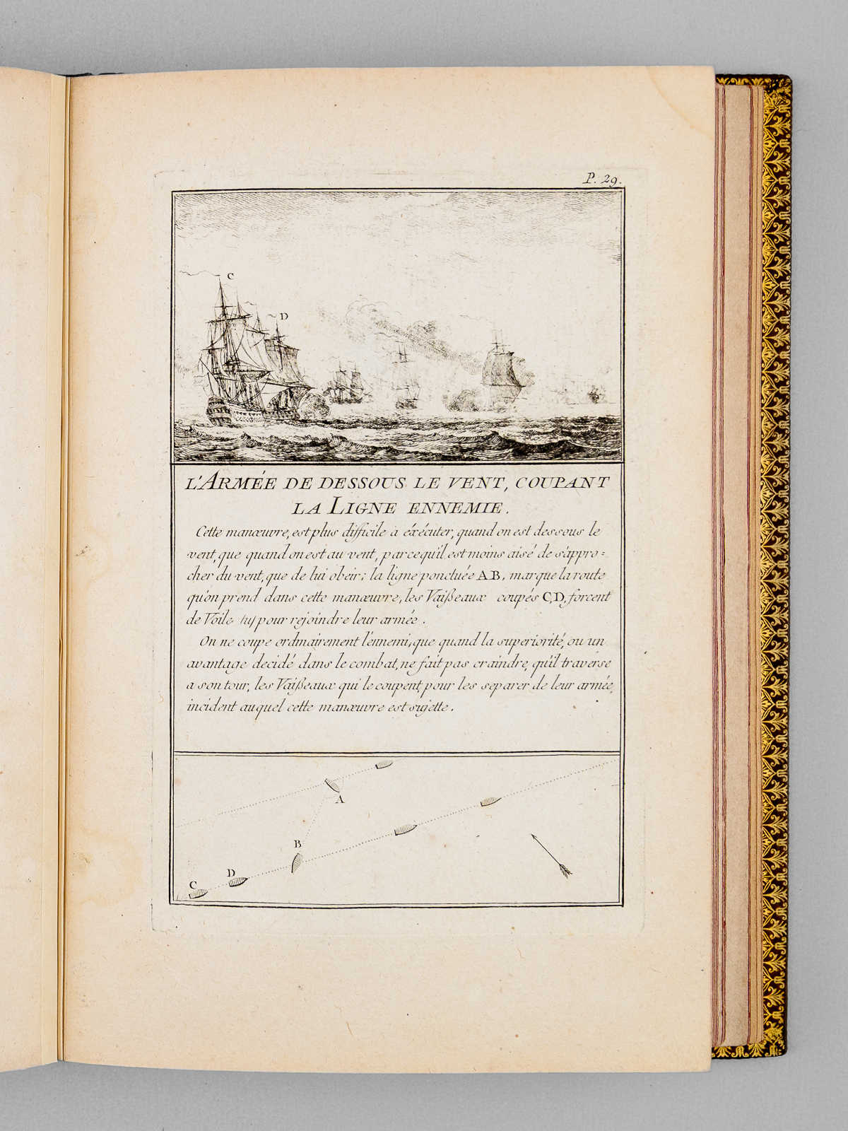 Commentaire : Agréable exemplaire en reliure moderne bien complet des 50 planches (le titre gravé est habituellement compris dans l'ensemble des planches), sans le frontispice ni la dédicace à Mgr le Duc de Choiseul, mais avec un très rare feuillet de titre original mentionnant 'chez l'Auteur' et illustré d'un combat opposant trois navires et une position fortifiée. Notre exemplaire comprend donc 2 feuillets de titre ('Chez l'Auteur' et 'Chez Chéreau') ; il s'agit probablement d'un exemplaire de second tirage complété par un rare feuillet de titre du premier tirage, dans sa version illustré dont nous n'avons pu trouver d'équivalent (la version habituelle du feuillet de titre mentionnant 'Chez l'Auteur' n'est pas illustrée). L'intégralité des feuillets ont été montés sur onglet, permettant une manipulation aisée et agréable des planches. Bon état (infime brûlure affectant partiellement 2 lettres dans le texte de la planche 13, très lég. frott. à la reliure, très bon état par ailleurs). Polak, 7234