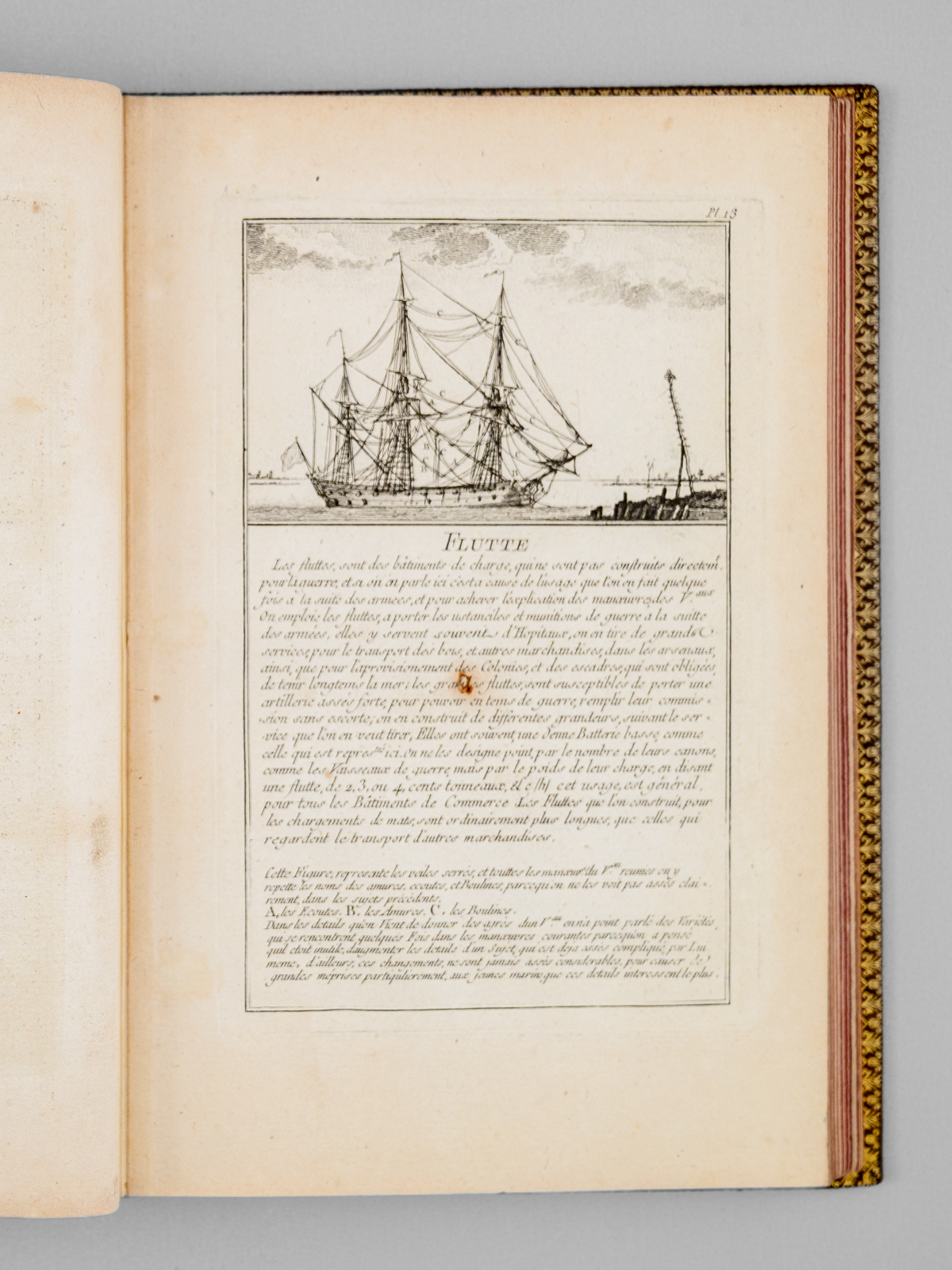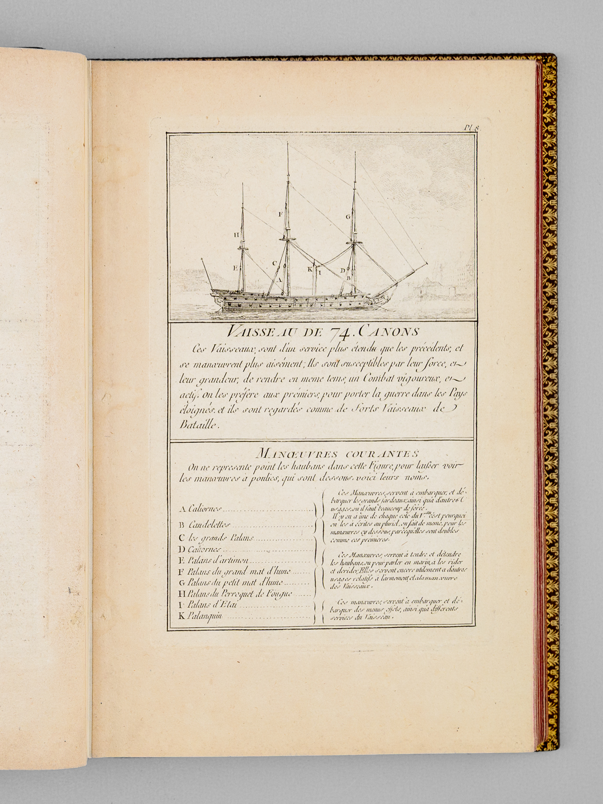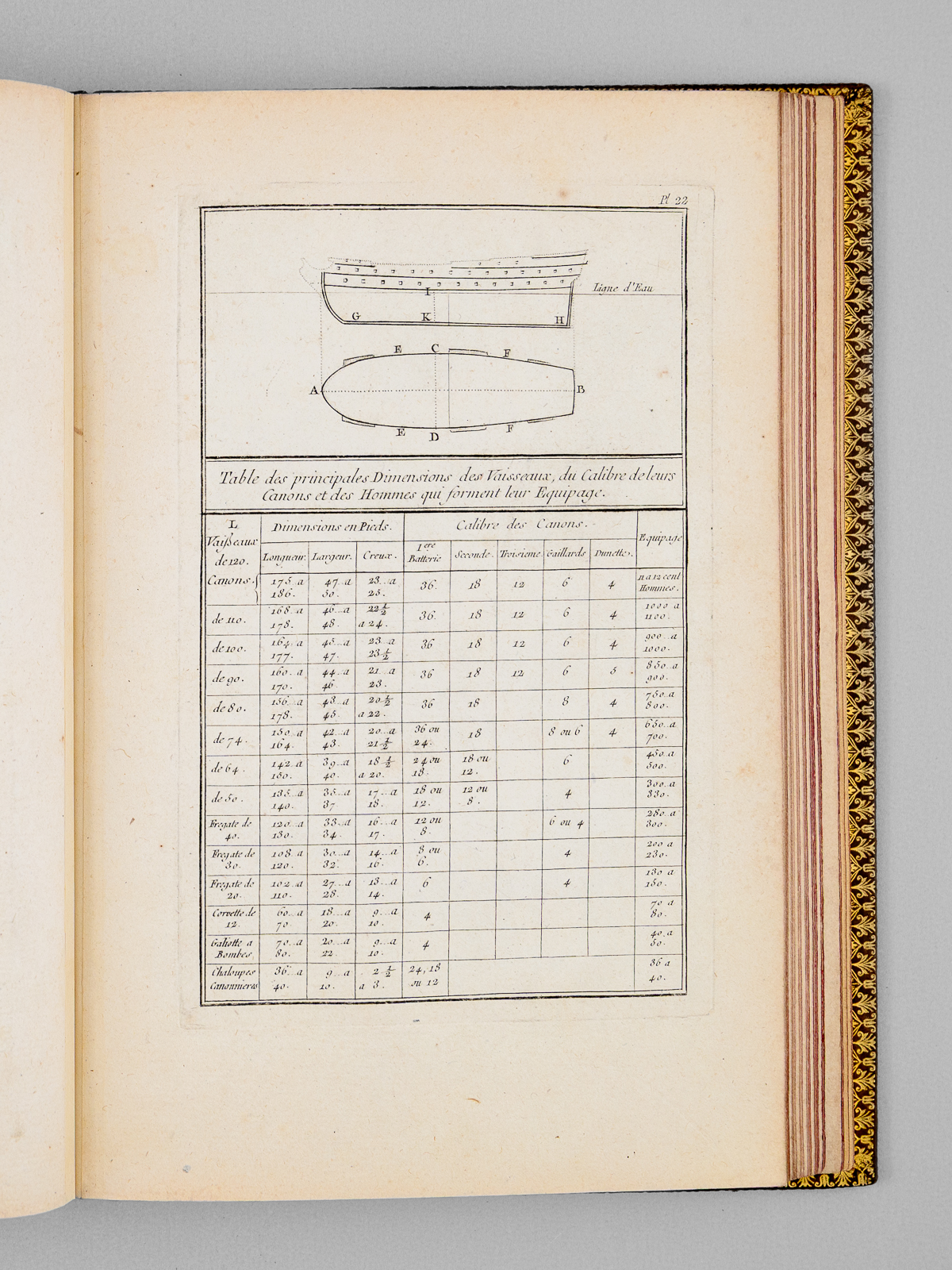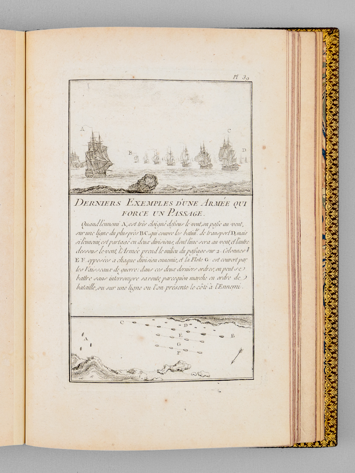 Commentaire : Agréable exemplaire en reliure moderne bien complet des 50 planches (le titre gravé est habituellement compris dans l'ensemble des planches), sans le frontispice ni la dédicace à Mgr le Duc de Choiseul, mais avec un très rare feuillet de titre original mentionnant 'chez l'Auteur' et illustré d'un combat opposant trois navires et une position fortifiée. Notre exemplaire comprend donc 2 feuillets de titre ('Chez l'Auteur' et 'Chez Chéreau') ; il s'agit probablement d'un exemplaire de second tirage complété par un rare feuillet de titre du premier tirage, dans sa version illustré dont nous n'avons pu trouver d'équivalent (la version habituelle du feuillet de titre mentionnant 'Chez l'Auteur' n'est pas illustrée). L'intégralité des feuillets ont été montés sur onglet, permettant une manipulation aisée et agréable des planches. Bon état (infime brûlure affectant partiellement 2 lettres dans le texte de la planche 13, très lég. frott. à la reliure, très bon état par ailleurs). Polak, 7234