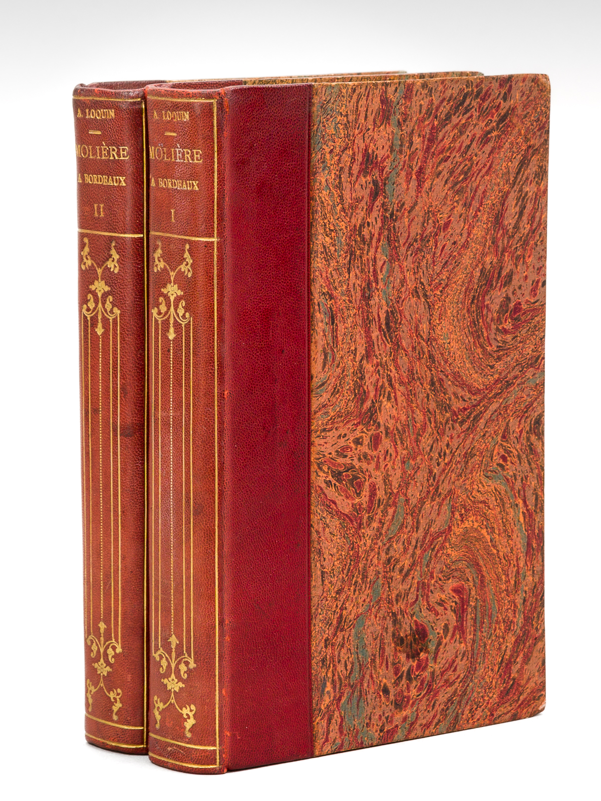 2 vol. in-8 reliure demi-chagrin bordeaux, dos lissé orné en long, tête dorée, couvertures et dos conservés, Libraires Associés, Paris, Féret et Fils, Bordeaux, H. Herluison, Orléans, 1898, 2 ff., 640 pp. ; 2 ff., 625 pp. Commentaire : Bon état pour cet exemplaire bien relié. Etonnant ouvrage, tiré à seulement 300 exemplaires, et dans lequel l'auteur présente une étude extrêmement fouillée et documentée sur le séjour de Molière à Bordeaux mais conclut, avec forces arguments, sur l'incroyable hypothèse de l'identification de Molière au Masque de Fer !