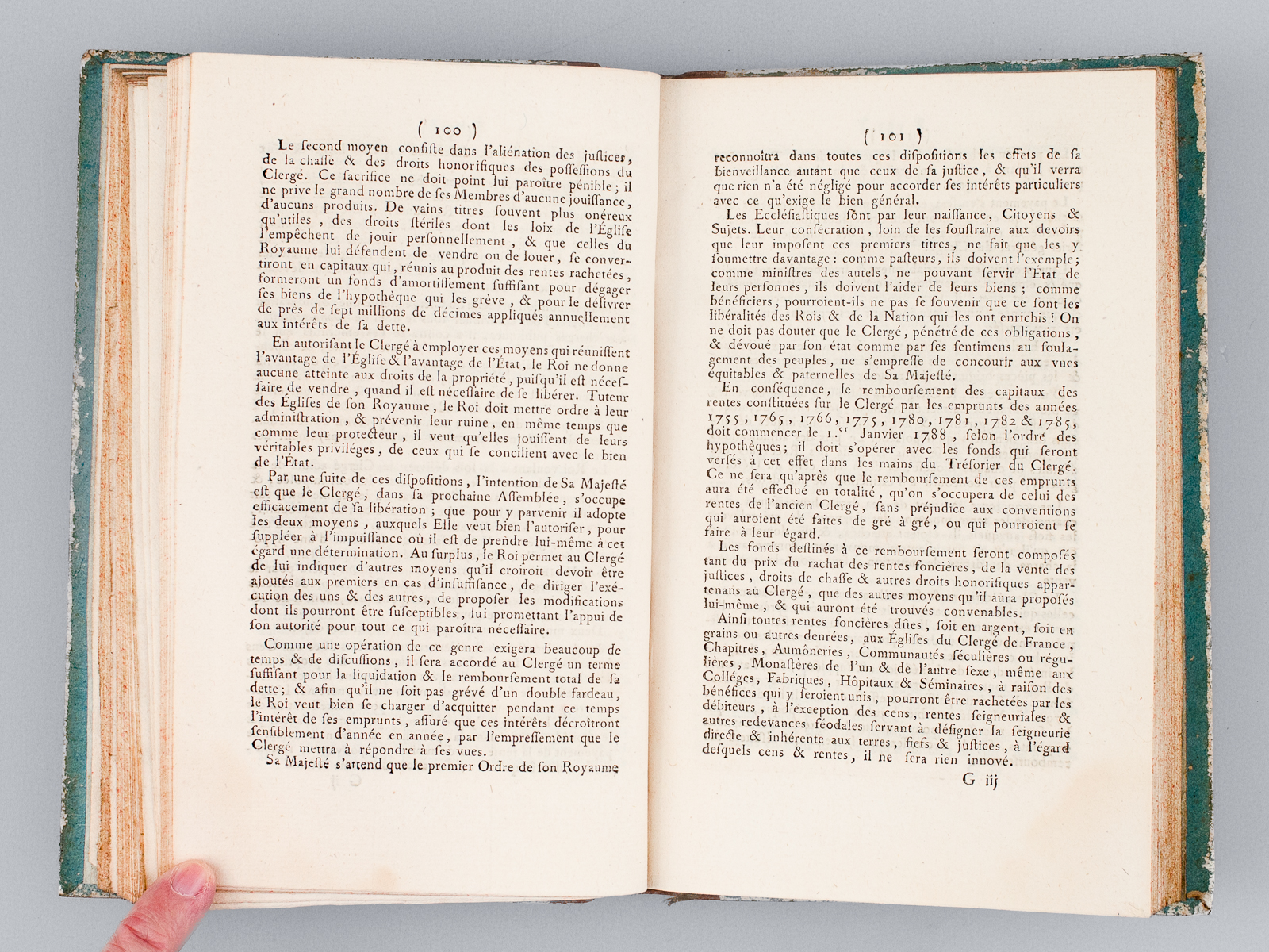 Commentaire : Du Pont de Nemours et Pierre Michel Hennin étaient les deux secrétaires-greffiers de l'Assemblée des notables, et c'est à ce titre qu'ils rassemblèrent les procès-verbaux des délibérations prises en 1787 dans les sept bureaux constitués pour examiner le plan Calonne. Une seconde assemblée se réunira en 1788 pour traiter des questions préliminaires sur l'organisation des Etats généraux. L'ouvrage est notamment illustré de 2 plans dépliants. Etat très satisfaisant (reliure un peu frottées, des mouill. marginales angulaires sur qq. cahiers).