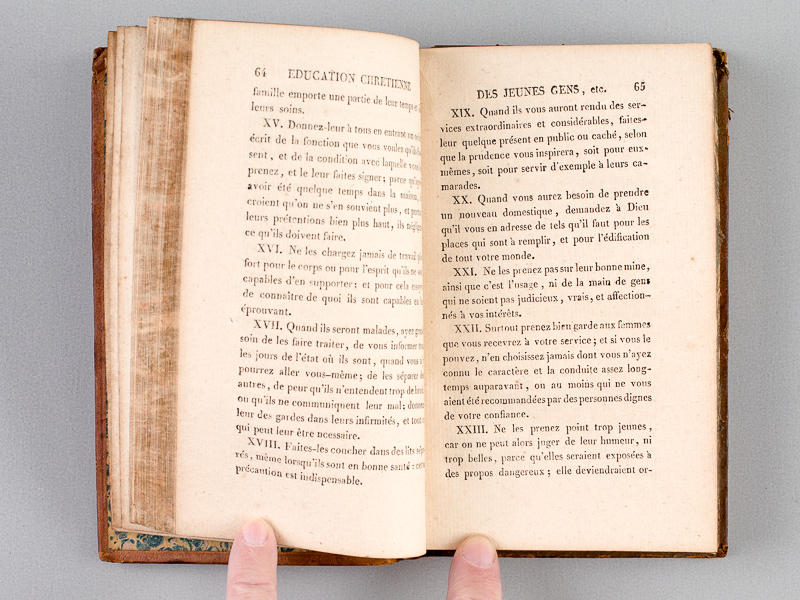 Suivie des Entretiens sur les Devoirs de la Vie Civile et sur plusieurs points importans de la Morale Chrétienne, par M. l'Abbé Marsolier, avec une jolie gravure, 1 vol. in-12 reliure de l'époque pleine basane marron, dos lisse orné, toutes tranches marbrées, Chez Cretté, Paris, 1814, 2 ff., iv-xxiv-350 pp. et 1 f. n. ch.