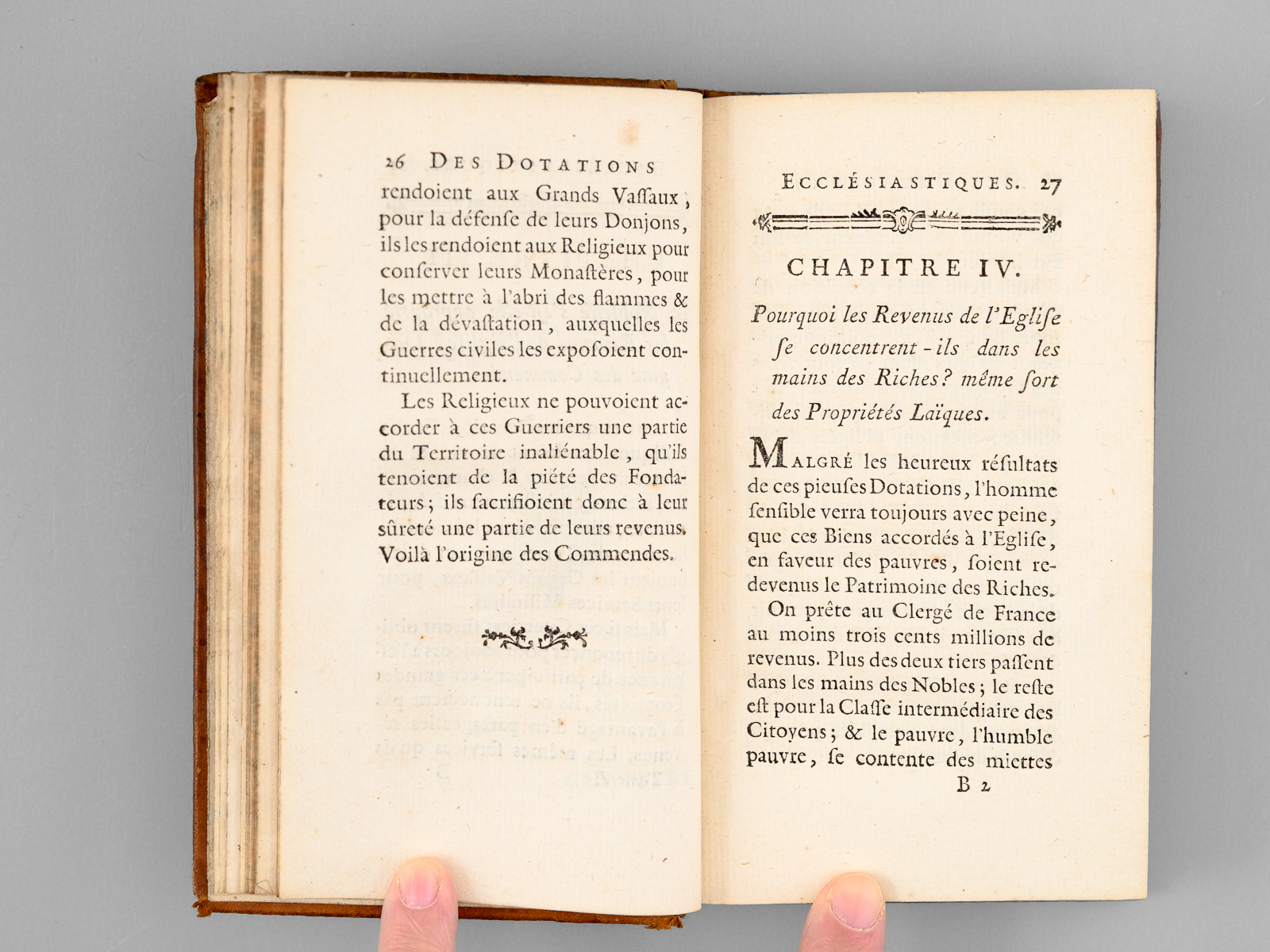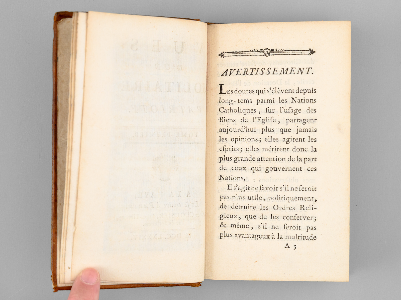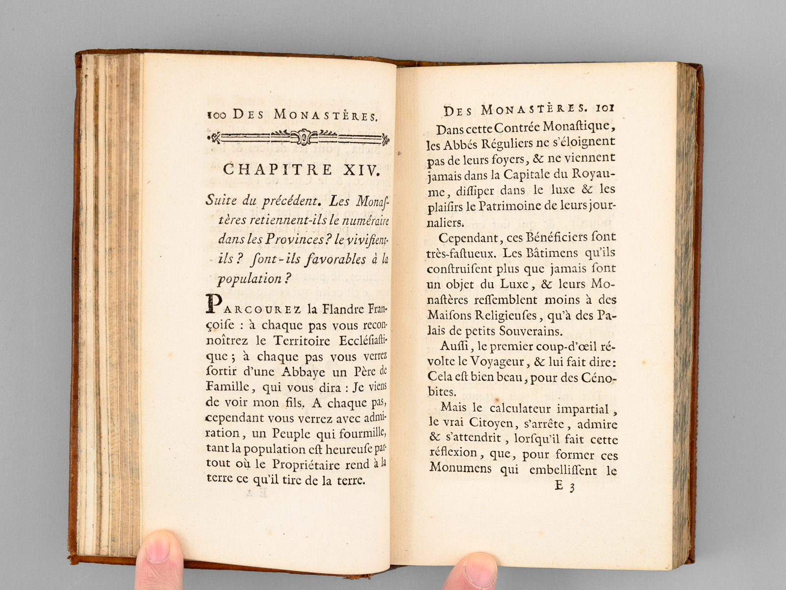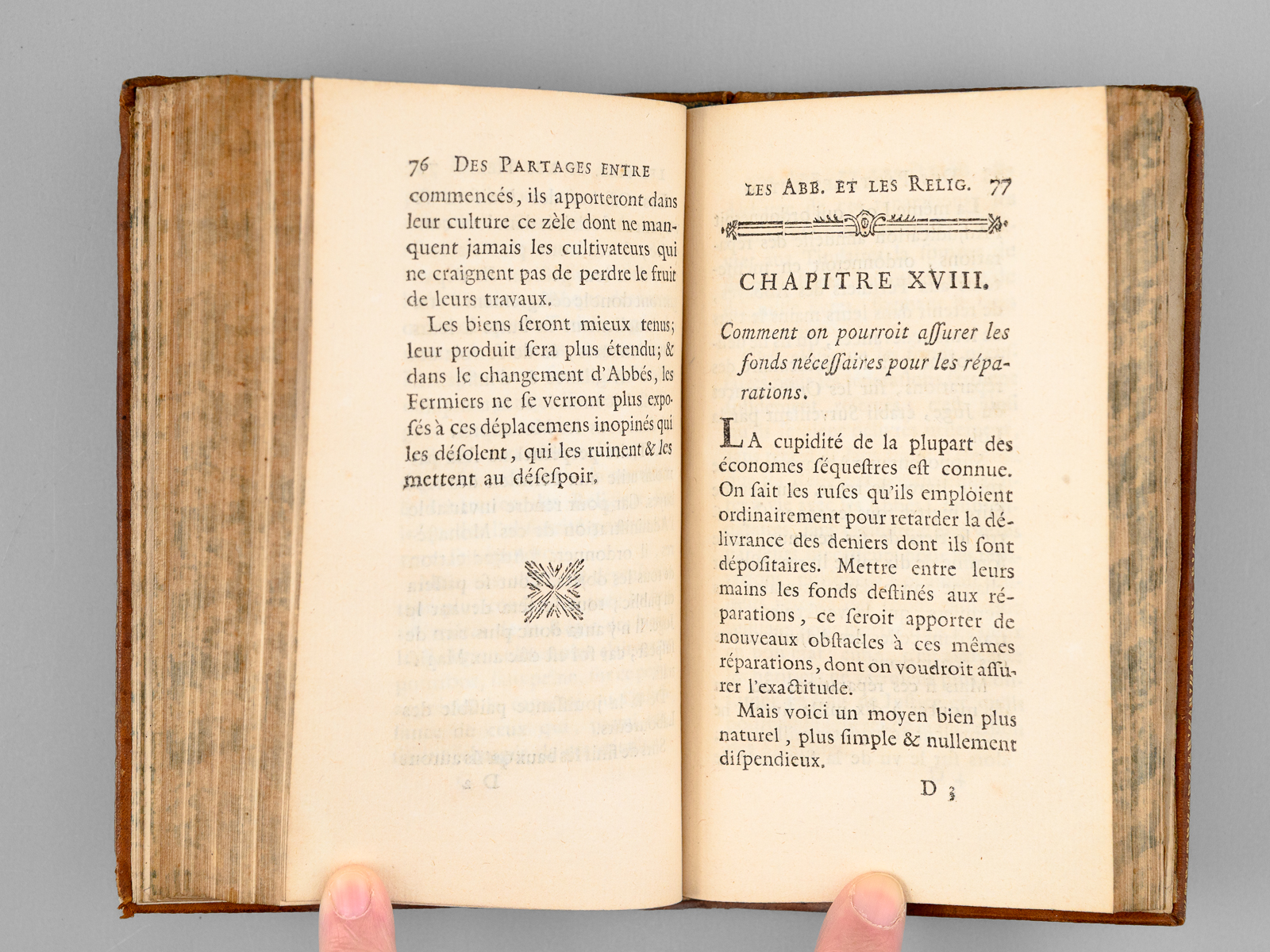 Commentaire : Moine bernardin, Christophe Léon Féroux (1730-1803) fut nommé, jeune encore, prieur de son ordre ou 'il fut amené à s'occuper d'une façon particulière des questions agricoles et économiques. Il publia des écrits dans lesquels il se déclare partisan du système de l'association et de la division des grandes propriétés, pensant que plus on augmente le nombre des petits propriétaires, plus on a de citoyens intéressés à féconder le sol'. Sous la Révolution, il prendre le titre de professeur de culture et devint membre de la Société Académique des Sciences (Larousse, GDU, VIII, 262). Il fait ici l'apologie des biens religieux, défend le célibat des religieux, critique le luxe, préconise l'impôt unique, l'abolition des servitudes, la justice gratuite et la conversion des dîmes en propriétés rurales et foncières. Dans le second tome, il évoque la conciliation entre les abbés commendataires et les religieux, et la liquidation des dettes des ordres religieux (INED, 1812). Etat très satisfaisant (petit mq. de cuir en plat, coins frottés, bon état par ailleurs). Barbier, IV, 1116