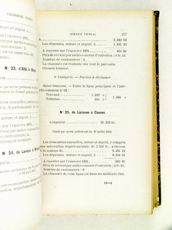 1 vol. in-8 reliure de l'époque demi-basane marron, Imprimerie Générale du Tarn Corbière & Julien, Albi, s.d., 728-159-360 pp. (Tableau de l'Unification des chemins de grande communication et Délibération du Conseil Général) Commentaire : Etat très satisfaisant (rel. un peu frottée)