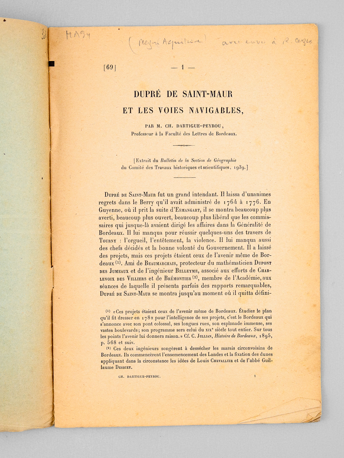1 brochure in-8, Extrait du Bulletin de la Section de Géographie du Comité des Travaux historiques et scientifiques 1939, Imprimerie Nationale, Paris, 1940, 18 pp. Commentaire : Exemplaire dédicacé par l'auteur à René Cuzacq 'toujours son ami'. Bon état (couv. lég. frottée).