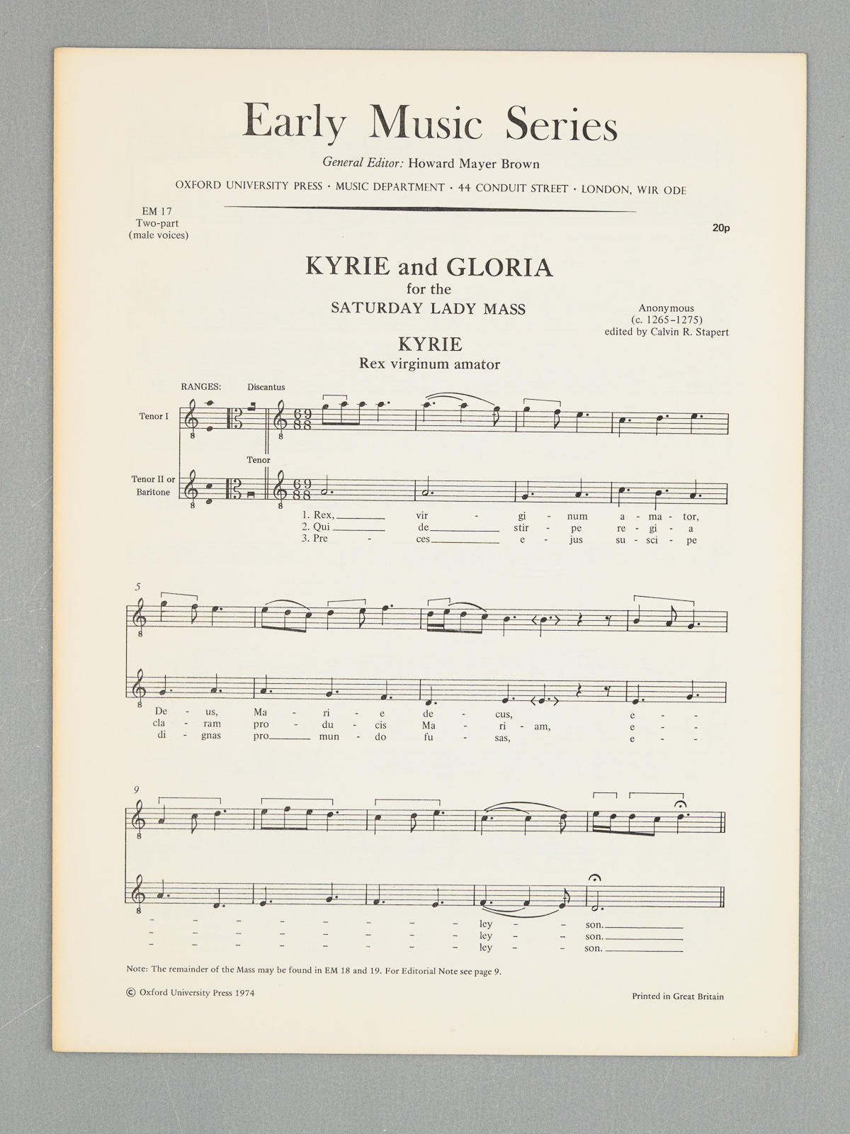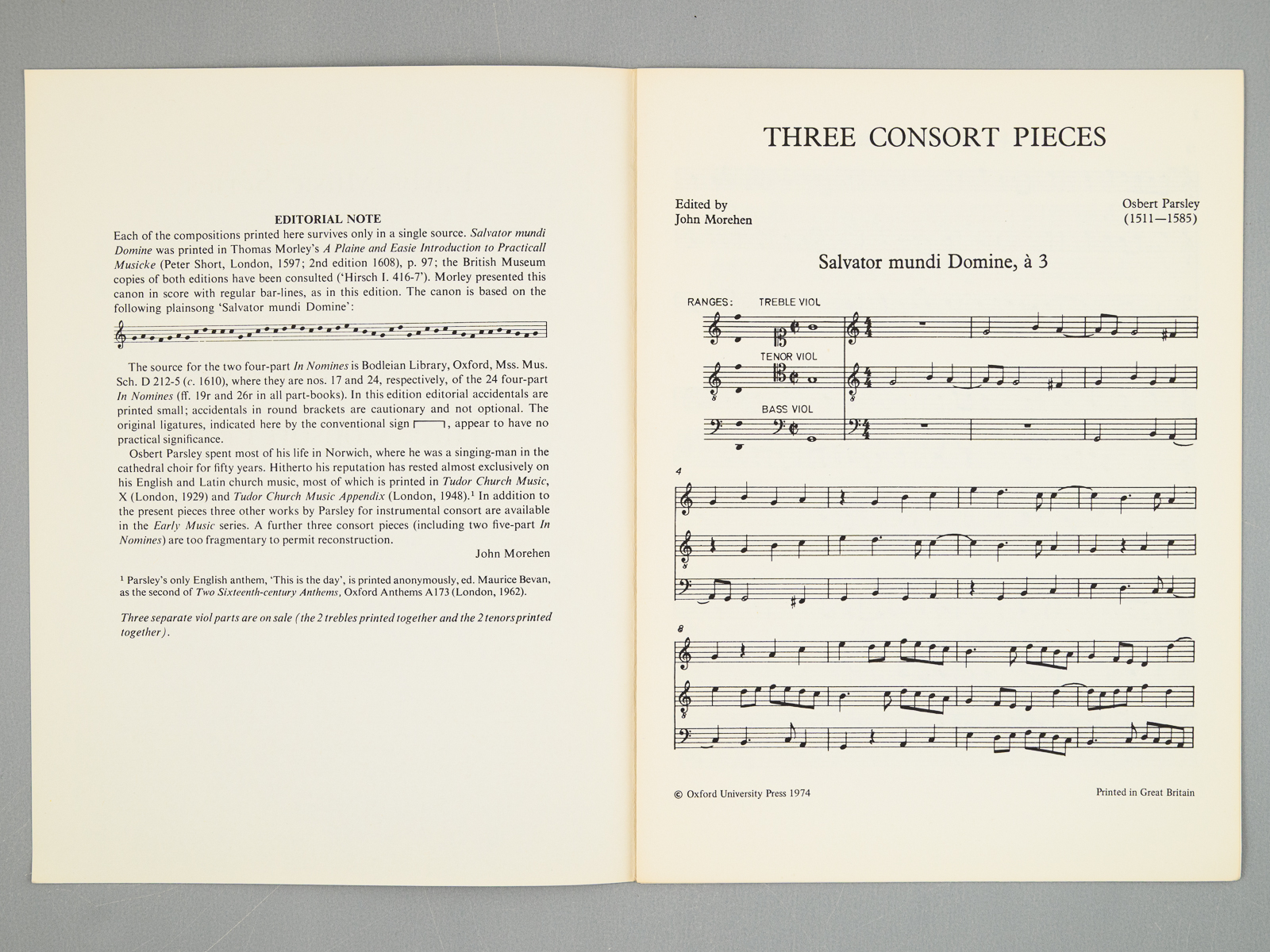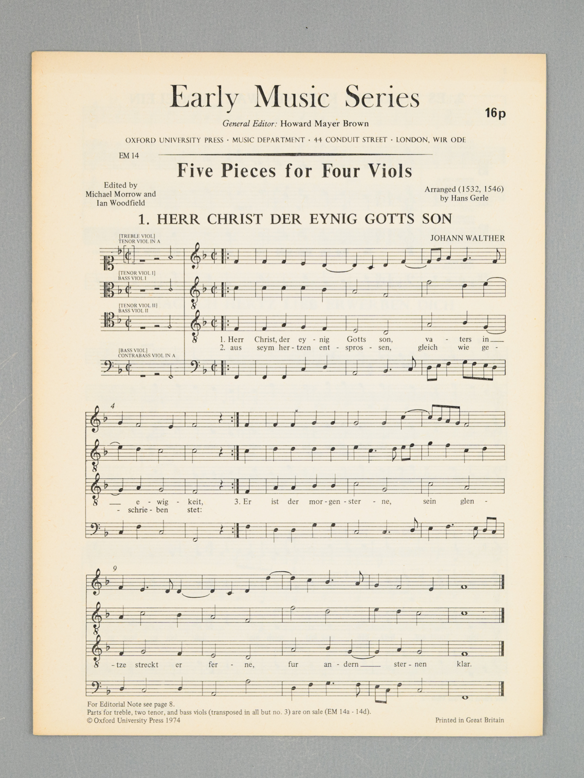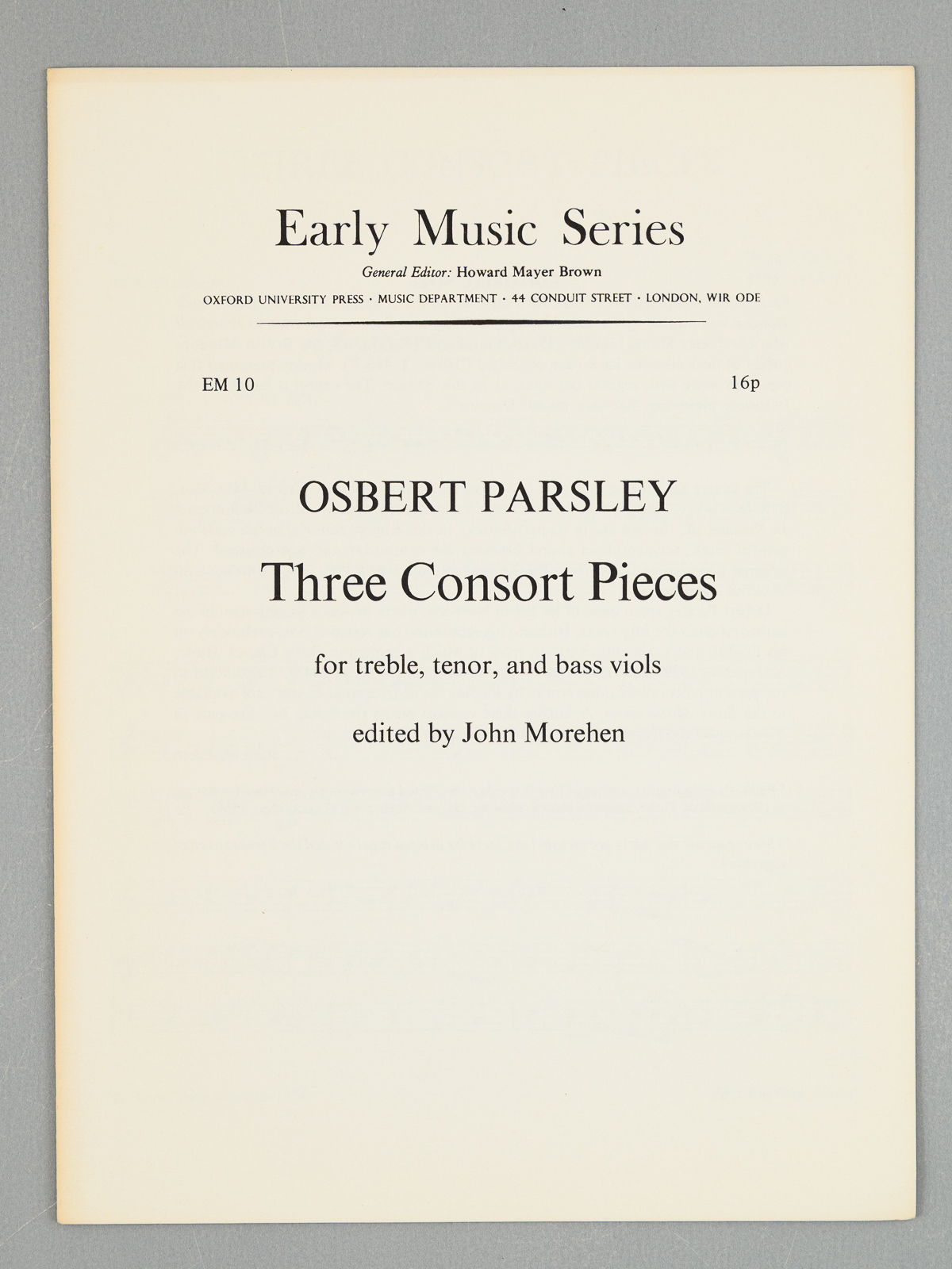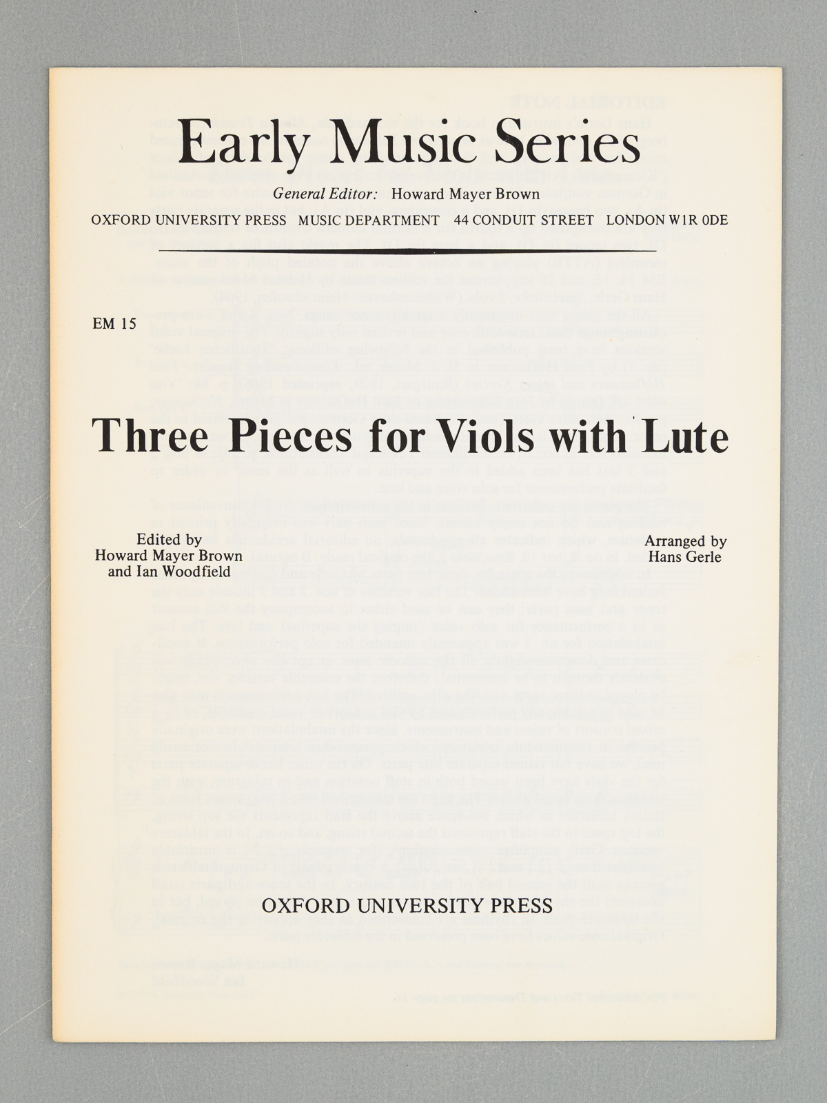 18 tablatures, Oxford University Press, London, 1974, 1975, 1976, 1977. List of title : Si je fais bien ou mal aussi (EM 2a) ; Mon Mari m'a diffamée (EM 3a) ; Canzona 'La Maggia' (EM 4a) ; Canzona in G (EM 5a) ; Canzona 'La Girella' (EM 6a); Glora (by Leonel Power EM 9); Five pieces for four viols (EM 14); Three consort pieces (Osbert Parsley EM 10); Three pieces for viols with Lute (EM 15); Kyrie and Glorie for Lady Mass (EM 17) ; Ecco ch'io lass'il core (EM 21 + EM 21a) ; Three Strambotti (EM 25) ; Canzone Prima (EM 26); Two Sixteenth-Century Italian Dances (EM 27); Two Mid-15th-cenury English songs (EM 28) ; A 12th-century French troubadour's song (EM 29) ; Two piees for Viol Consort a 5 (EM 30) ; Seur toute creature humeinne (EM 31)