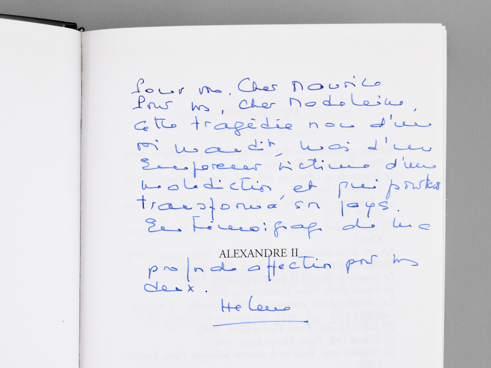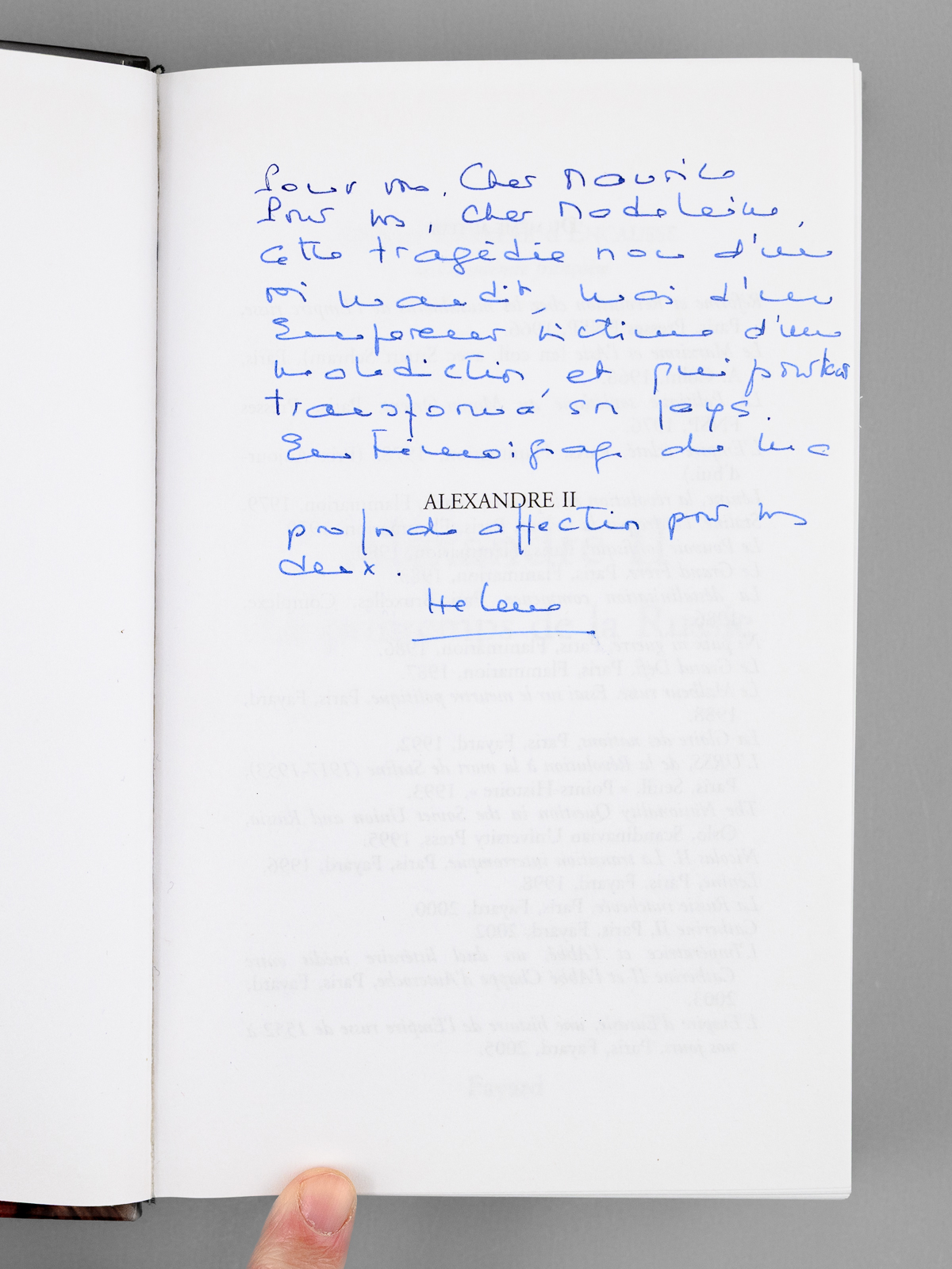 Commentaire : Superbe dédicace de l'auteur à l'académicien Maurice Druon (1918-2009), qui était lui-même d'ascendance russe (il était neveu de Joseph Kessel) : 'Pour vous Cher Maurice, pour vous Chère Madeleine, cette tragédie non d'un roi maudit mais d'un Empereur victime d'une malédiction, et qui pourtant transforma son pays. En témoignage de ma profonde affection pour vous deux.' Maurice Druon, auteur notamment de la célèbre saga historique des Rois maudits, fut élu à l'Académie Française en 1968, et il en devint le Secrétaire Perpétuel, de 1985 à 1999. Hélène Carrère d'Encausse, élue à l'Académie en 1990, remplaça Maurice Druon à la tête de cette institution. Bon état pour cet exemplaire d'une provenance exceptionnelle.
