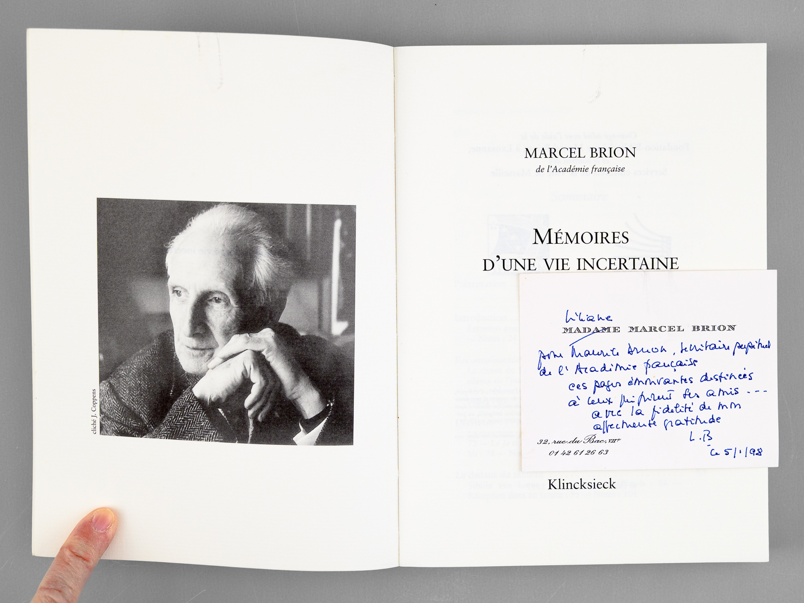 3 vol. in-8 br, Klincksieck, 1997-2000-2002 Commentaire : Le premier volume est accompagné d'une carte autographe signée de Madame Liliane Marcel Brion (Liliane Brion-Guerry) 'pour Maurice Druon, Secrétaire Perpétuel de l'Académie Française, ces pages émouvantes destinées à ceux qui furent ses amis... Avec la fidélité de mon affectueuse gratitude'. Bon ensemble (couv. lég. frottée) pour cet ensemble de provenance prestigieuse : de la bibliothèque du grand écrivain Maurice Druon, Secrétaire Perpétuel de l'Académie Française de 1985 à 1999.