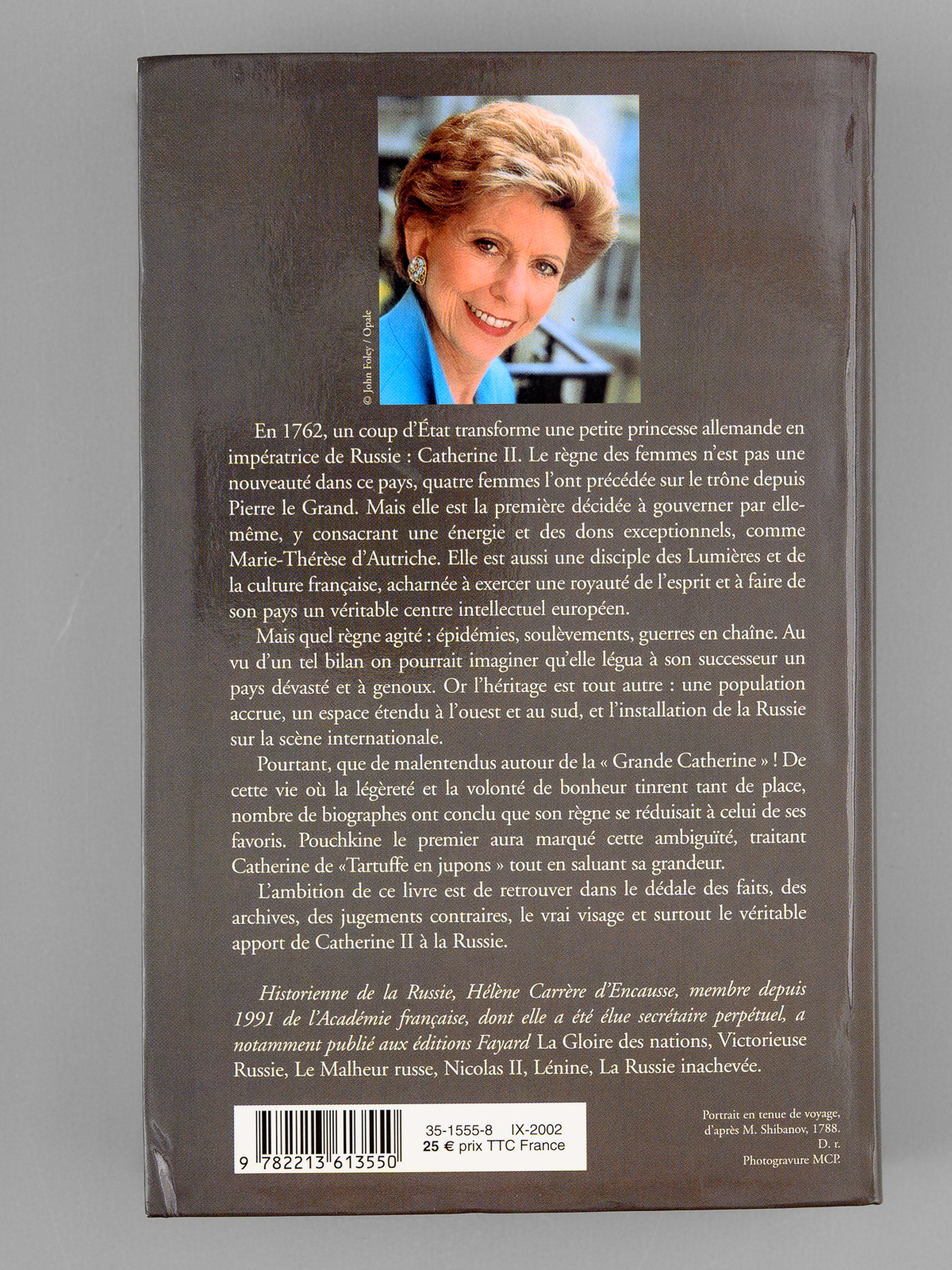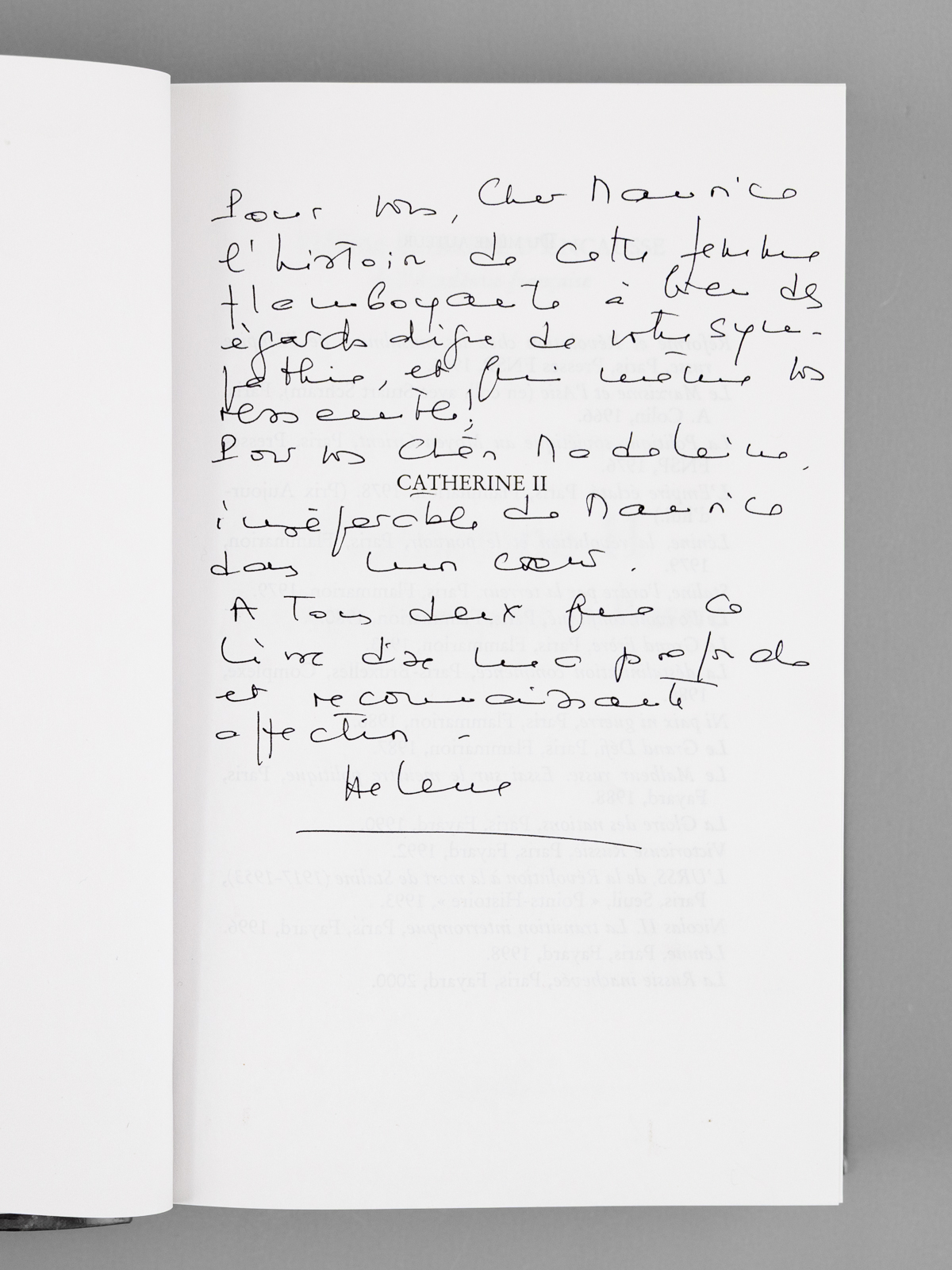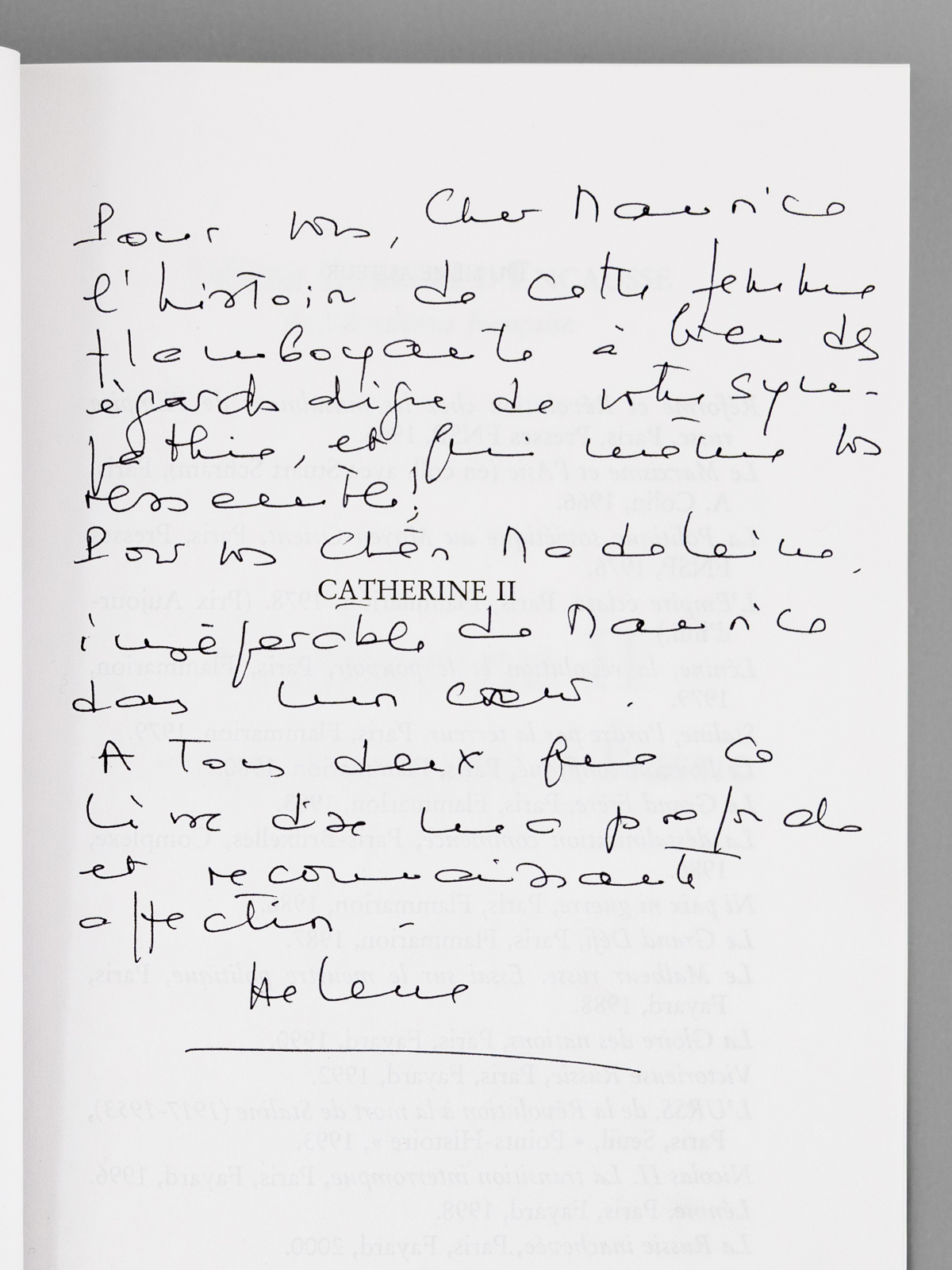 Envoi ms. de l'auteur, 1 vol. in-8 cartonnage éditeur, Fayard, 2002, 656 pp. Commentaire : Superbe dédicace de l'auteur à l'académicien Maurice Druon (1918-2009), qui était lui-même d'ascendance russe (il était neveu de Joseph Kessel), et à son épouse : 'Pour vous Cher Maurice, l'histoire de cette femme flamboyante à bien des égards digne de votre sympathie, et qui même vous ressemble. Pour vous Chère Madeleine, inséparable de Maurice, dans un même coeur. Atous deux, que ce livre dise ma profonde et reconnaissante affection.' Maurice Druon, auteur notamment de la célèbre saga historique des Rois maudits, fut élu à l'Académie Française en 1968, et il en devint le Secrétaire Perpétuel, de 1985 à 1999. Hélène Carrère d'Encausse, élue à l'Académie en 1990, remplaça Maurice Druon à la tête de cette institution. Bon état pour cet exemplaire d'une provenance exceptionnelle.