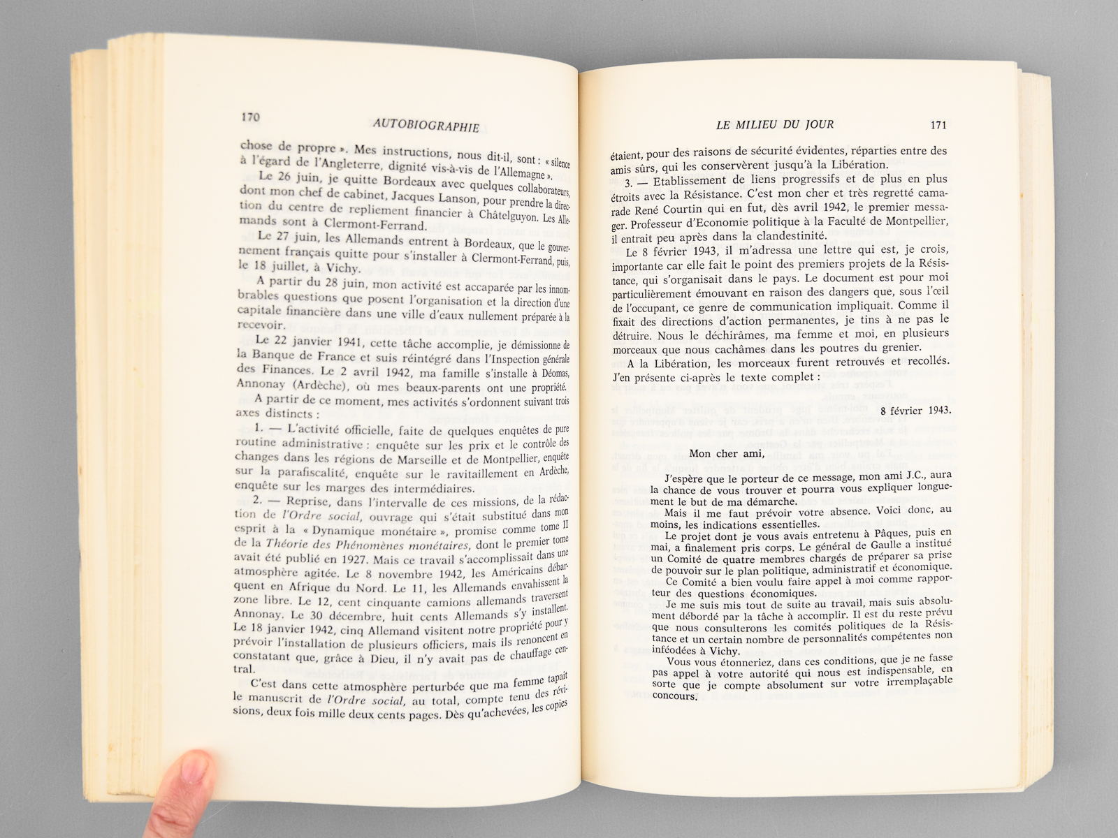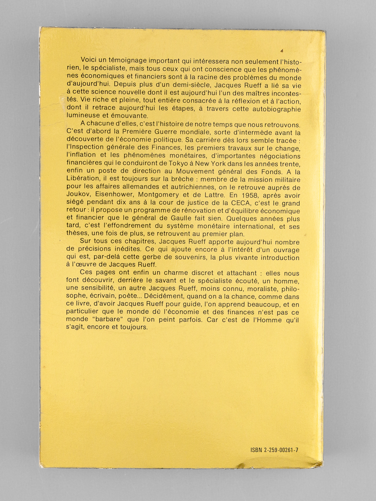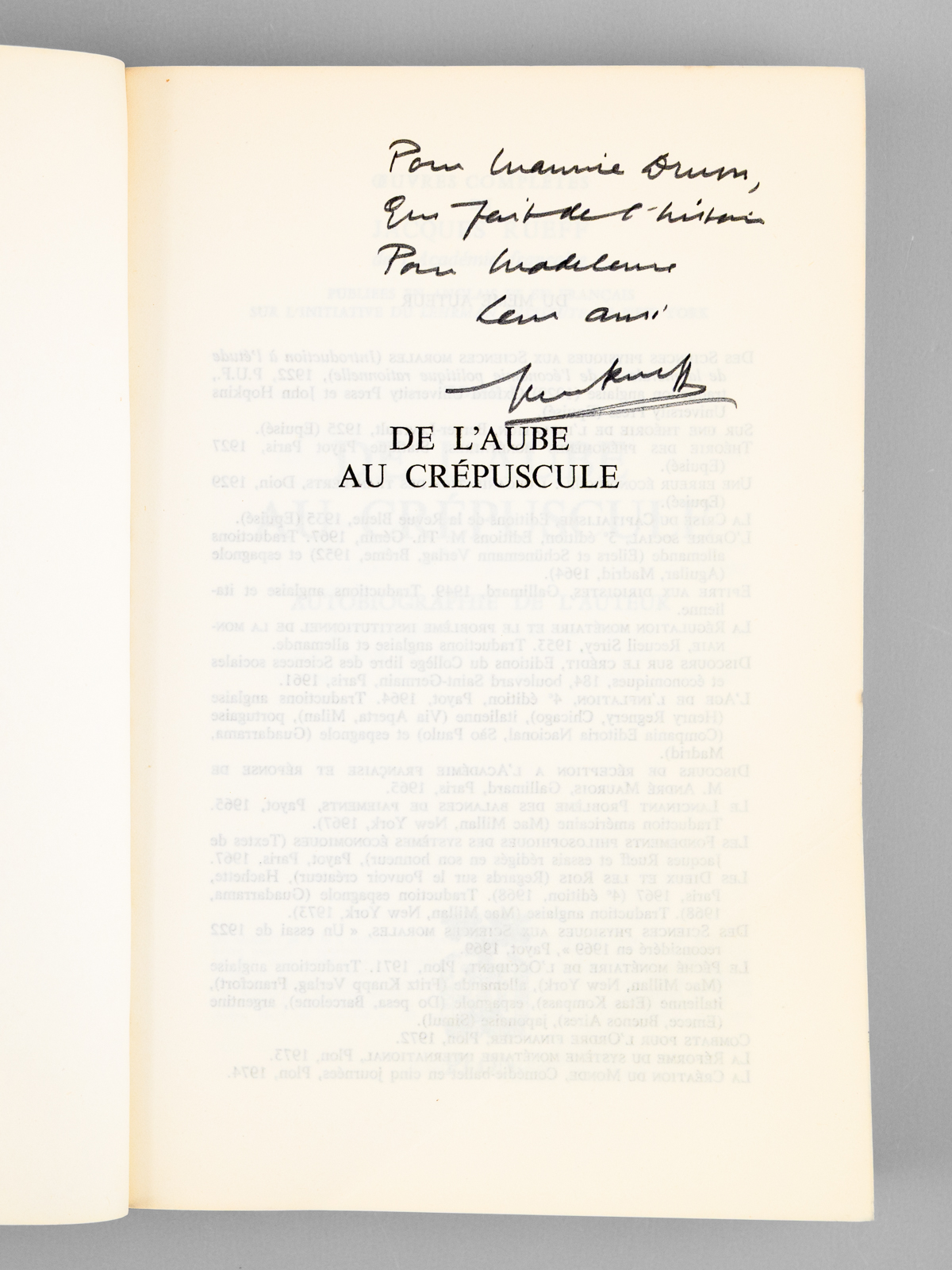 Envoi ms. de l'auteur, 1 vol. in-8 br., Hachette, Paris, 1977, 443 pp. Commentaire : Avec un bel envoi : 'Pour Maurice Druon, qui fait de l'histoire. Pour Madeleine, leur ami, Jacques Rueff'. Les dédicataires étaient Maurice Druon (1918-2009) et son épouse. Maurice Druon, qui était neveu de Joseph Kessel, fut résistant, écrivain auteur notamment de la saga historique des Rois maudits, et homme politique. Elu à l'Académie Française en 1968, il en devint le Secrétaire Perpétuel en 1985. Jacques Rueff, quant à lui, avait été élu à l'Académie en 1964. Bon état pour cet exemplaire d'une origine prestigieuse.