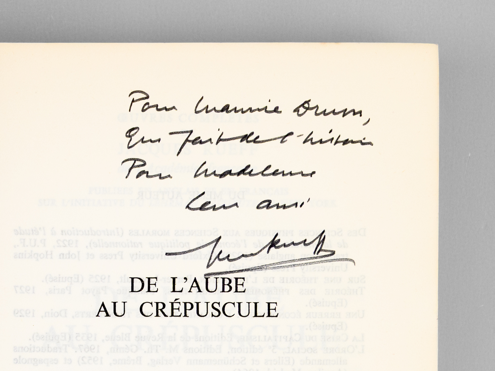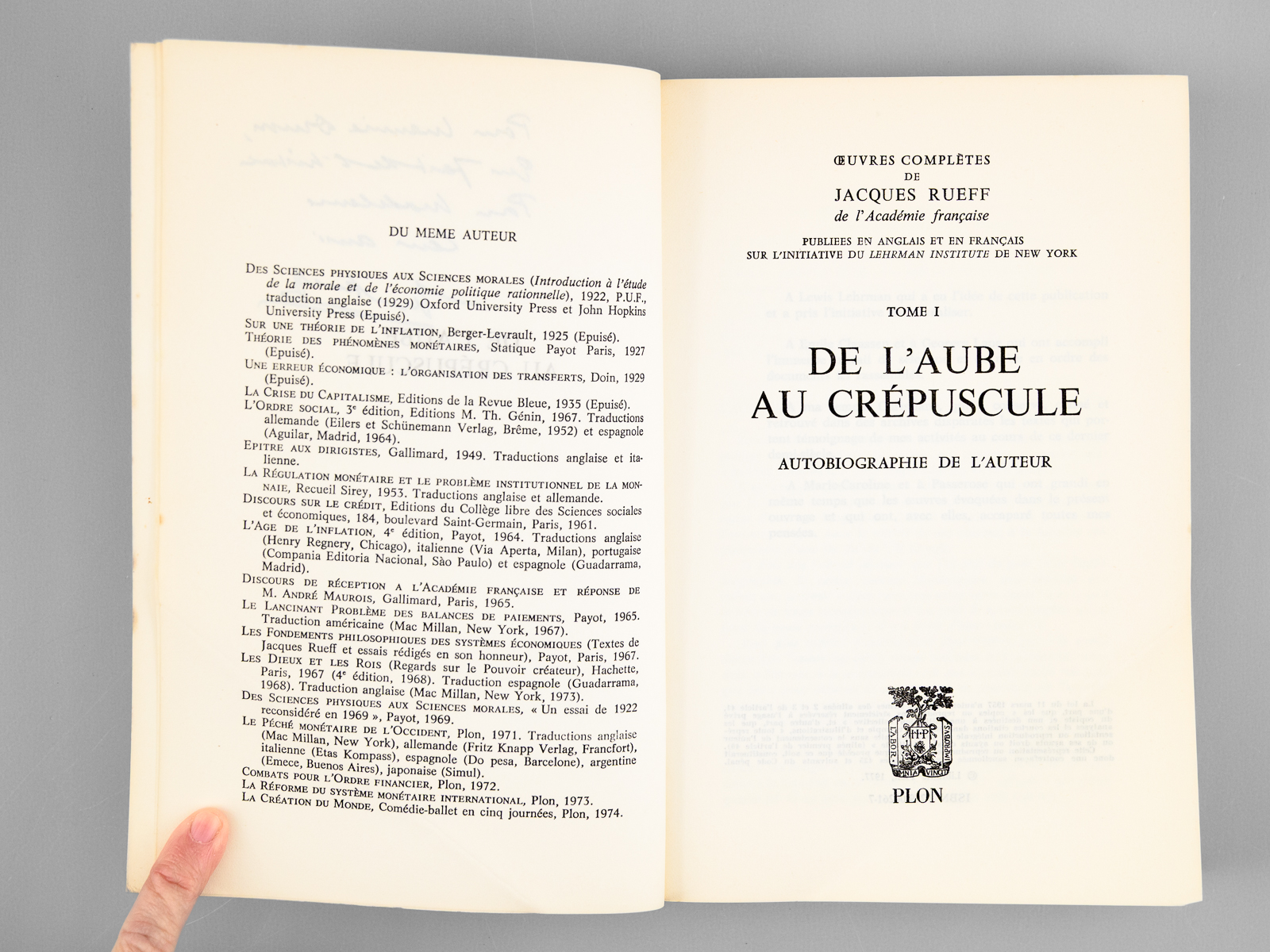 De l'Aube au Crépuscule. Autobiographie de l'auteur. Oeuvres complètes T.1 [ Livre dédicacé par l'auteur ] - Auteur: RUEFF, Jacques (1896-1978) - Année d'édition: 1977