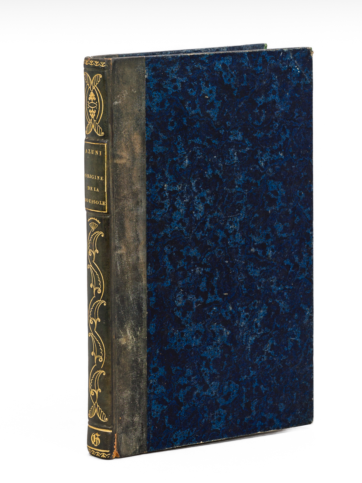 Par Mr. D. A. Azuni, Seconde édition avec des Additions, suivie d'une Lettre du même Auteur, en réponse au Mémoire de M. Hager, publié dernièrement à Pavie, 1 vol. in-8 reliure de l'époque demi-basane verte, dos richement orné en long, toutes tranches dorées, Chez H. Nicolle, Paris, 1809, XVI-269 pp. Commentaire : Une annotation manuscrite ancienne en garde précise : 'donné par l'auteur le 9 juin 1810' et cite une longue note tirée d'un article relatif à l'ouvrage. L'auteur, italien, soutient la thèse de l'invention de la boussole par les français. Bon état pour cet exemplaire bien relié (légers frott. en mors, bel exemplaire bien relié par ailleurs).
