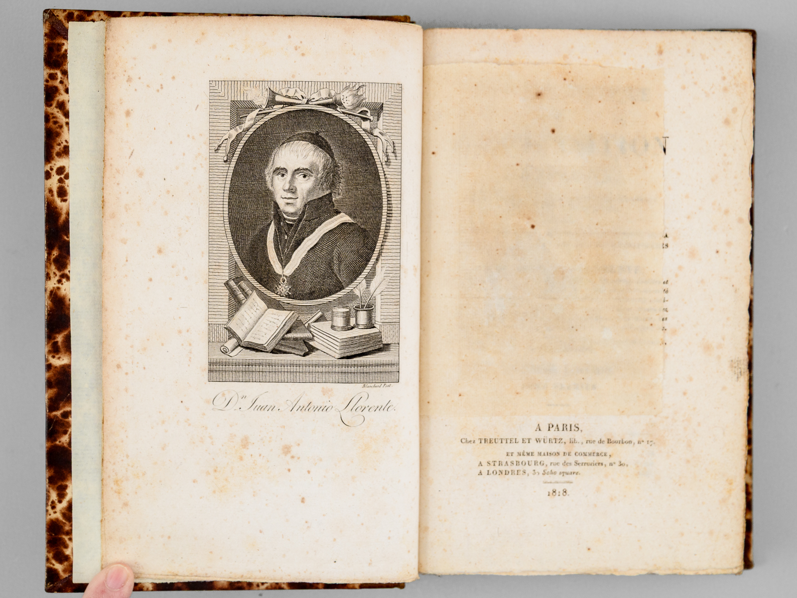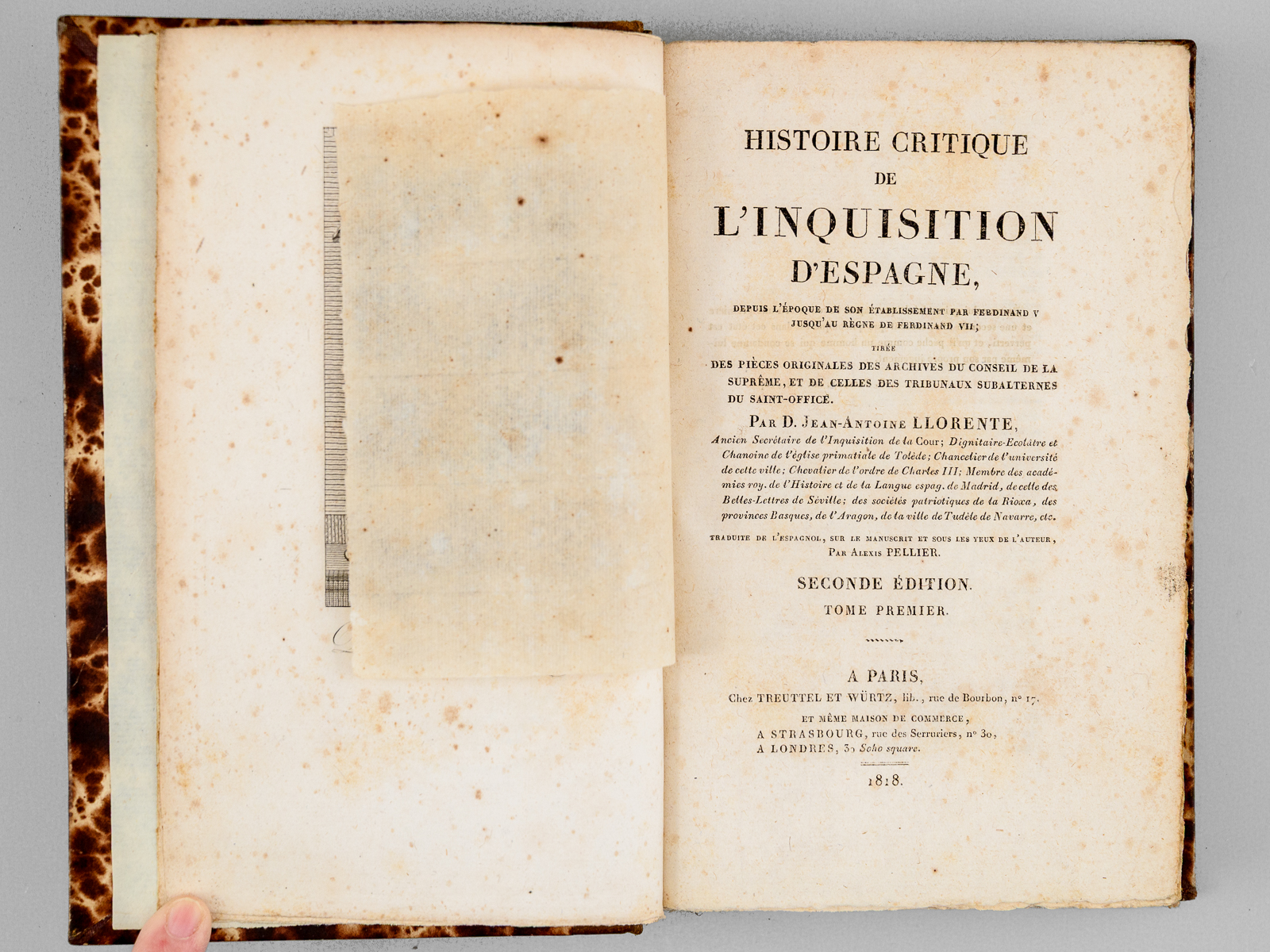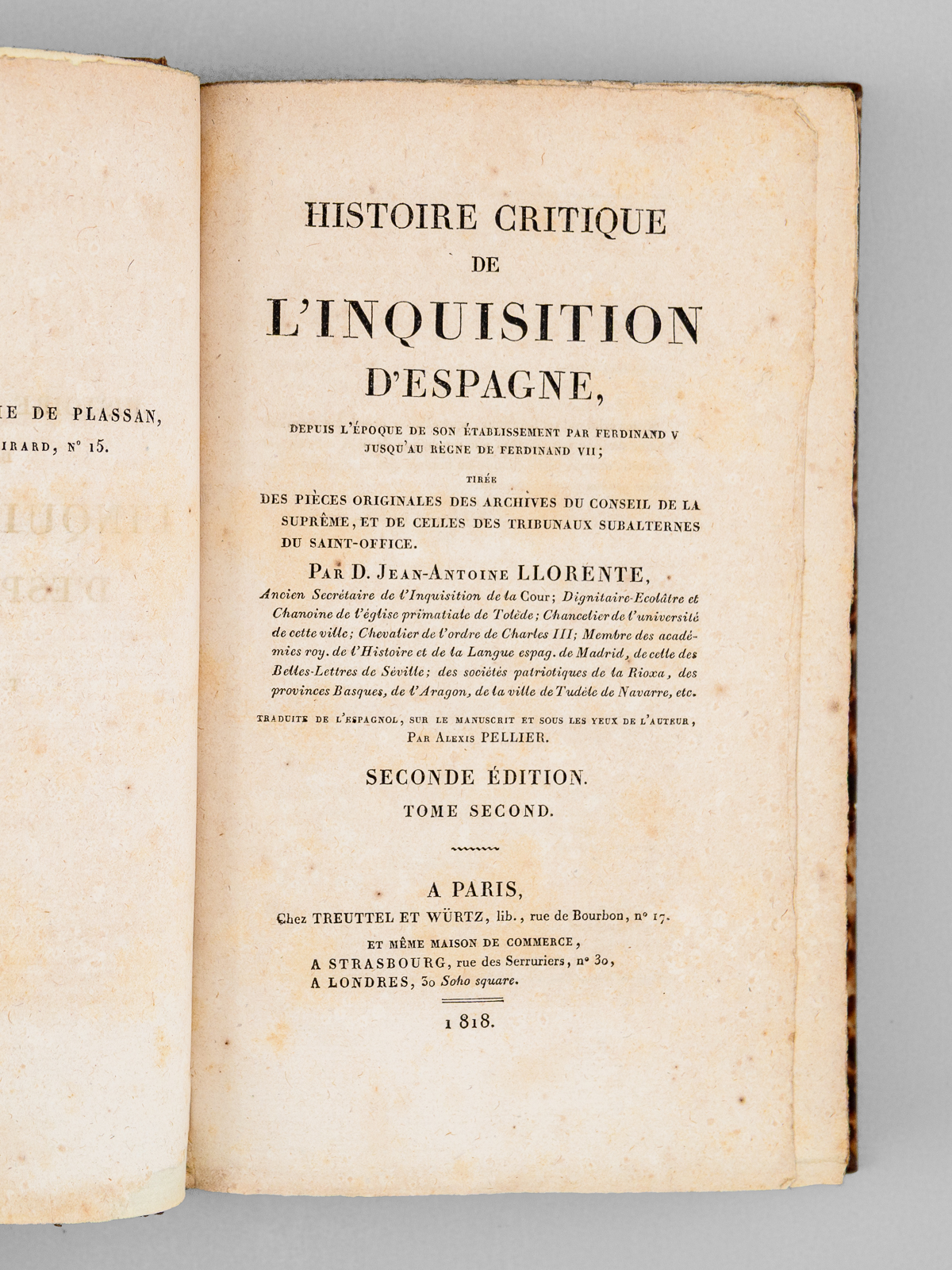 Traduite de l'espagnol sur le manuscrit et sous les yeux de l'auteur par Alexis Pellier, Seconde Édition, 4 vol. in-8 reliure demi-chagrin brun, dos à 4 nerfs, Chez Treuttel et Würtz, Paris, 1818, L-493 ; 553 ; 497 ; 500 pp. Rappel du titre complet : Histoire critique de l'Inquisition d'Espagne (4 Tomes - Complet) Depuis l'époque de son établissement par Ferdinand V jusqu'au règne de Ferdinand VII, tirée des pièces originales des archives du Conseil de la Suprême, et de celles des tribunaux subalternes du Saint-Office Commentaire : Si les historiens ont depuis très grandement réduits le nombre de victimes alors imputées à l'Inquisition espagnole par le Père Llorente, son 'histoire critique de l'Inquisition' connut une grande diffusion dans les milieux libéraux au lendemain de la Restauration, et son influence sur les esprits ne saurait être mésestimée. Bon état (dos un peu frotté avec étiquette de cote au dos du tome premier, qq. rouss.).
