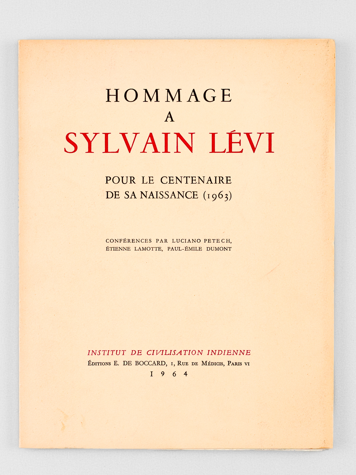 1 vol. grand in-8 br., Institut de Civilisation Indienne, Editions E. de Boccard, Paris, 1964, 69 pp. Rappel d titre complet : Hommage à Sylvain Lévi pour le centenaire de sa naissance (1963) [ Contient : ] Stern : Sylvain Lévi, l'homme - Petech : Les études d'histoire népalaise après Sylvain Lévi - Renou : L'oeuvre de Sylvain Lévi - Lamotte : L'Oeuvre bouddhique de Sylvain Lévi - Filliozat : Diversité de l'oeuvre de Sylvain Lévi - Dumont : Le primitivisme dans l'Inde ancienne