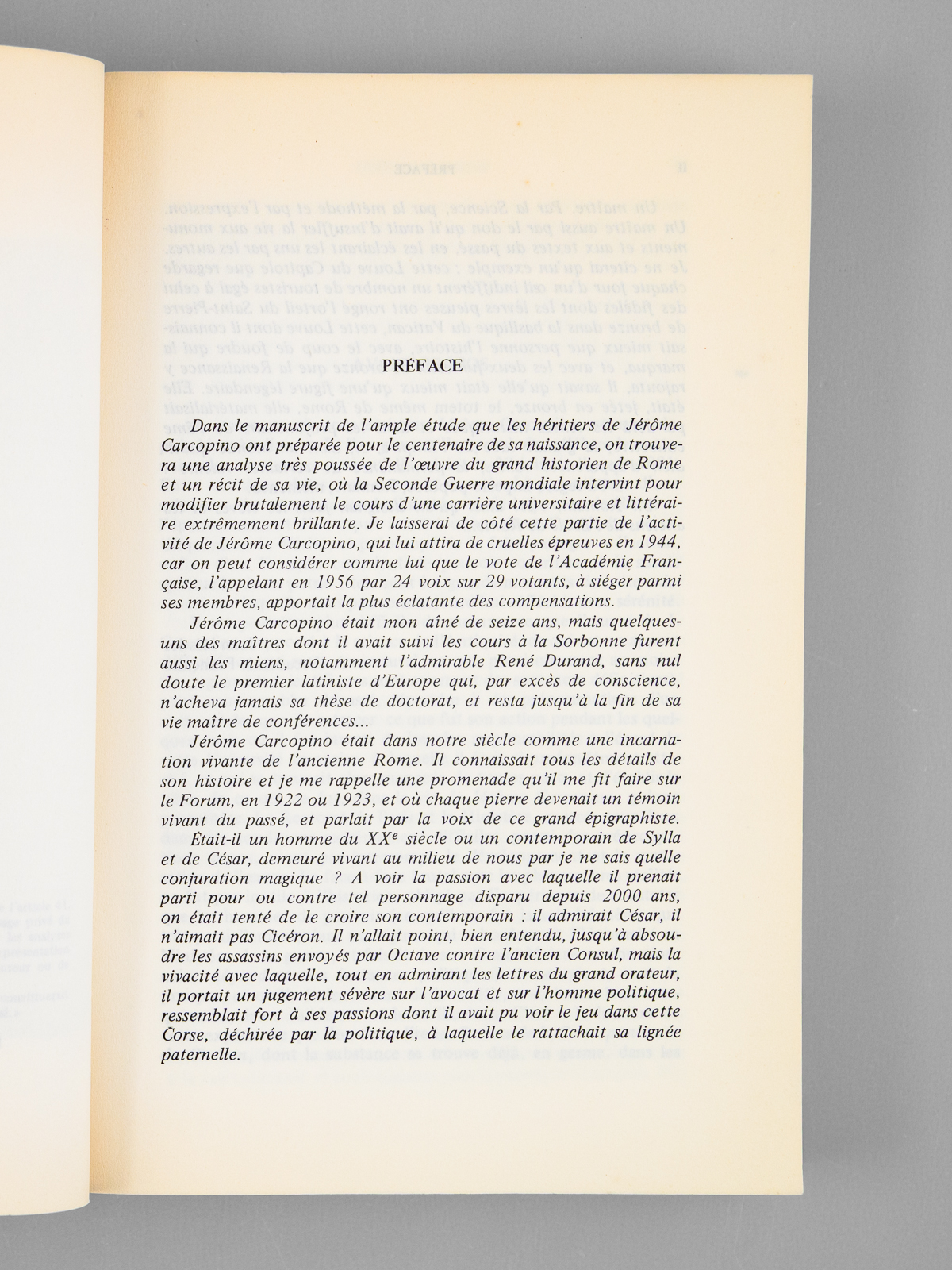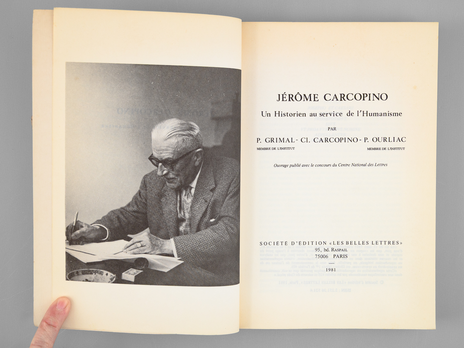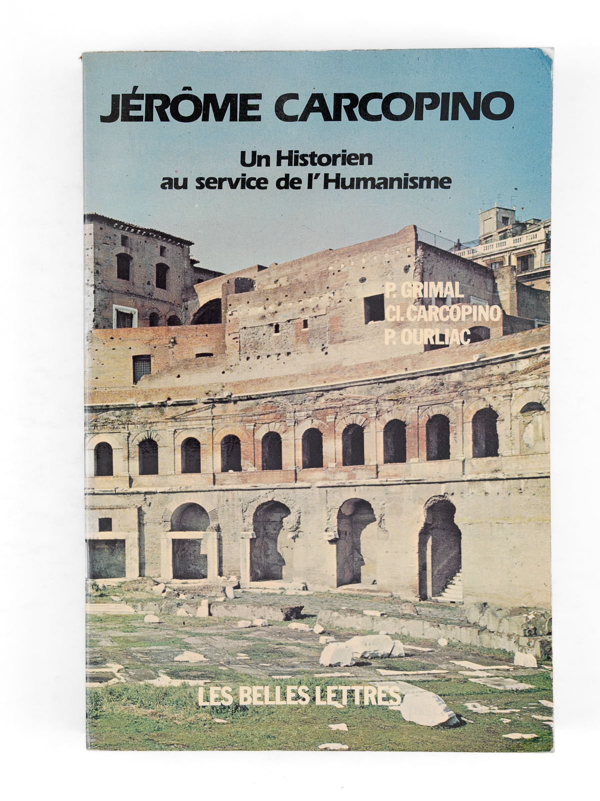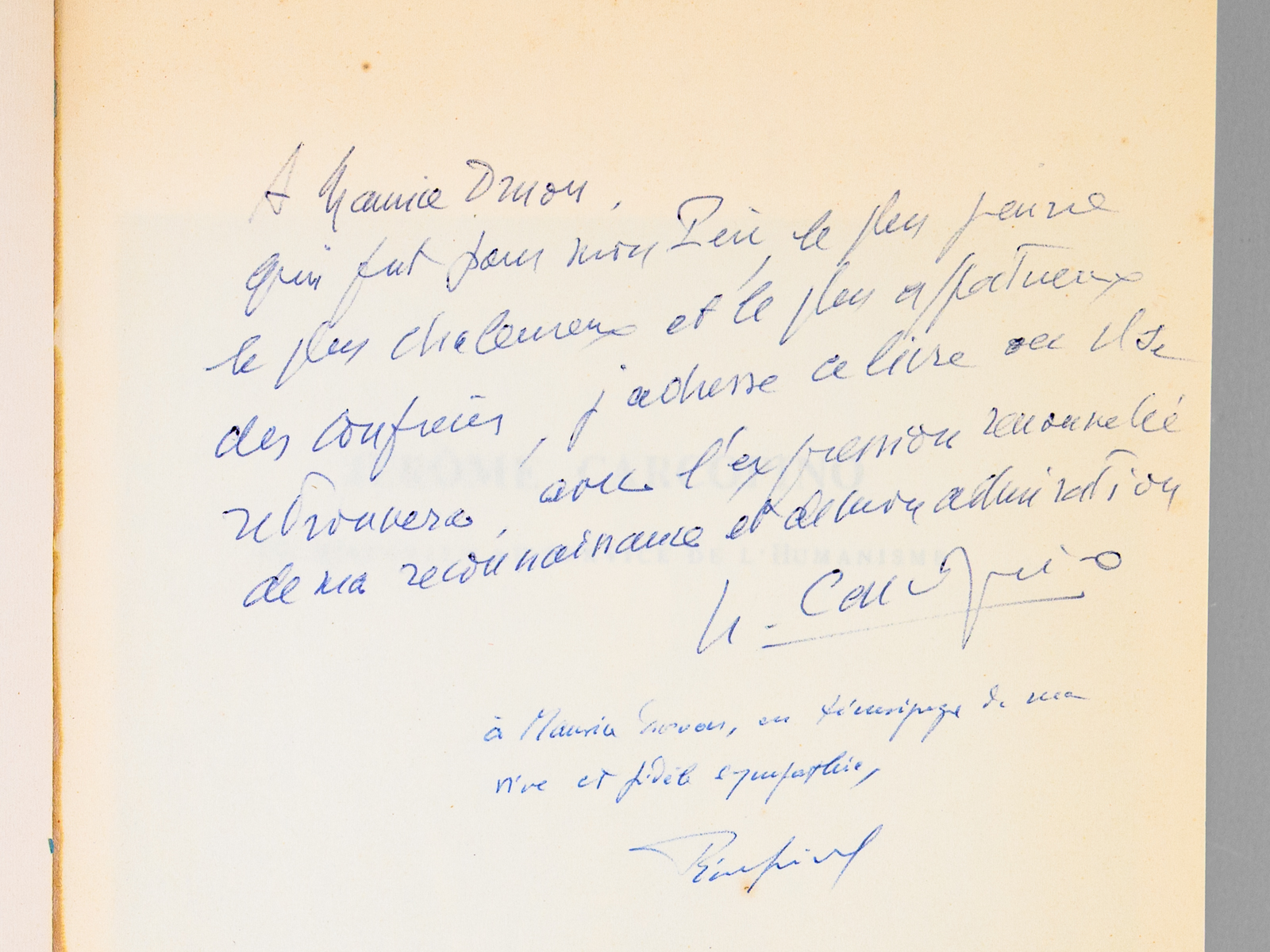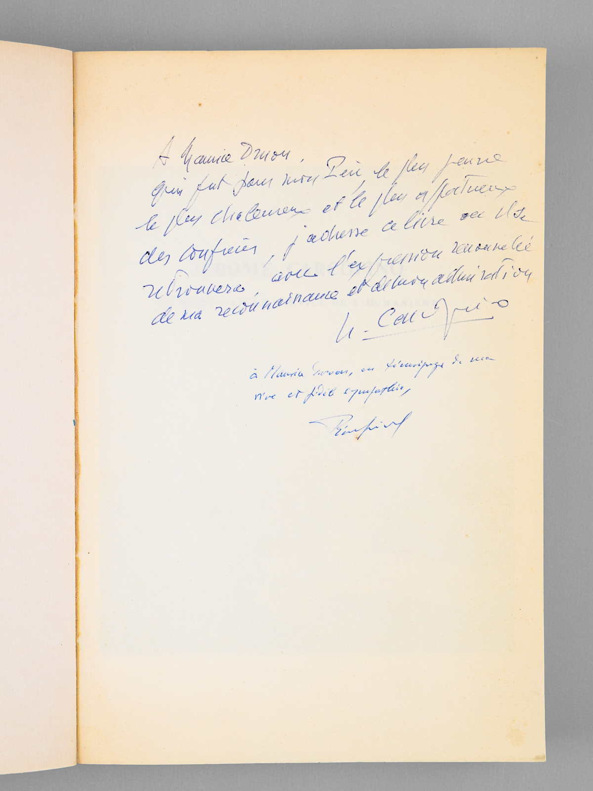 1 vol. in-8 br., Société d'Edition 'Les Belles Lettres', Paris, 1981, 349 pp. Commentaire : Bel envoi de Claude Carcopino 'à Maurice Druon, qui fut pour mon Père le plus jeune, le plus chaleureux et le plus affectueux des confrères, j'adresse ce livre où il se retrouvera, avec l'expression renouvelée de ma reconnaissance et de mon admiration' et de Pierre Grimal 'à Maurice Druon, en témoignage de ma vive et fidèle sympathie'. Elu à l'Académie Française en 1956, Jérôme Carcopino y accueillera en 1966 Maurice Druon, futur Secrétaire Perpétuel de l'auguste Académie. Bon état