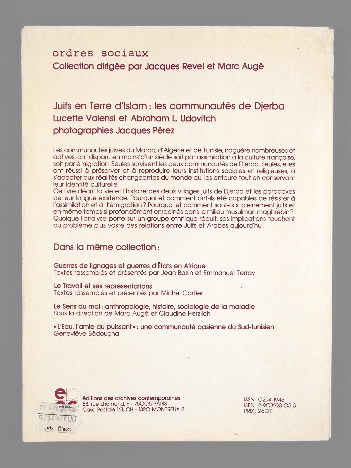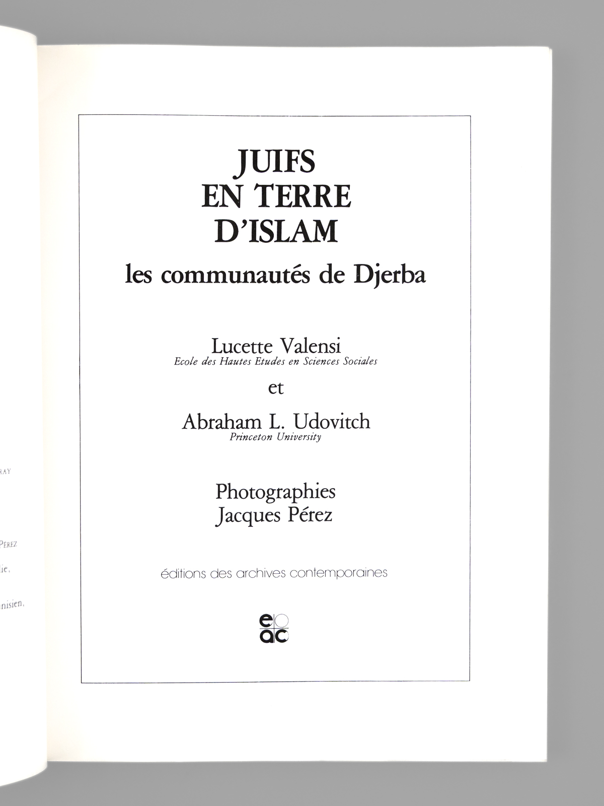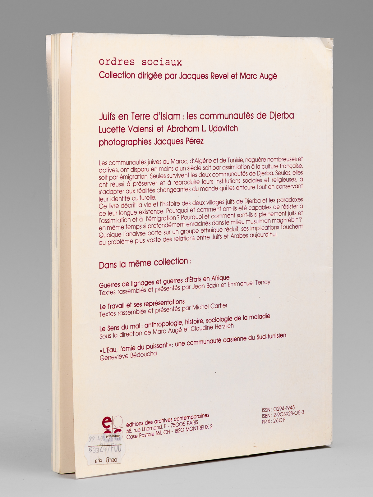 1 vol. in-4 br., photos couleurs ou noir et blanc, coll. Ordres Sociaux, EAC Editions des Archives Contemporaines, 1984, 182 pp. Commentaire : Bon état pour ce livre qui décrit la vie et l'histoire des deux villages juifs de Djerba, en Tunisie. Il montre en particulier comment ces communautés ont été capables de résister à l'assimilation, dans un environnement entièrement musulman.