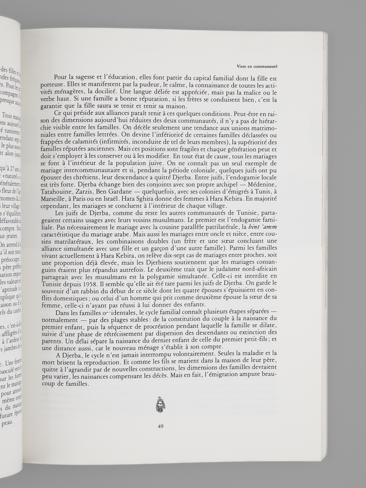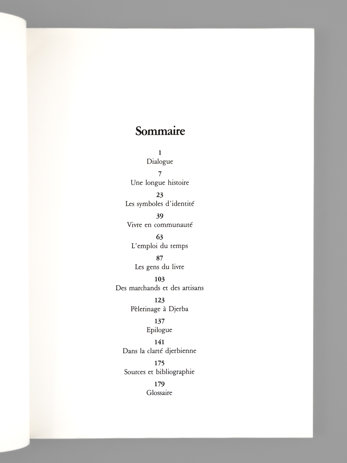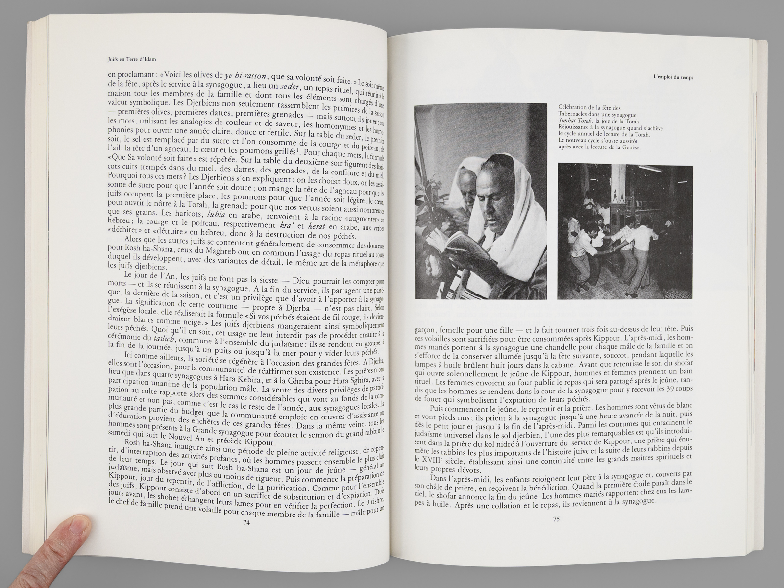 1 vol. in-4 br., photos couleurs ou noir et blanc, coll. Ordres Sociaux, EAC Editions des Archives Contemporaines, 1984, 182 pp. Commentaire : Bon état pour ce livre qui décrit la vie et l'histoire des deux villages juifs de Djerba, en Tunisie. Il montre en particulier comment ces communautés ont été capables de résister à l'assimilation, dans un environnement entièrement musulman.