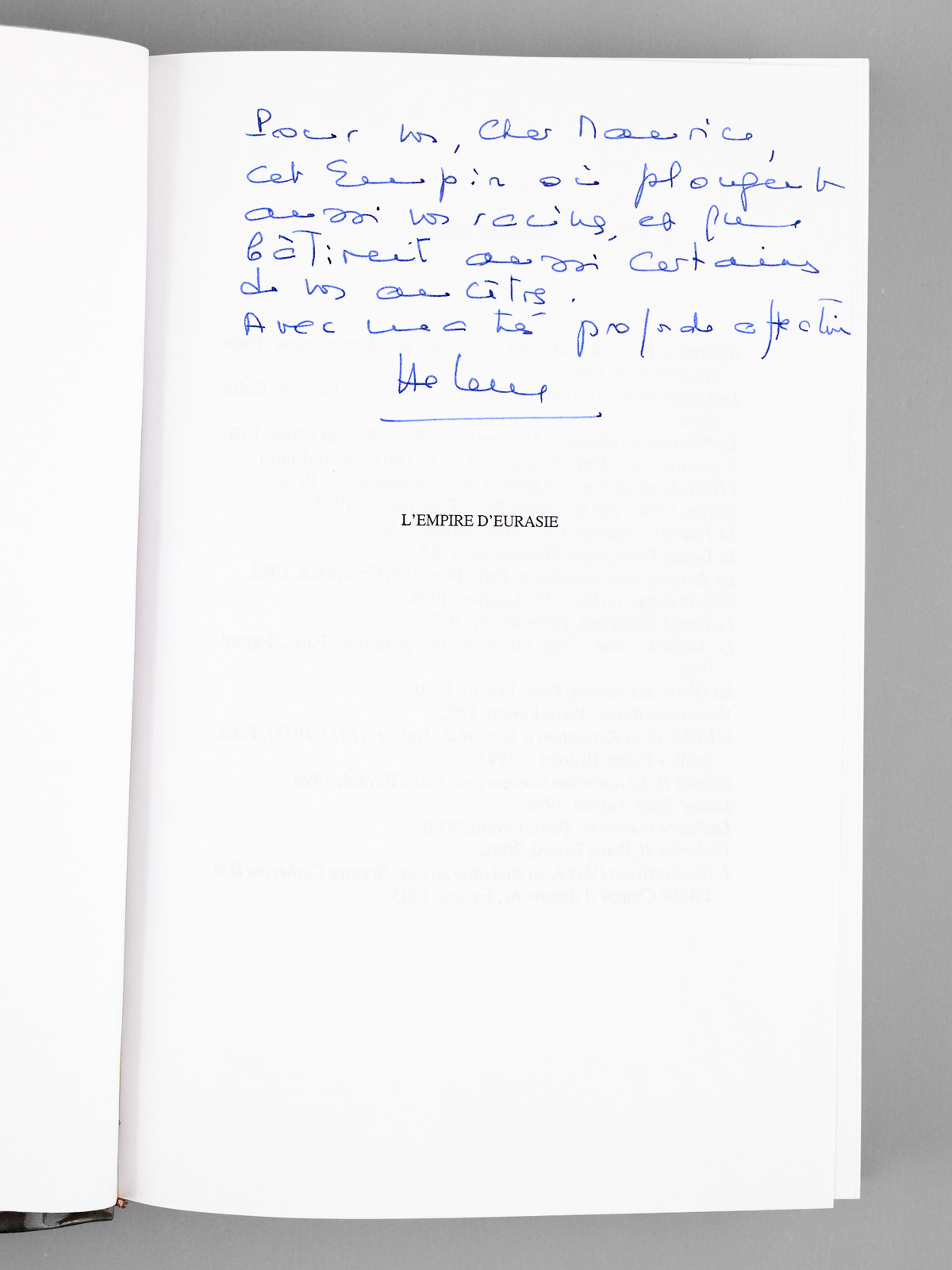 Commentaire : Dédicace de l'auteur à l'académicien Maurice Druon (1918-2009), qui était lui-même d'ascendance russe (il était neveu de Joseph Kessel) : 'Pour vous, Cher Maurice, cet Empire où plongent aussi vos racines, et que bâtirent aussi certains de vos ancêtres. Avec ma très profonde affection.' Maurice Druon, auteur notamment de la célèbre saga historique des Rois maudits, fut élu à l'Académie Française en 1968, et il en devint le Secrétaire Perpétuel, de 1985 à 1999. Hélène Carrère d'Encausse, élue à l'Académie en 1990, remplaça Maurice Druon à la tête de cette institution. Bon état pour cet exemplaire d'une provenance exceptionnelle.