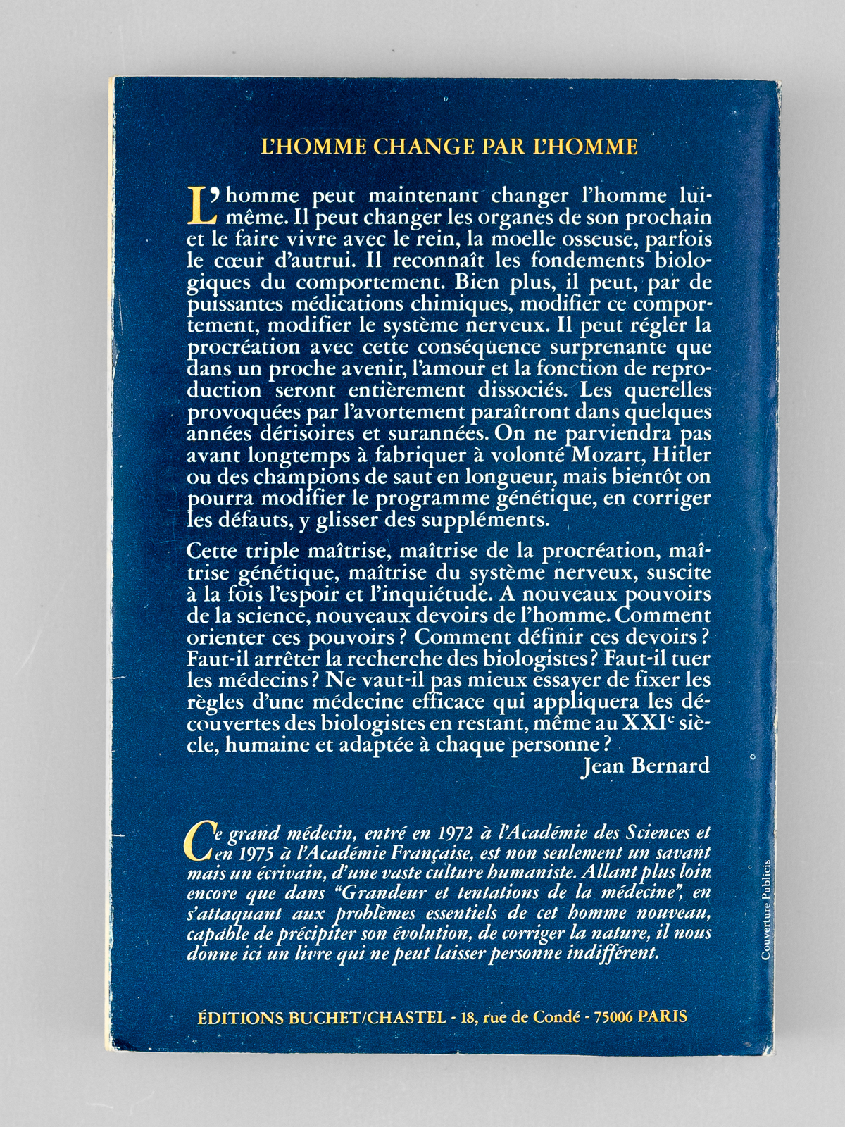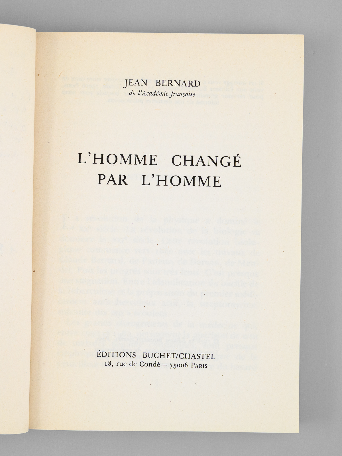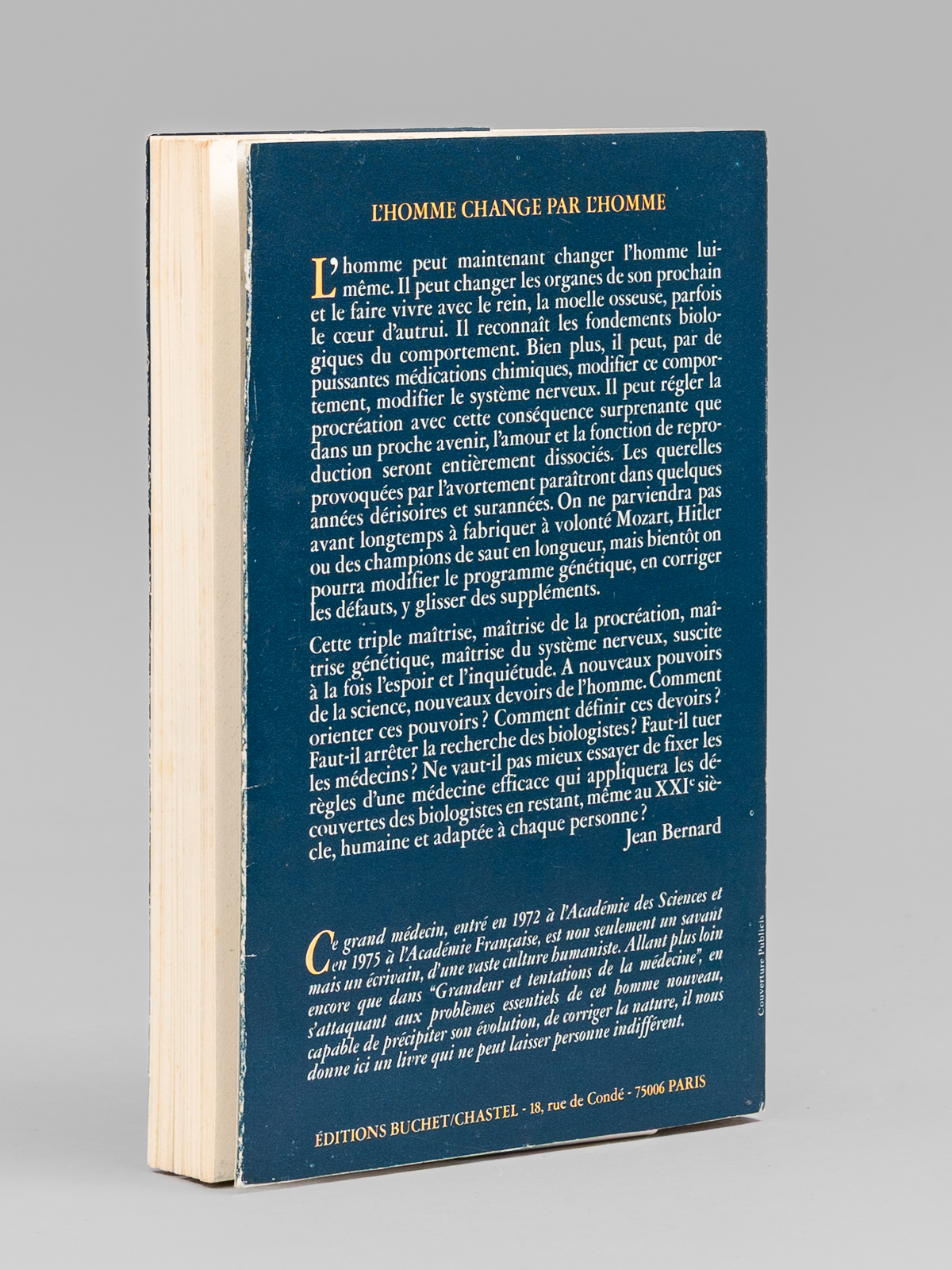Envoi ms. de l'auteur, 1 vol. in-8 br., Buchet Chastel, Paris, 1976, 230 pp. Commentaire : Envoi de l'auteur à Maurice Druon et à son épouse: 'Pour Madame Maurice Druon, en très respectueux hommages pour monsieur le Ministre, Maurice Druon, dont le généreux accueil m'avait profondément touché. Avec mon admirative gratitude. Jean Bernard'. L'auteur et le dédicataire étaient tous deux académiciens. Maurice Druon (1918-2009), auteur notamment de la célèbre saga historique des Rois maudits, fut élu à l'Académie Française en 1968. Il en devint le Secrétaire Perpétuel, de 1985 à 1999. L'auteur, quant à lui, venait d'être élu à l'Académie Française, en 1975, au fauteuil de Marcel Pagnol. Le professeur Jean Bernard, éminent hématologue et oncologue, présida le Comité National d'Ethique de 1983 à 1993. Etat très satisfaisant (lég. rouss. sur tranches, bon état par ailleurs) pour cette exemplaire d'une origine prestigieuse.