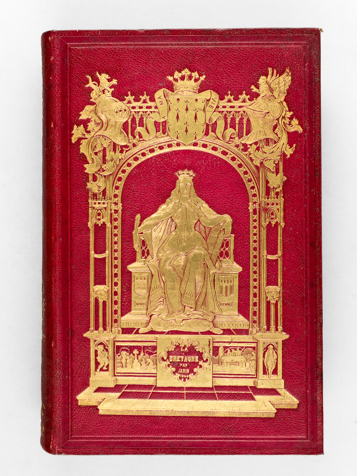 Illustrée par MM. Hte Bellangé, Gigoux, Gudin, Isabey, Morel-Fatio, J. Noël, A. Rouargue, Saint-Germain, Fortin et Daubigny, 1 vol. grand in-8 reliure éditeur plein chagrin rouge, plats et dos orné de fers spéciaux (anges et blasons en dos, Bretagne trônant en plat), toutes tranches dorées, couvertures conservées, Ernest Bourdin, Paris, s.d. [ 1844 ], 4 ff., 628 pp. avec un titre frontispice, 19 figures hors texte gravées sur acier, 4 planches de blason et 8 planches de costumes coloriées, une carte de la Bretagne hors texte