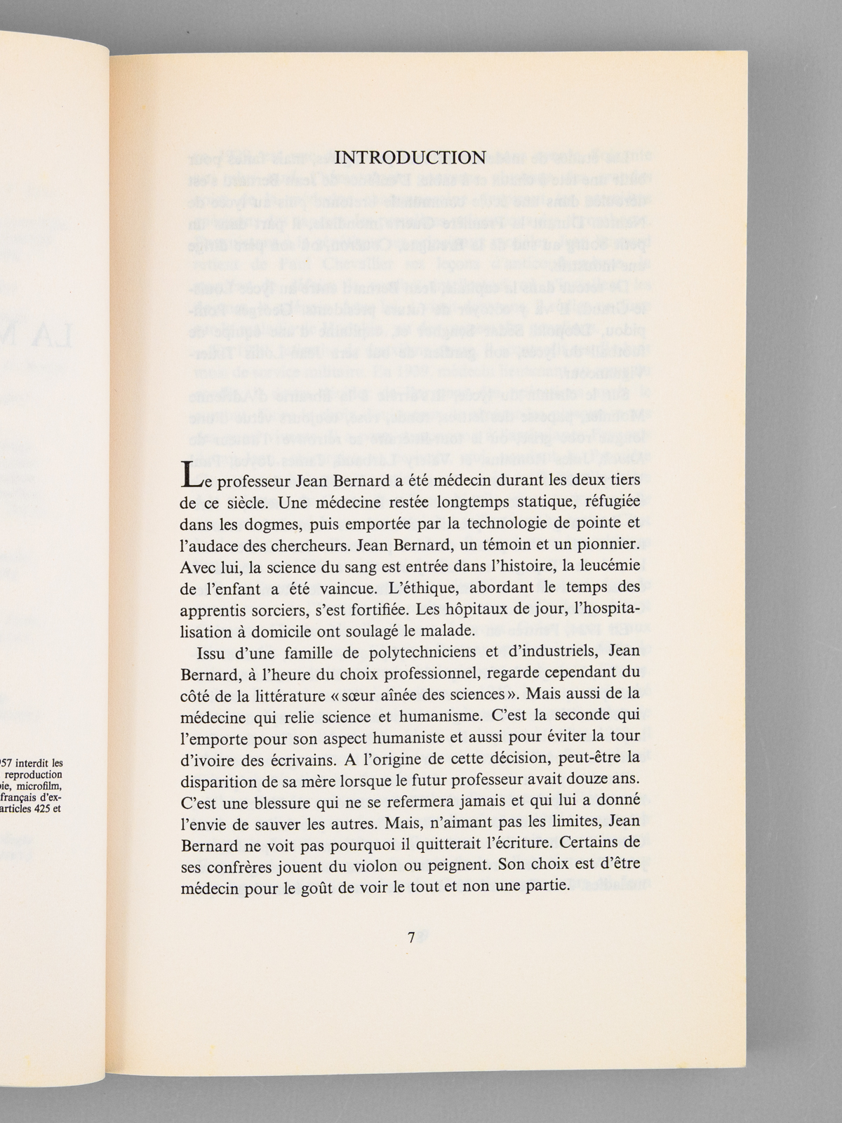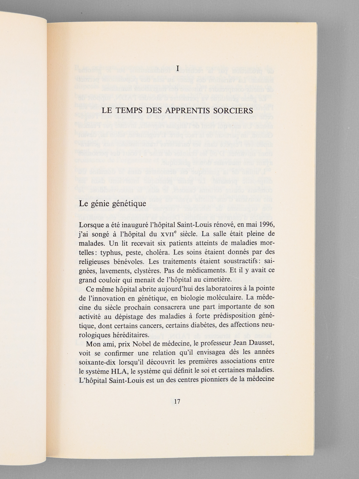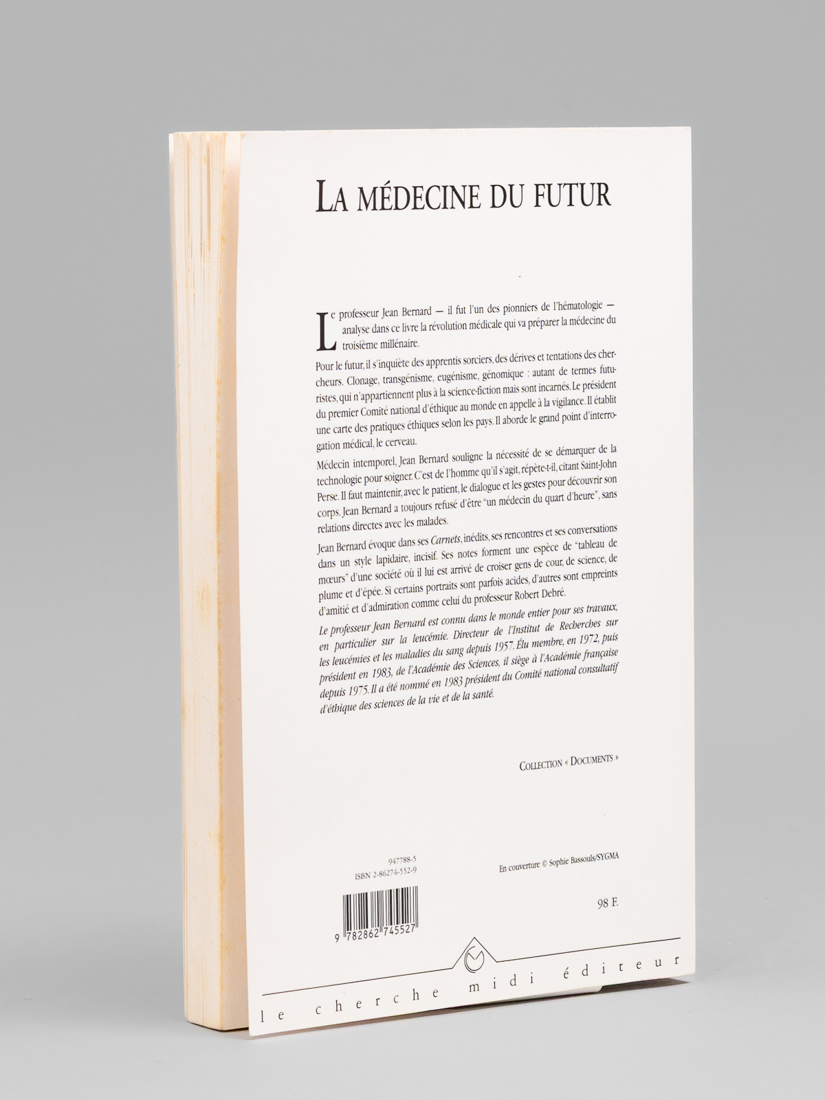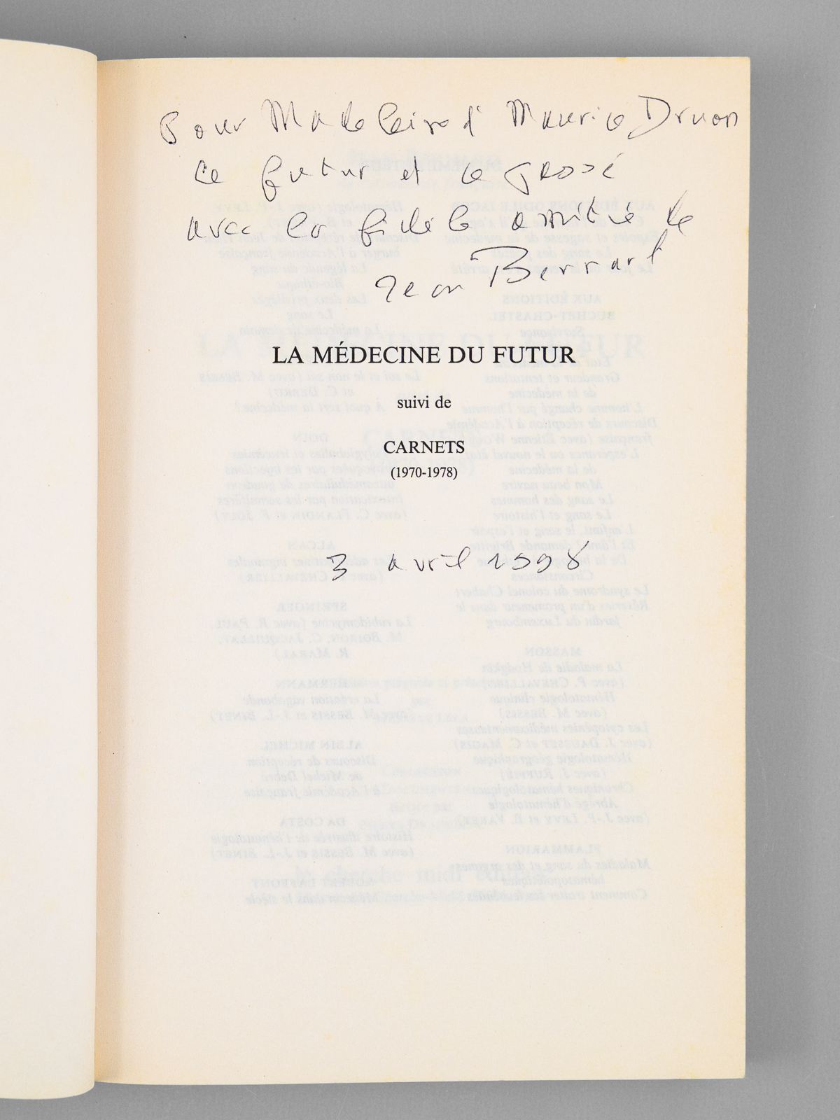 Envoi ms. de l'auteur, 1 vol. in-8 br., coll. Documents, Le Cherche Midi éditeur, Paris, 1998, 182 pp. Commentaire : Envoi de l'auteur à Maurice Druon et à son épouse: 'Pour Madeleine et Maurice Druon, ce futur et ce passé. Avec la fidèle amitiés de Jean Bernard'. L'auteur et le dédicataire étaient tous deux académiciens. Maurice Druon (1918-2009), auteur notamment de la célèbre saga historique des Rois maudits, fut élu à l'Académie Française en 1968. Il en devint le Secrétaire Perpétuel, de 1985 à 1999. L'auteur, quant à lui, fut élu à l'Académie Française en 1975, au fauteuil de Marcel Pagnol. Le professeur Jean Bernard, éminent hématologue et oncologue, présida le Comité National d'Ethique de 1983 à 1993. Etat très satisfaisant (lég. rouss. sur tranches, quelques pages écornées à titre de marque-pages par Maurice Druon, bon état par ailleurs) pour cet exemplaire provenant d'une origine prestigieuse.