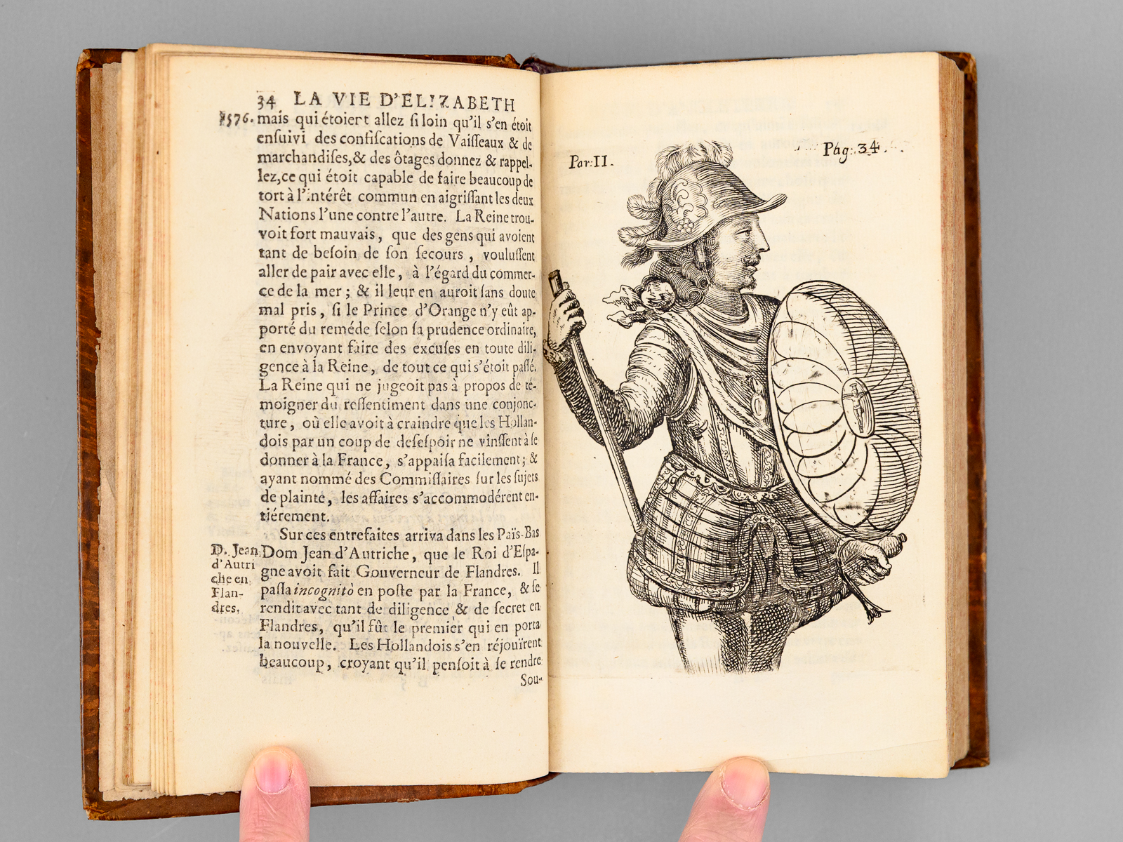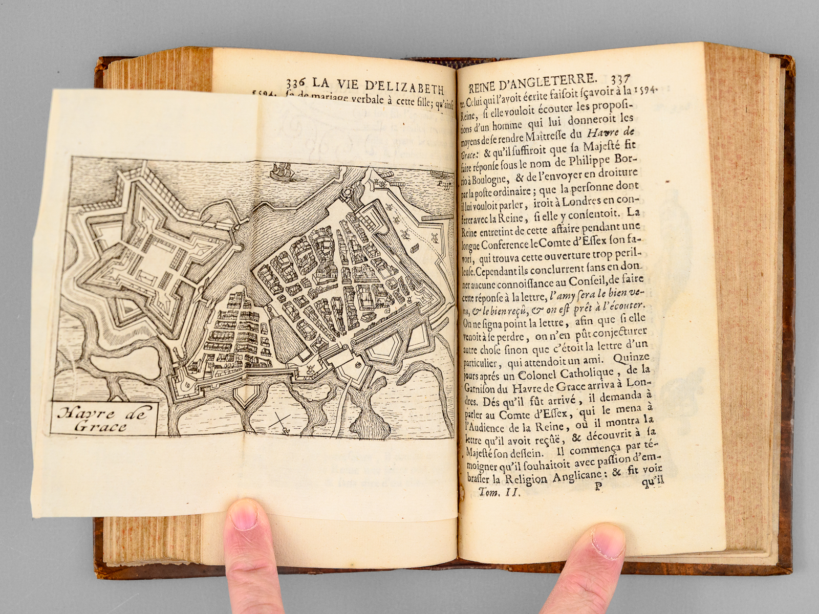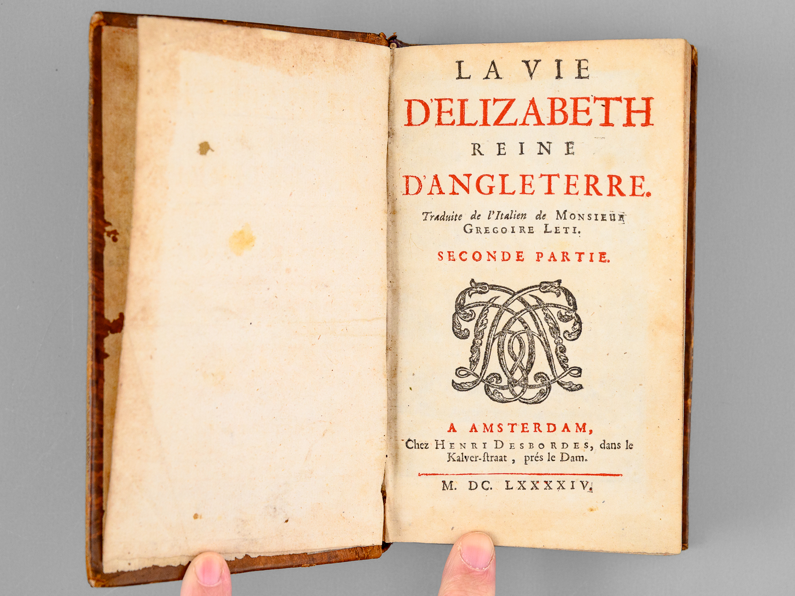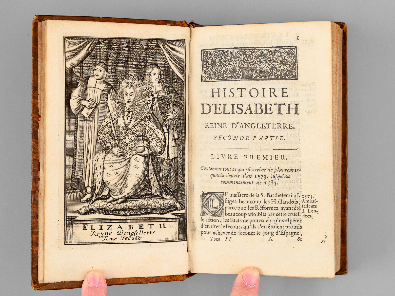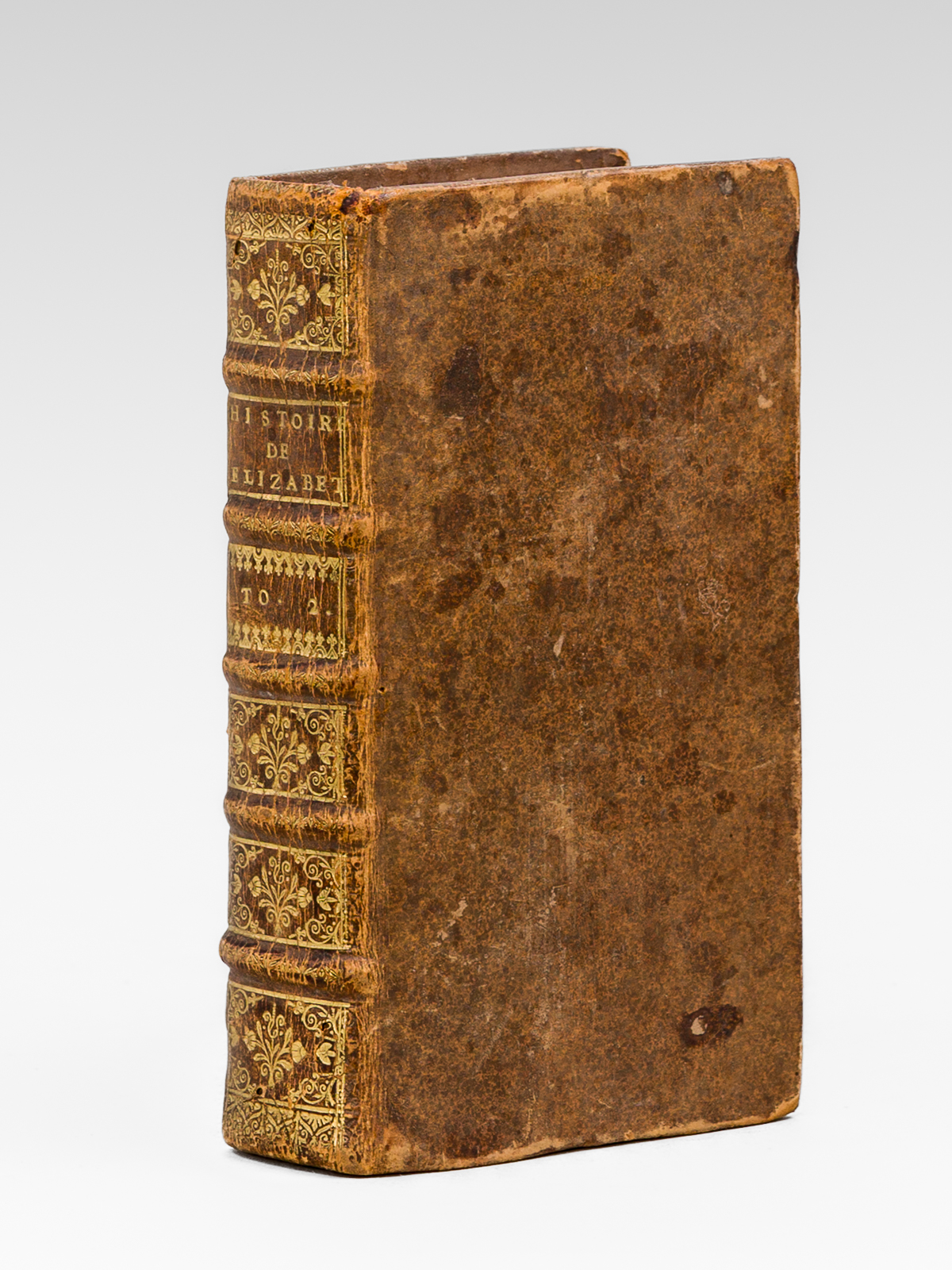 Commentaire : Tome second seul, bien complet du frontispice, des 15 portraits hors texte et des 2 cartes dépliantes. Bon état (reliure lég. frottée avec 3 très petites piq. de vers et coiffe un peu frottée, très bon état par ailleurs) pour ce second tome de la rare édition originale de la traduction française de l'ouvrage de l'historien protestant italien Gregorio Leti (1630-1701), paru en 1693 sous le titre : 'Historia overo Vita di Elisabetta, Regina d'Inghilterra'.