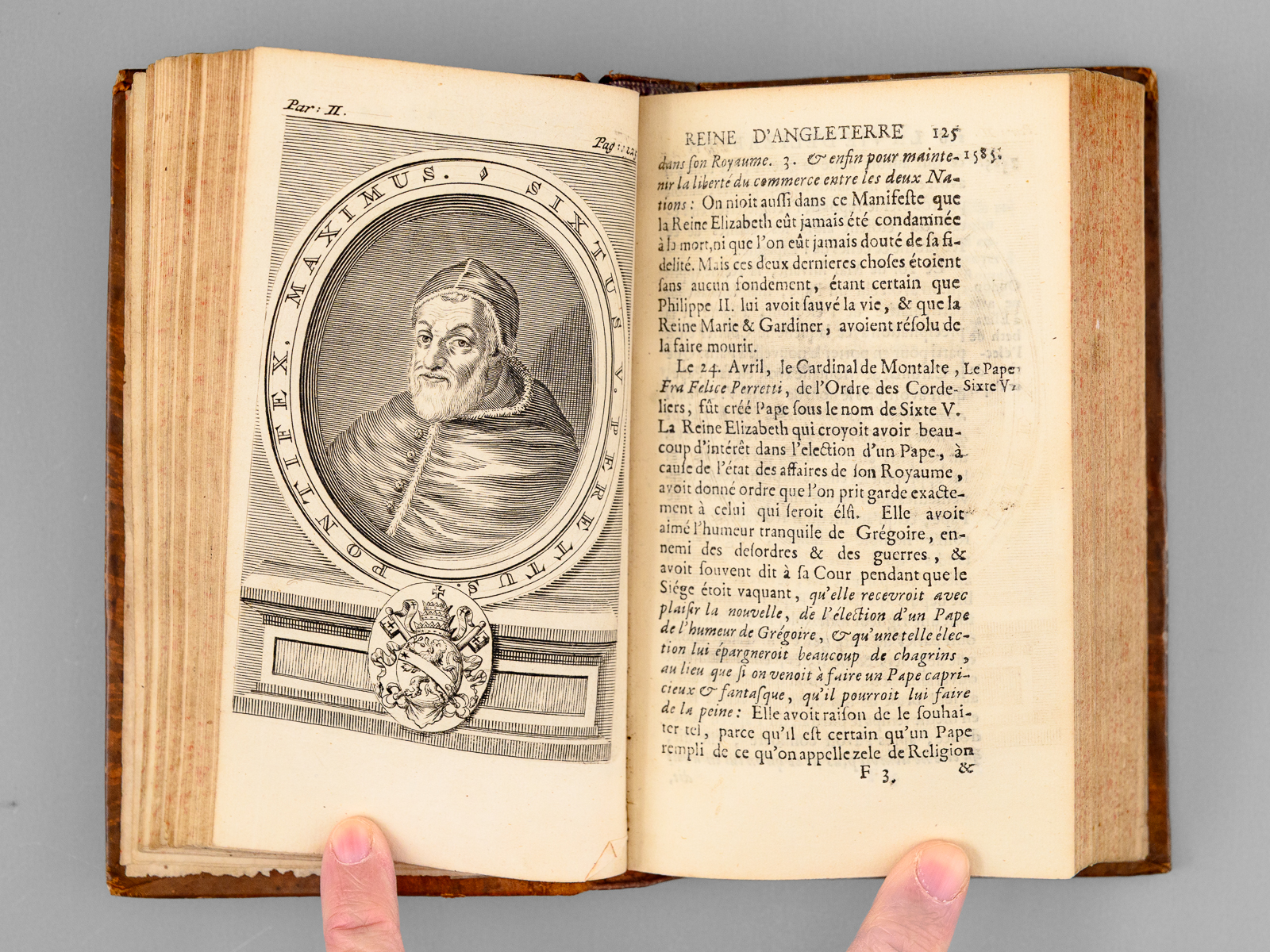 Traduite de l'italien de Monsieur Grégoire Leti, 1 vol. in-12 reliure de l'époque pleine basane brune, dos à 5 nerfs orné, coupes dorées, Chez Henri Desbordes, Amsterdam, 1694, 554 pp. et 8 ff. n. ch. avec frontispice, 15 planches hors texte et 2 cartes dépliantes