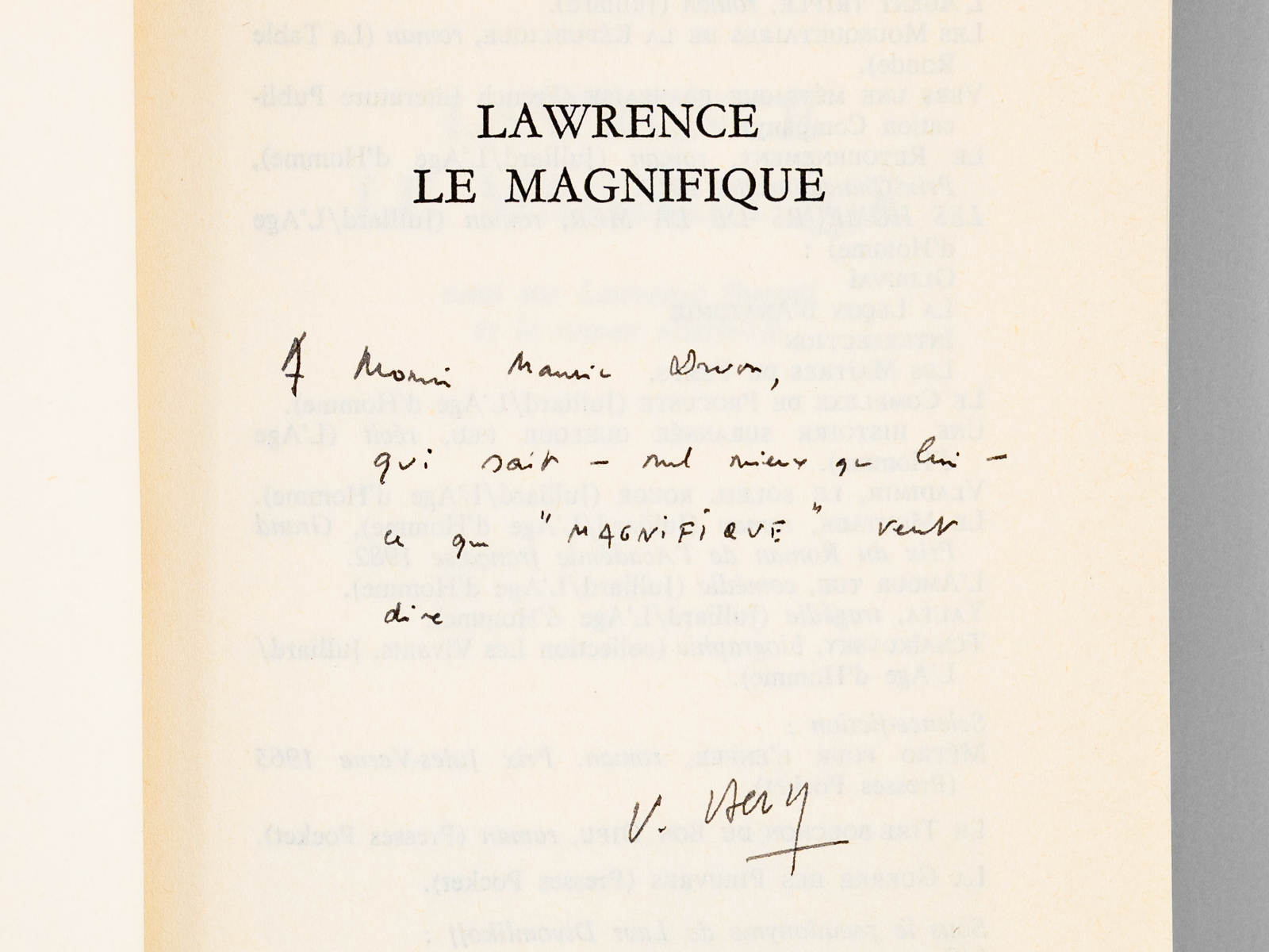 Envoi ms. de l'auteur, 1 vol. in-12 br., Julliard, L'Age d'Homme, 1984, 140 pp. Commentaire : Avec un bel envoi de l'auteur : 'A Monsieur Maurice Druon, qui sait - nul mieux que lui - ce que 'Magnifique' veut dire. Maurice Druon, fut résistant, écrivain auteur notamment de la saga historique des Rois maudits, et homme politique. Elu à l'Académie Française en 1968, il en devint le Secrétaire Perpétuel en 1985. Bon état (des paragraphes signalés en marge, au stylo, par Maurice Druon).