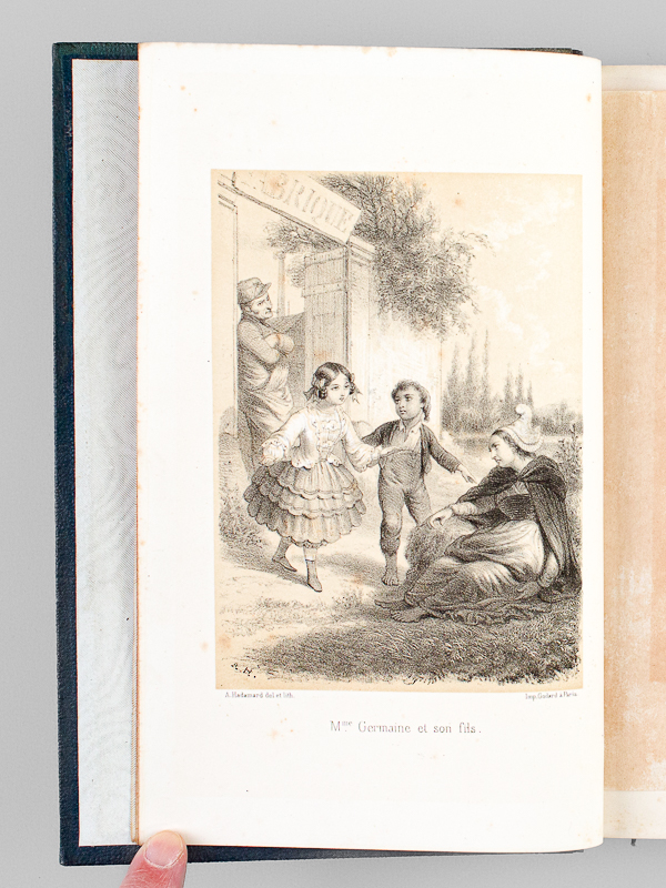 Anecdotes, légendes et récits intéressants par MM. Charles de Ribelle, F. Fertiault, et Mme la Ctesse de Bassanville, 1 vol. in-8 reliure de l'époque demi-chagrin vert, dos à 4 nerfs orné, toutes tranches dorées, Amable Rigaud, Paris, 1859, 2 ff., 301 pp. avec 12 lithographies teintées dont 11 par Hadamard Commentaire : Bon exemplaire (rel. très lég. frottée) pour cette rare édition de cette géographie amusante, illustrée de 12 lithographies teintées (dont 11 représentant des types ethniques ou nationaux, par Hadamard).