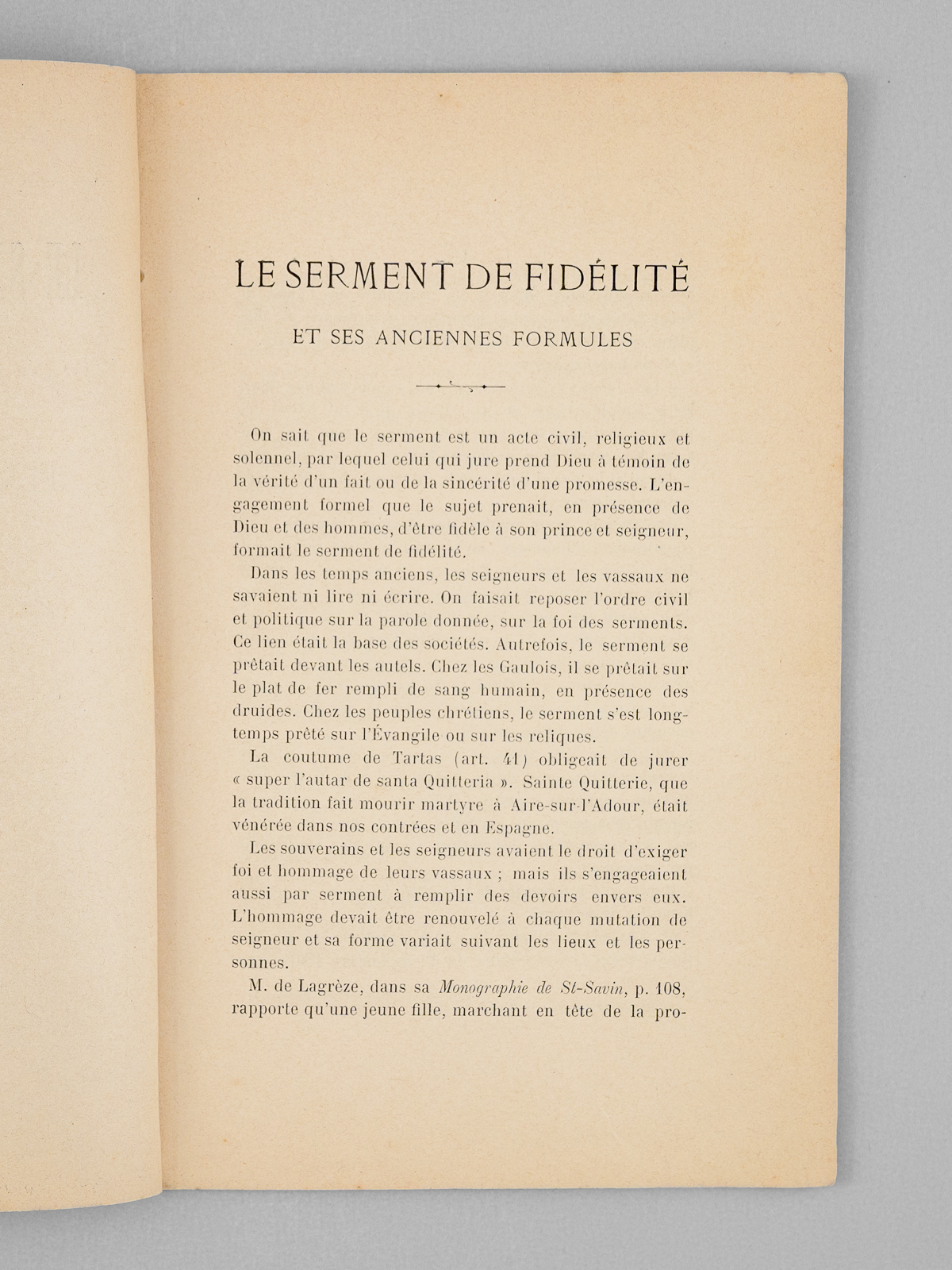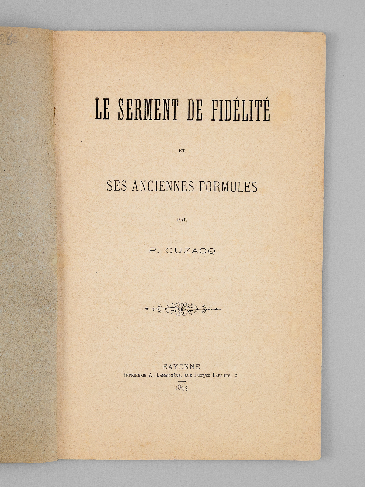 Commentaire : Etat très satisfaisant pour cette petit étude sur les serments de fidélité formulés à travers l'histoire. L'auteur, géomètre de formation, produisit plusieurs études sur l'histoire et les traditions des Landes, dont il était originaire. Il était le grand oncle de l'historien René Cuzacq (1901-1977), grand spécialiste des Landes et du Pays Basque. La présente brochure fut également publiée dans une revue (Bulletin de la Société des sciences, lettres et arts de Bayonne, n° 2, Deuxième trimestre 1895, pp. 291-315)