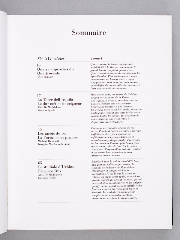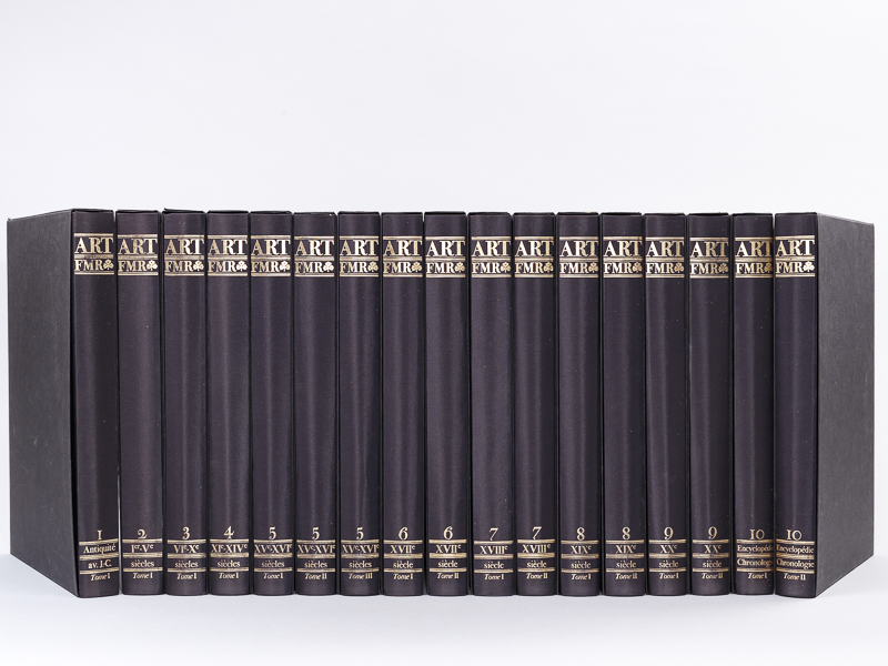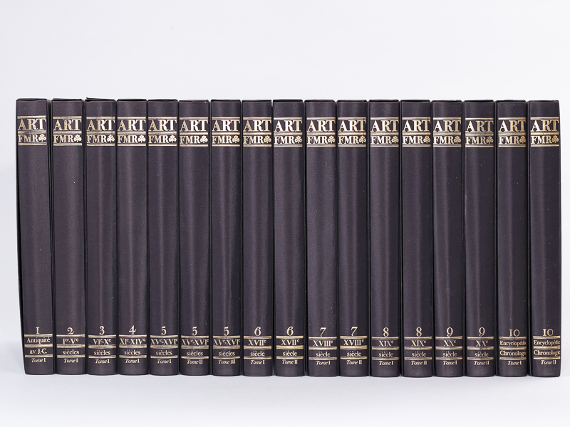 17 vol. in-8 reliure d'édition pleine soie noire Orient, près de 4500 reproductions dont 300 reproduction en pleine page, FMR, Franco Maria Ricci, 1997. 10 Sections à savoir : Antiquité (1 Volume) - Ier au Ve siècle (1 vol.) - VIe au Xe siècle (1 vol.) - XIe au XIVe siècle (1 vol.) - XVe au XVIe siècle (3 vol.) - XVIIe (2 vol.) - XVIIIe (2 vol.) - XIXe (2 vol.) - XXe (2 vol.) - Encyclopédie Chronologie (2 vol.) Commentaire : Magnifique réalisation présentant de splendide façon un choix éclectique des plus grands chefs-d'oeuvre de l'art. Des spécialistes reconnus présentent ainsi une quinzaine de thèmes par volumes, dans les domaines de l'architecture, de la bibliophilie, des arts décoratifs, de la peinture, de la sculpture, etc. Ainsi, le premier des deux volumes consacrés au XVIIe siècle développe les sujets suivants : La chapelle des Princes à Florence - Les nains de Cour - Le carrousel de Louis XIV - Le théâtre Farnèse - Gaetano Zummo - La codex Manuzzi - Les céramiques du Palais de Fronteira - Zurbaran - Les autels des Corbarelli - La Galerie de La Vrillière - Giovanna Garzoni - Les ivoires de Cobourg - Nicolas Robert - Olav Rudbek. La qualité de l'ouvrage fait de cet ensemble une superbe réussite. Bon exemplaire en très bon état. Sans le deuxième volume du tome consacré à la période du XIe au XIVe)