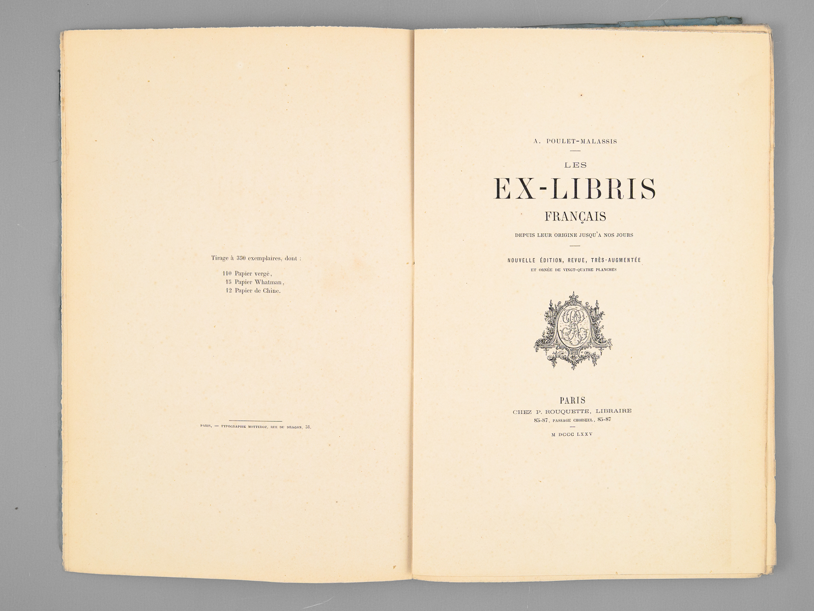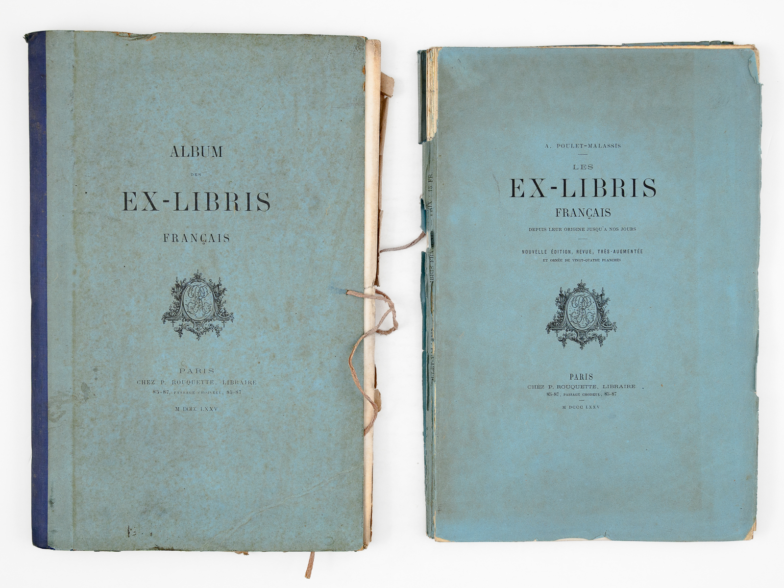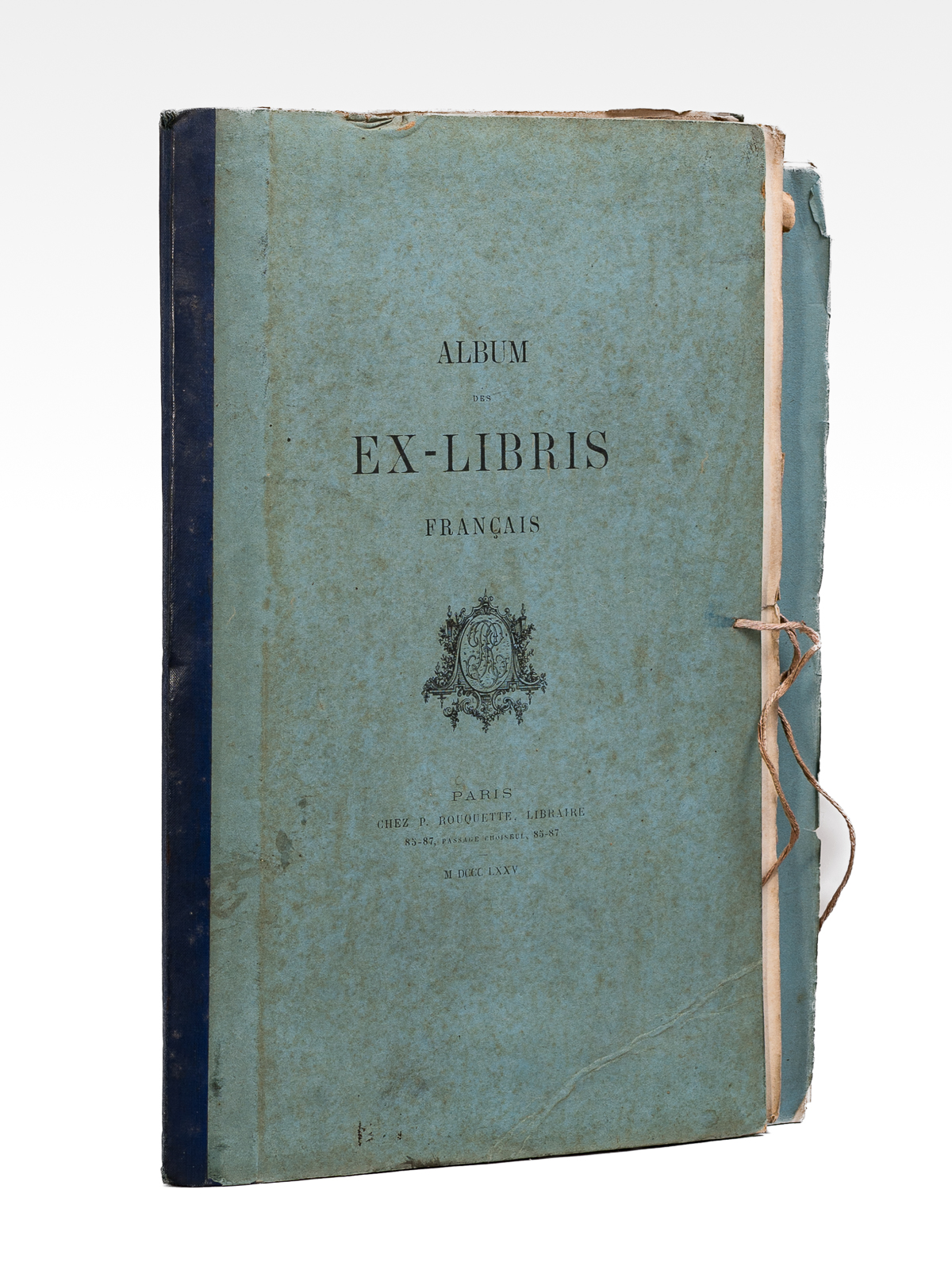 Nouvelle Edition, revue, très-augmentée et ornée de vingt-quatre planches, 1 vol. in-8 et un album en feuillets sous chemise cartonnée à lacets, Chez P. Rouquette, Paris, 1875, VIII-79 pp. et 2 ff. n. ch. et 24 planches hors texte Commentaire : Rare exemplaire de l'édition très augmentée de 1875, bien complète de l'album et de ses 24 planches d'ex-libris. Etat satisfaisant (importants manques en dos du volume de texte, usures en marges des planches, bon état par ailleurs).
