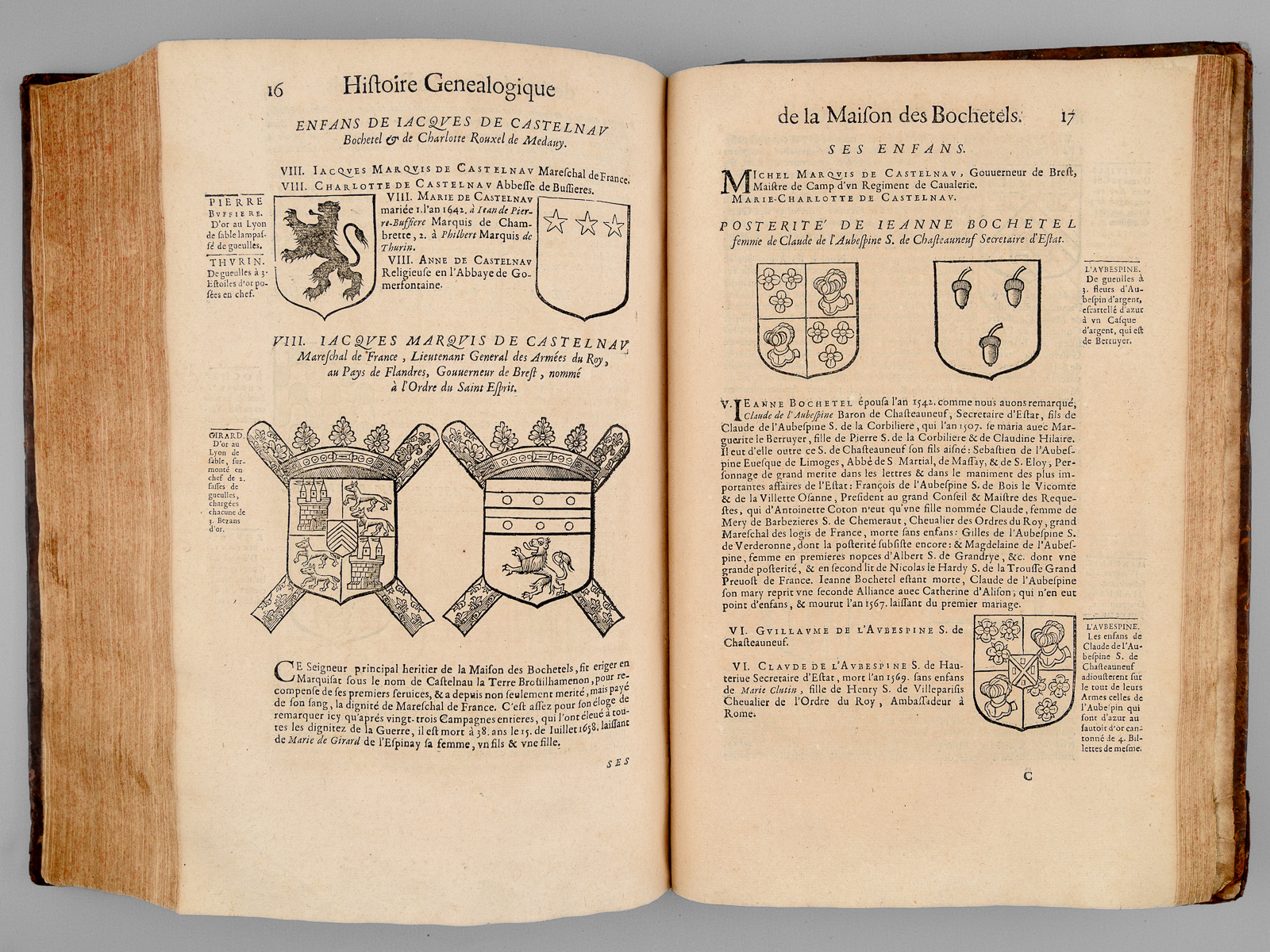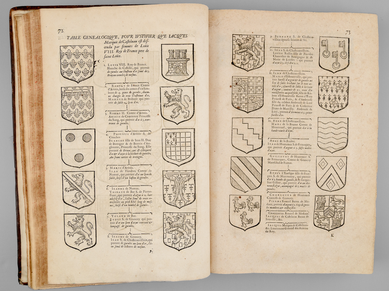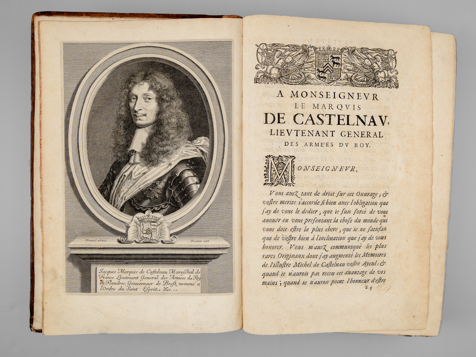 2 vol. in-folio reliure de l'époque plein veau brun, dos à 6 nerfs orné, Chez Pierre Lamy, Paris, 1659, 12 ff., 73-907 pp. et 5 ff. n. ch. avec 2 portrait hors texte (Jacques et Michel de Castelnau) ; 1 f., 909 pp., 1 f., 125 pp. et 6 ff. n. ch. (tables) avec plus de 300 blasons gravés dans le texte.