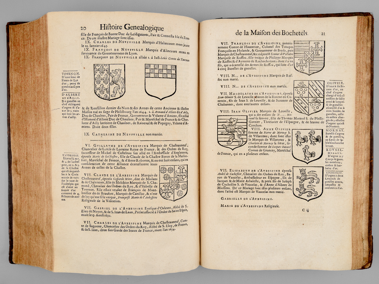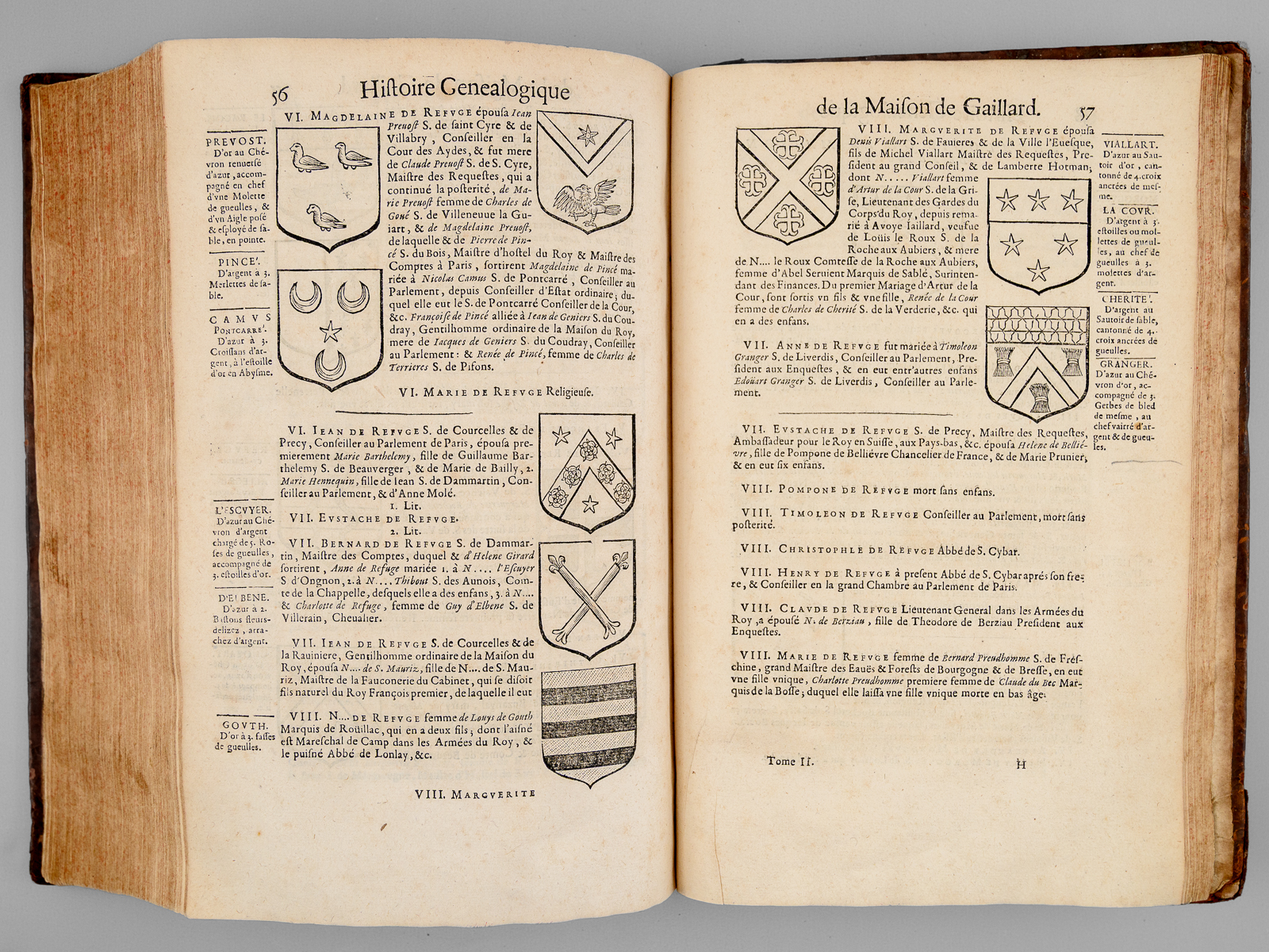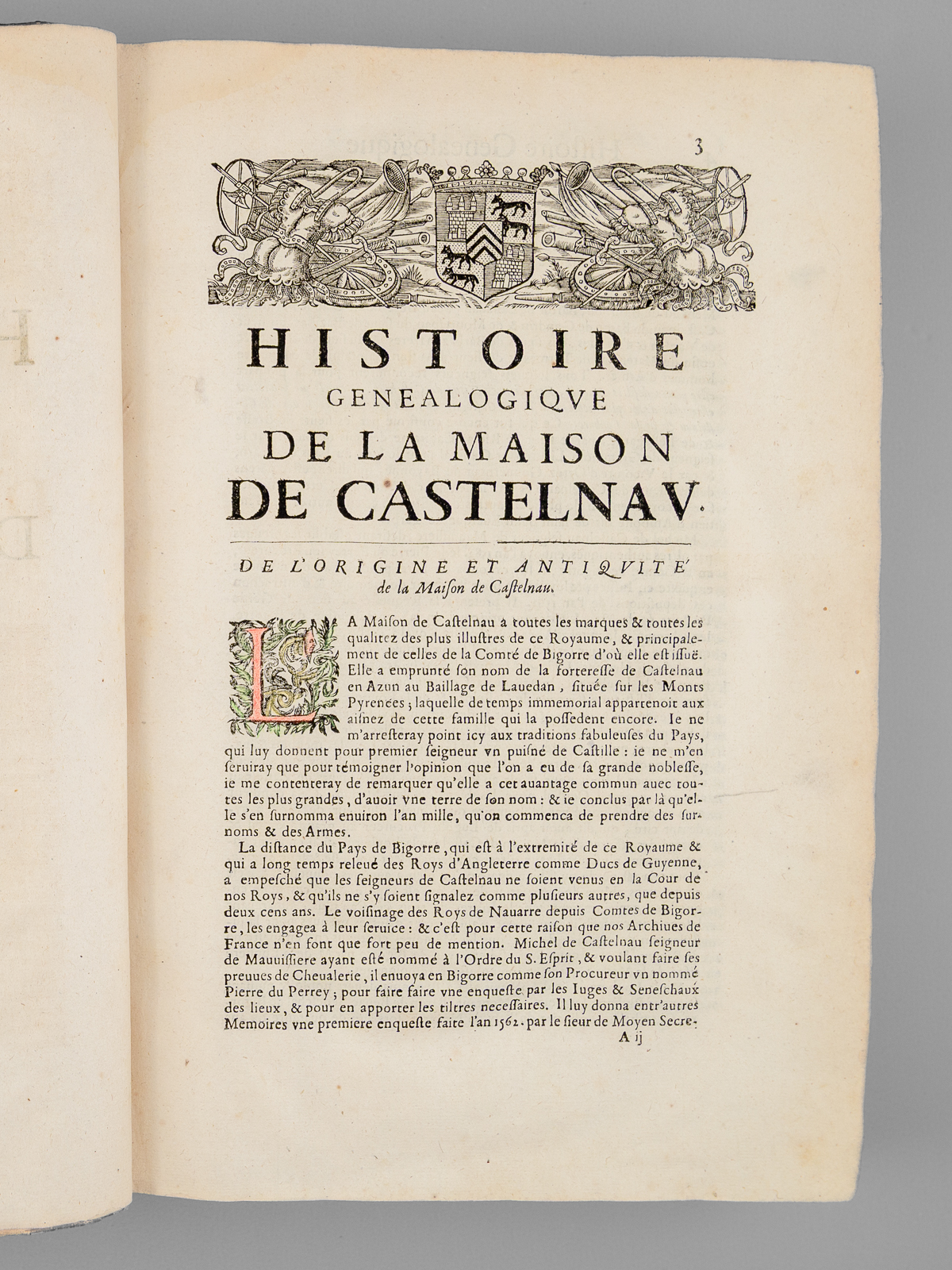 2 vol. in-folio reliure de l'époque plein veau brun, dos à 6 nerfs orné, Chez Pierre Lamy, Paris, 1659, 12 ff., 73-907 pp. et 5 ff. n. ch. avec 2 portrait hors texte (Jacques et Michel de Castelnau) ; 1 f., 909 pp., 1 f., 125 pp. et 6 ff. n. ch. (tables) avec plus de 300 blasons gravés dans le texte.
