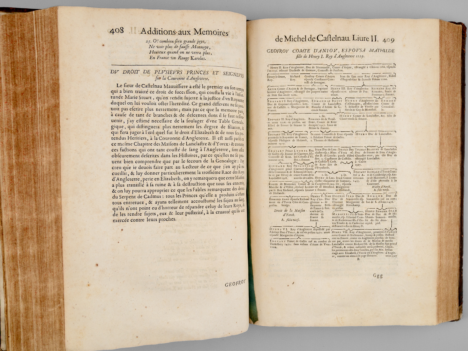 Commentaire : Homme de guerre et diplomate, Michel de Castelnau (1517-1592) est d'origine béarnaise (Comté de Bigorre). Il fit 'la guerre en Piémont sous Brissac, fut chargé par le cardinal de Lorraine d'importantes missions en Écosse, auprès de Marie Stuart, fiancée au dauphin (depuis François II), puis en Angleterre, auprès d'Élisabeth ; remplit plusieurs ambassades en Allemagne, dans les Pays-Bas, en Savoie et à Rome, où il contribua à l'élection de Pie IV. De retour en France, il découvrit les premiers indices de la conjuration d'Amboise et les communiqua aux ministres. Pendant les guerres civiles, il servit avec dévouement le parti catholique, combattit au siège de Rouen, à la bataille de Dreux, s'empara de Tancarville, concourut à la reprise du Havre sur les Anglais (1563), aux victoires de Jarnac et de Moncontour, remplit encore plusieurs missions en Allemagne et en Angleterre, où il séjourna dix ans, et fut également employé par Henri IV. Il a laissé des Mémoires qui s'étendent de 1559 à 1570 [... ]. Ils sont empreints d'une haute impartialité et restent une des meilleures sources à consulter sur cette époque si fertile en événements' (Larousse, GDU, III, 521). Ces mémoires qui s'étendent de 1559 à 1570 ont été publiés pour la première fois à Paris en 1621 par Jacques de Castelnau, fils de Michel puis réimprimés avec des commentaires et des pièces justificatives, par les soins de Jean Le Laboureur en 1659 (Brunet I, 1626). Les Mémoires de Michel de Castelnau et les 'Additions aux Mémoires' sont complétées dans le tome I par l'Histoire généalogique de la Maison de Castelnau (Tome I) et par les Généalogies de plusieurs maisons alliées à celle de Castelnau (Tome II), chacun de ces généalogies étant richement illustrée dans le texte par les armoiries de ces familles (au total, plus de 300 blasons gravés). Etat satisfaisant (reliure fort. frottées avec manques en coiffes et mors mais reliures bien solides, qq. restaurations marginales aux feuillets de tables dans le tome I, qq. restaurations en coiffes et coins, bon état intérieur par ailleurs) pour ces mémoires de référence, 'd'une haute impartialité' l'une 'des meilleures sources à consulter' selon le Grand Dictionnaire Universl de Pierre Larousse..