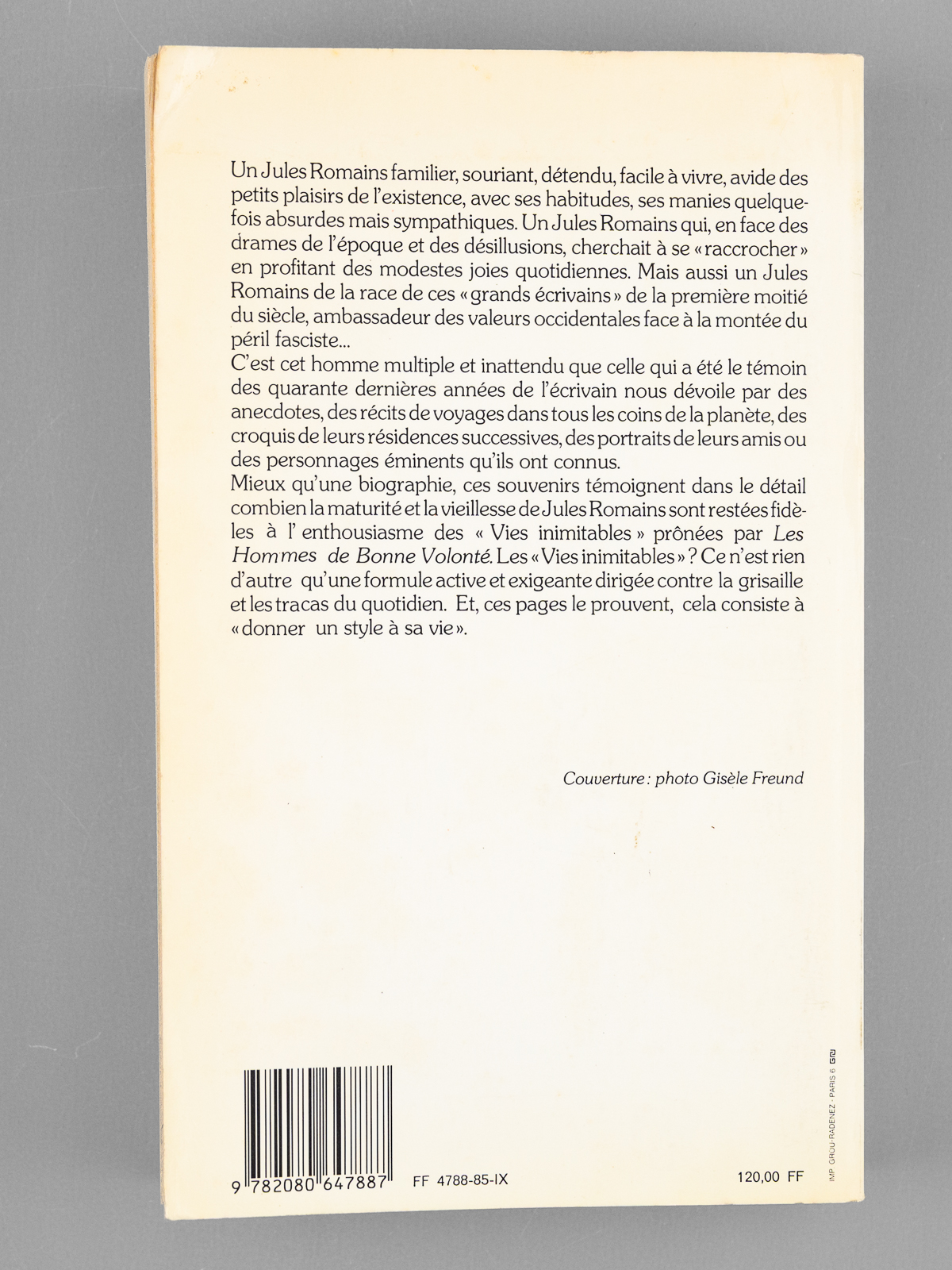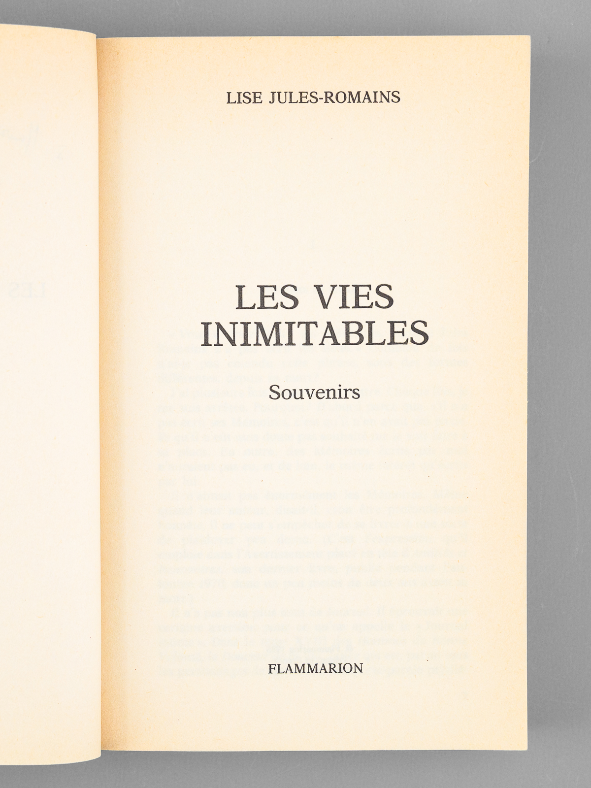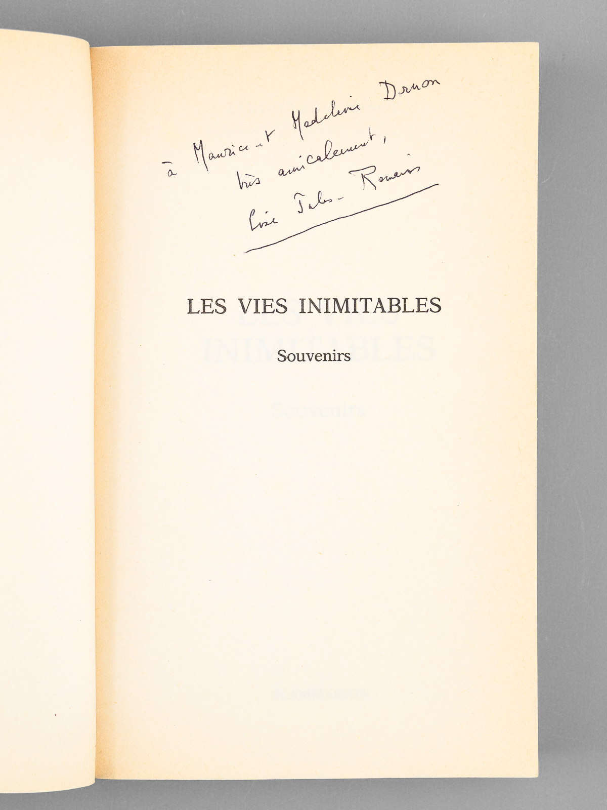1 vol. in-8 br., Flammarion, Paris, 1985, 382 pp. Commentaire : Envoi de l'épouse de Jules Romains : 'A Maurice et Madeleine Druon, très amicalement'. Bon état pour cet exemplaire de cet ouvrage de souvenirs, de superbe provenance : de la bibliothèque du grand écrivain Maurice Druon, Secrétaire Perpétuel de l'Académie Française de 1985 à 1999.