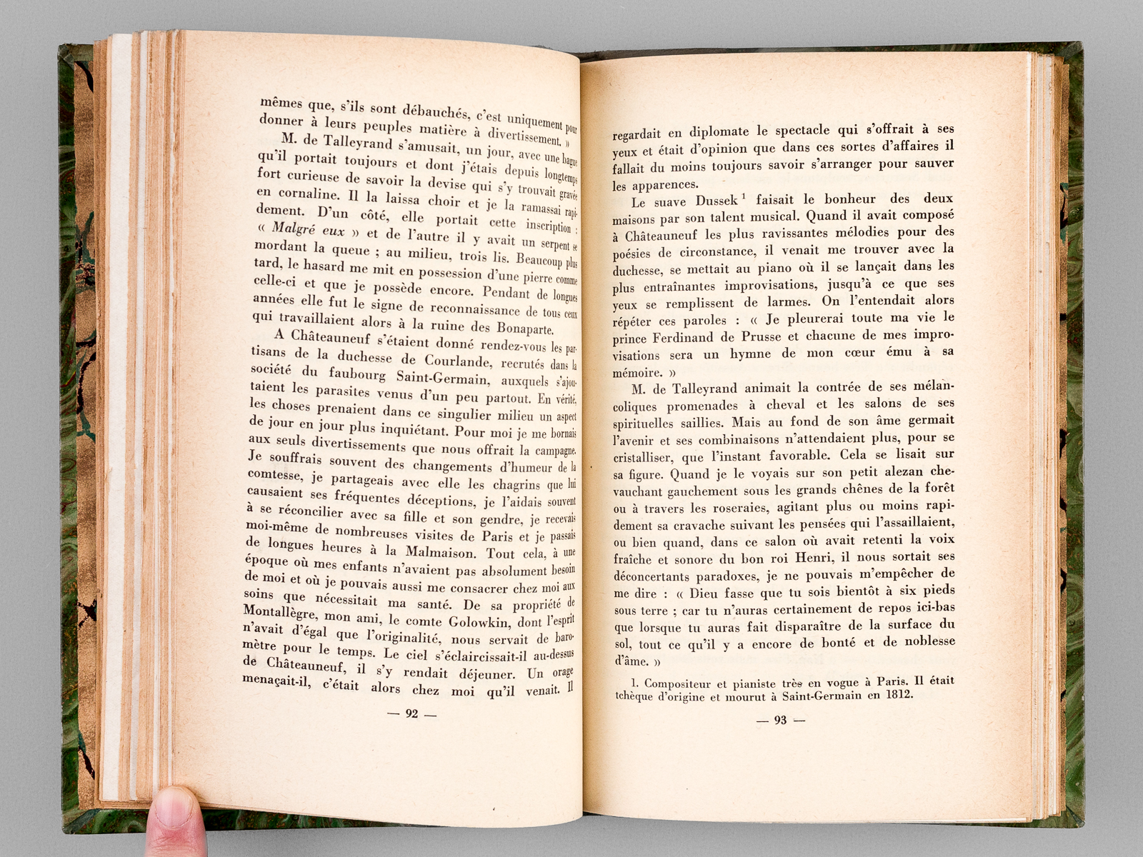 D'après le manuscrit originale des Archives du Comte Guerrino zu Lynar, traduits de l'allemand par Joseph Delage, illustré de 32 planches en hors texte et 8 fac-similés autographes, 2 vol. in-8 reliure demi-basane verte, dos à 5 nerfs, couvertures conservées, Editions Victor Attinger, Paris-Neuchatel, 1928, 201 ; 213 pp. Commentaire : Complet. Saxonne, favorable à l'influence française, Charlotte de Kielmannsegge vécut à la cour impériale de 1809 à 1813 , dont elle décrit les fêtes et grandes réceptions. Bon état (dos passés très lég. frotté, bon exemplaire par ailleurs). Tulard, Mémoires, 411