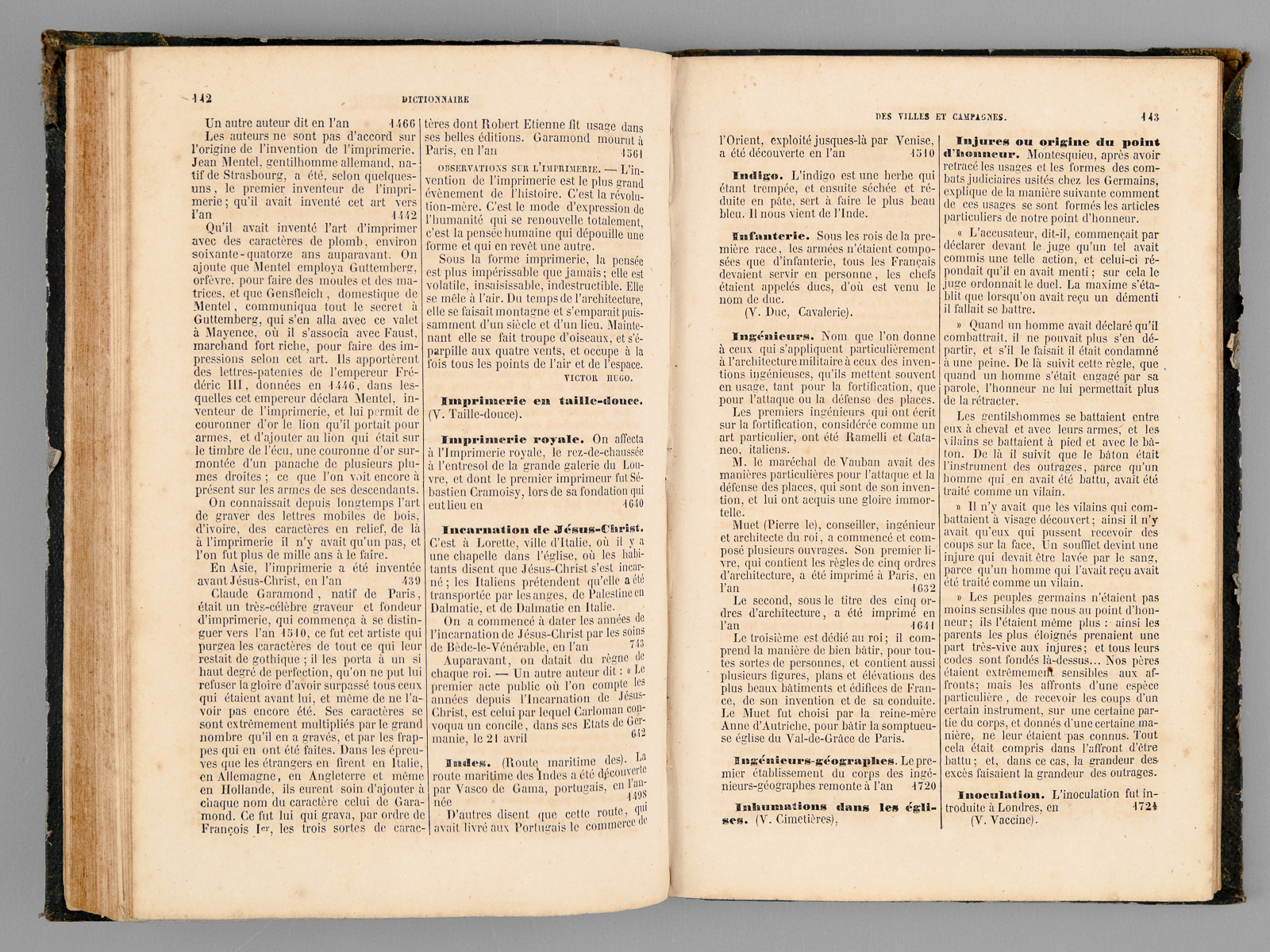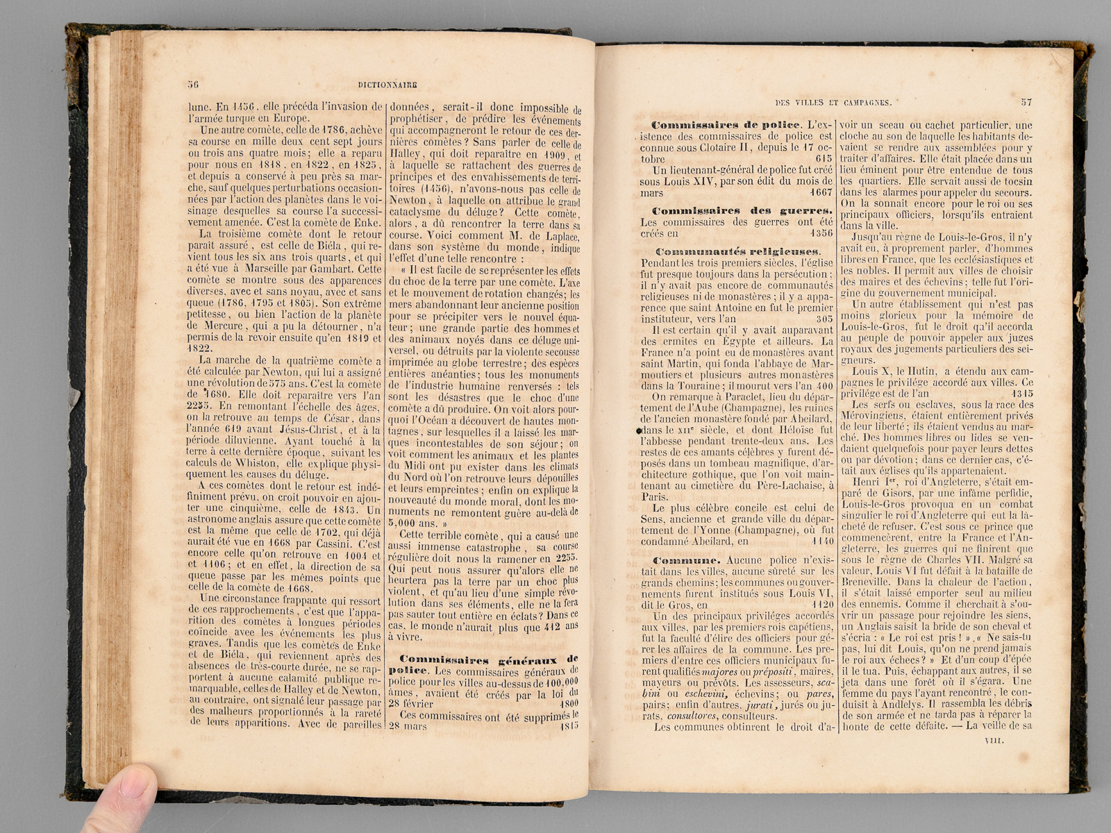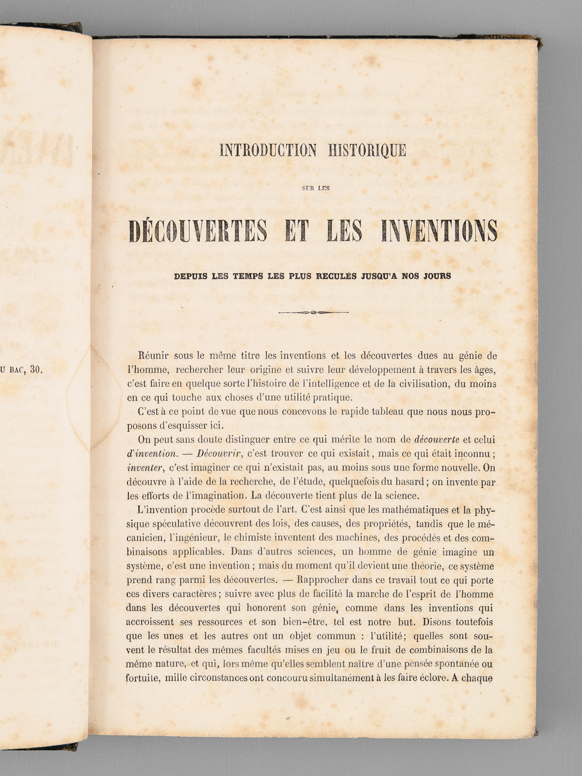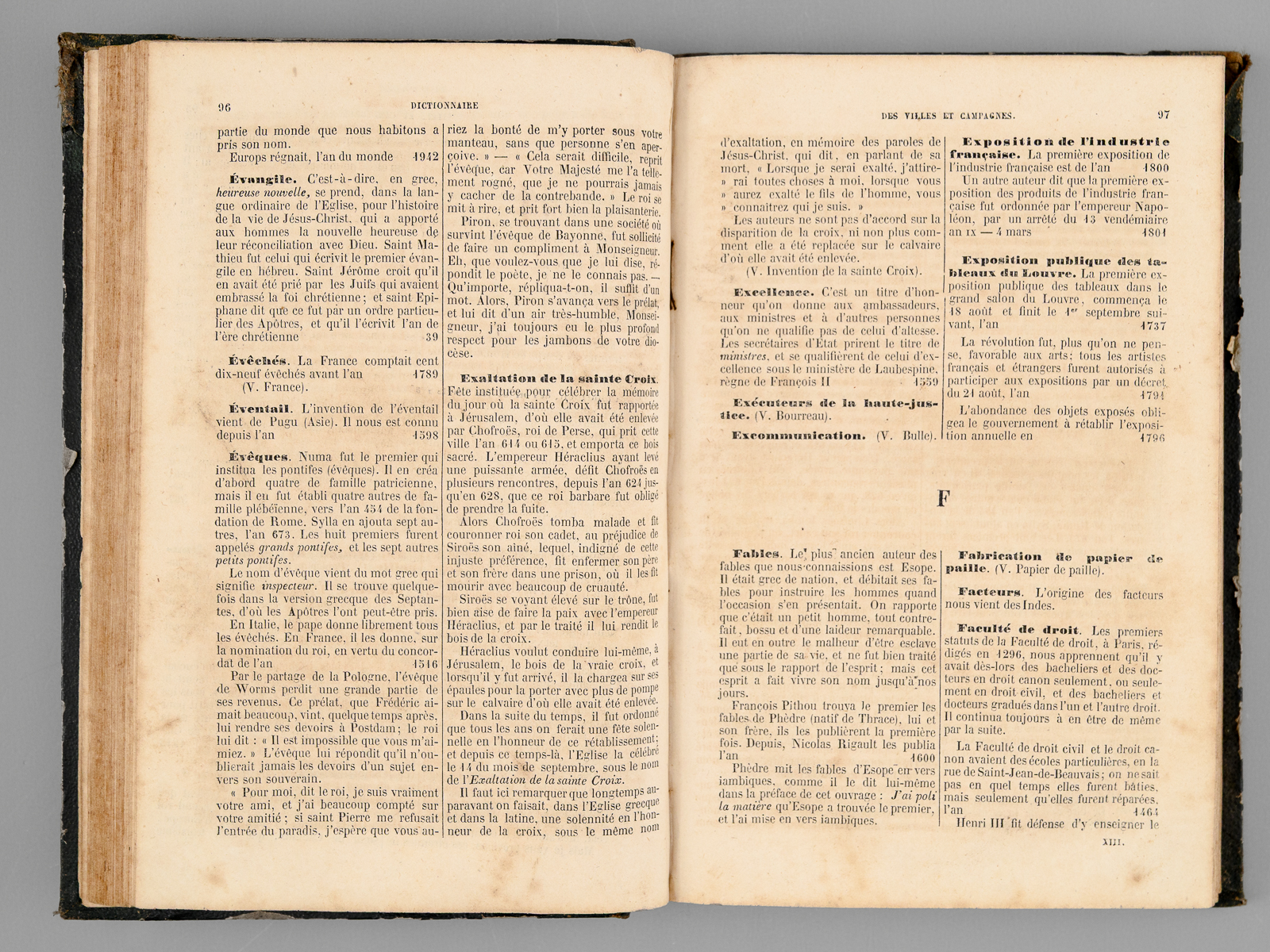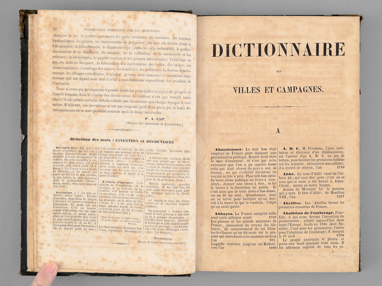 Commentaire : Ouvrage très peu commun, peut-être un retirage modifié d'une édition invendue, mais dont nous n'avons pu trouver l'origine exacte. Après une 'introduction historique sur les inventions' par Cap on trouve un 'Dictionnaire des Villes et Campagnes'. Etat satisfaisant dos et coupes frottées, fortes rouss.).