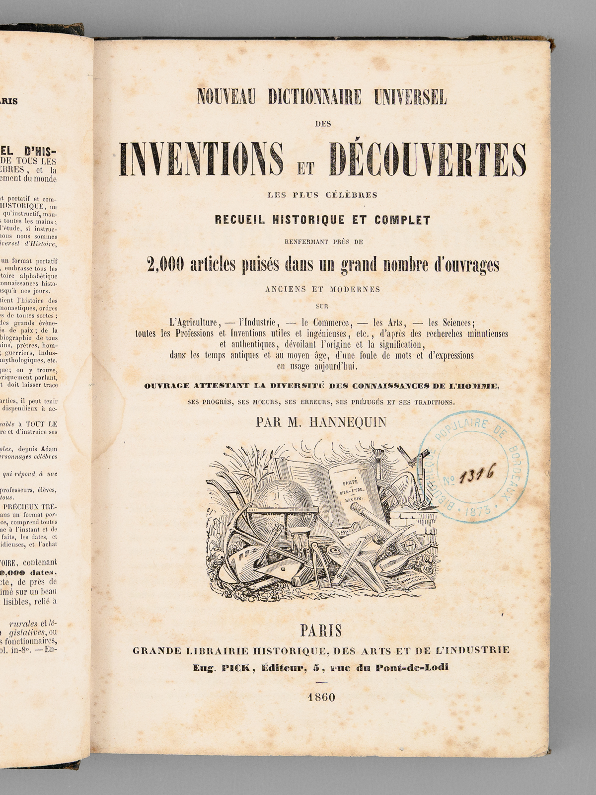 Ouvrage attestant la diversité des connaissances de l'homme, ses progrès, ses moeurs, ses erreurs, ses préjugés et ses traditions, par M. Hannequin, 1 vol. in8 reliure de l'époque demi-percaline verte, initiale en plat, Grande Librairie Historique des Arts et de l'Industrie, Eug. Pick, Paris, 1860, 2 ff., 12-364pp.