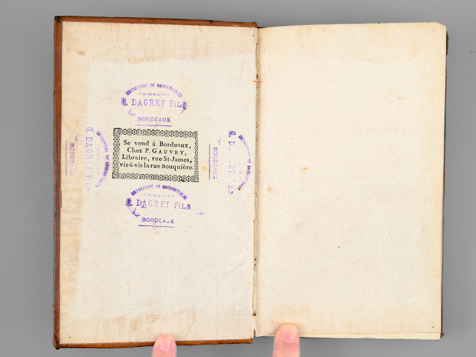 1 vol. in-8 reliure pleine basane marbrée, dos lisse orné, Chez Simon de La Court, Bordeaux, 1777, 3 ff., 152 pp. Commentaire : Etat très satisfaisant (reliure frottée avec petits mq. de cuir, bon état intérieur, ex-libris ms. Jne Minvielle fils aîné). Labadie, 498