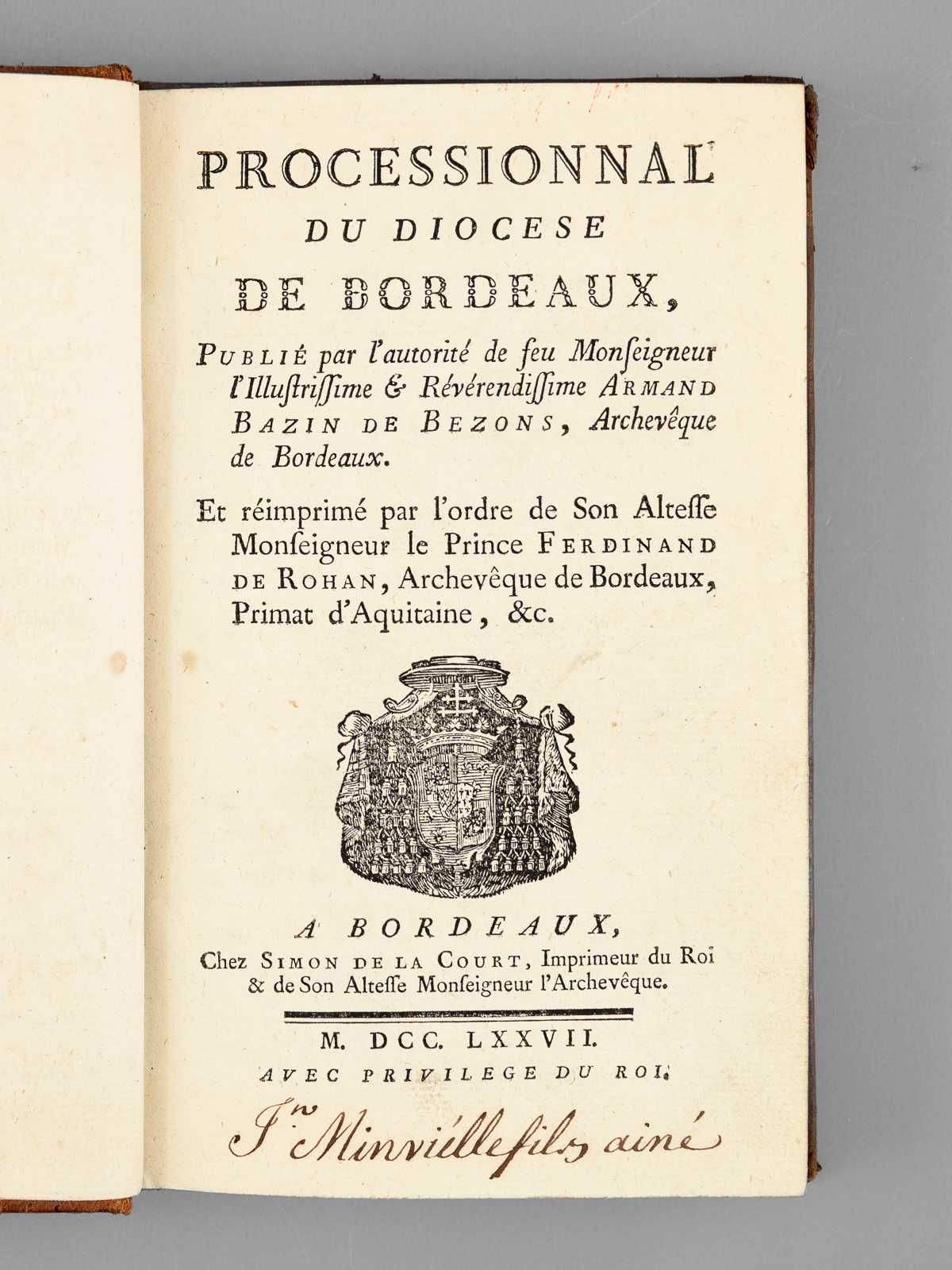 Processionnal du Diocèse de Bordeaux, Publié par l'autorité de feu Monseigneur l'Illustrissime & Révérendissime Armand Bazin de Bezons, Archevêque de Bordeaux. Et réimprimé par l'ordre de Son Altesse - Auteur: BAZIN DE BEZONS, Armand ; [ ROHAN, Mgr Ferdinand de ] - Année d'édition: 1777