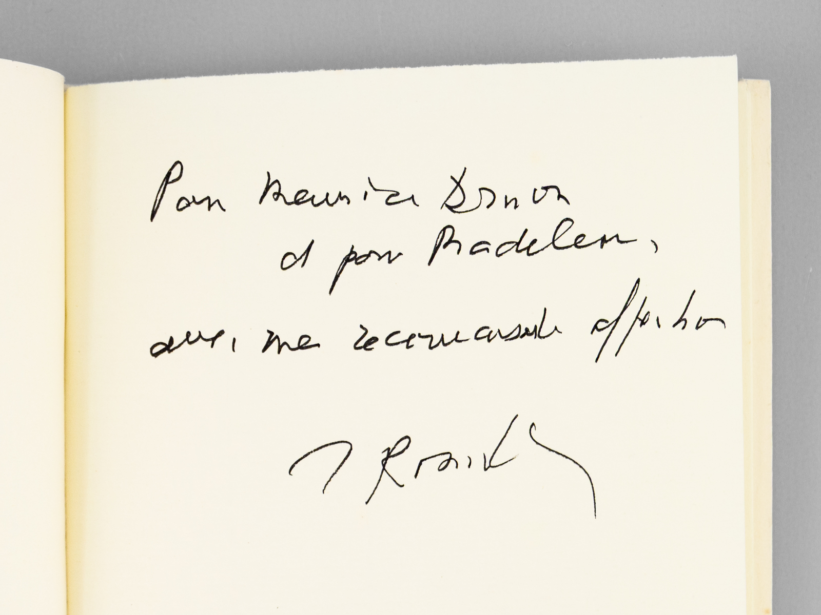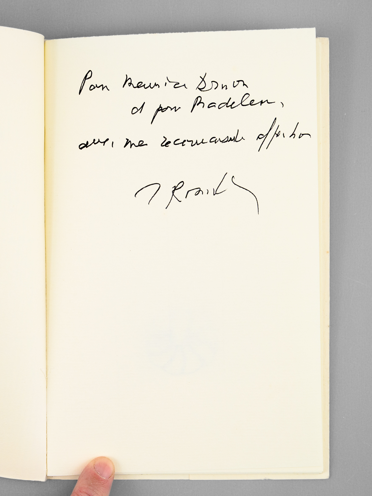 Commentaire : Envoi de l'auteur à l'académicien Maurice Druon et son épouse : 'Pour Maurice Druon et pour Madeleine, avec ma reconnaissante affection.' Maurice Druon (1918-2009), auteur notamment de la célèbre saga historique des Rois maudits, fut élu à l'Académie Française en 1968. Il en devint le Secrétaire Perpétuel, de 1985 à 1999. Jacqueline de Romilly, quant à elle, fut élue à l'Académie Française en 1988. Etat très satisfaisant (rouss. sur tr. sup., bon état par ailleurs) pour cet exemplaire, d'une origine prestigieuse.