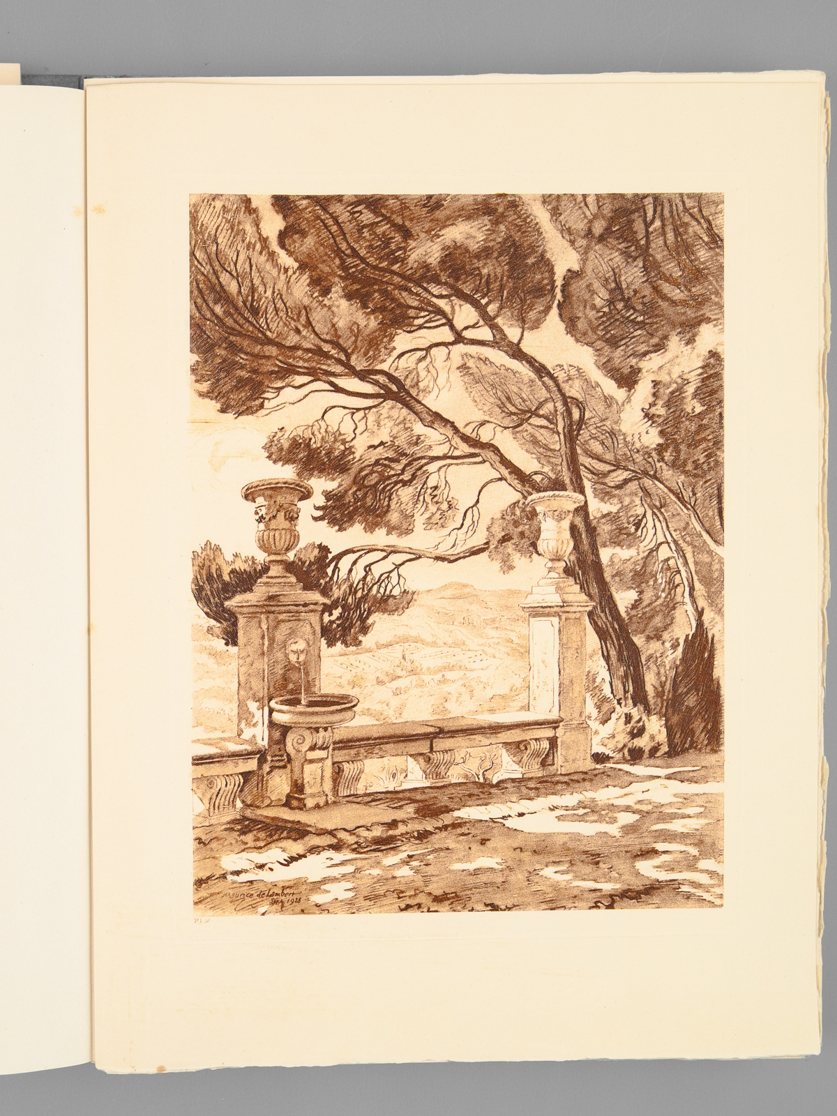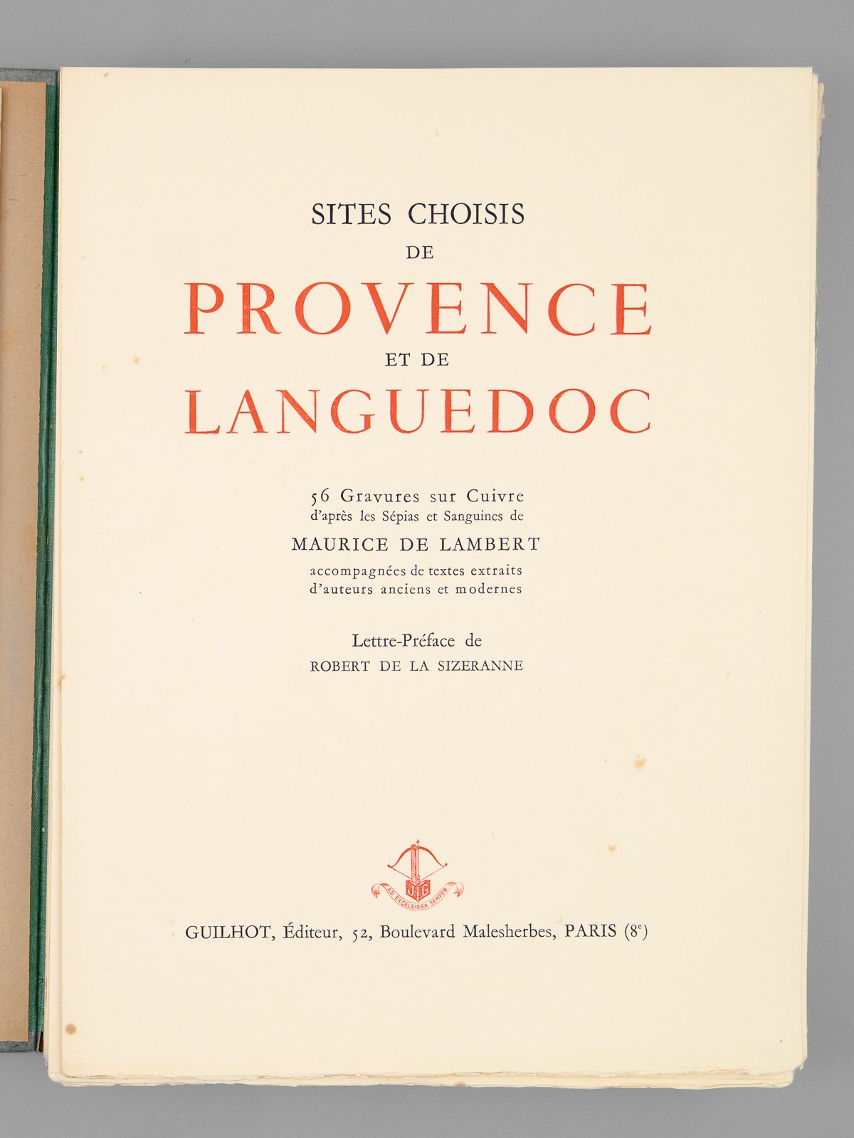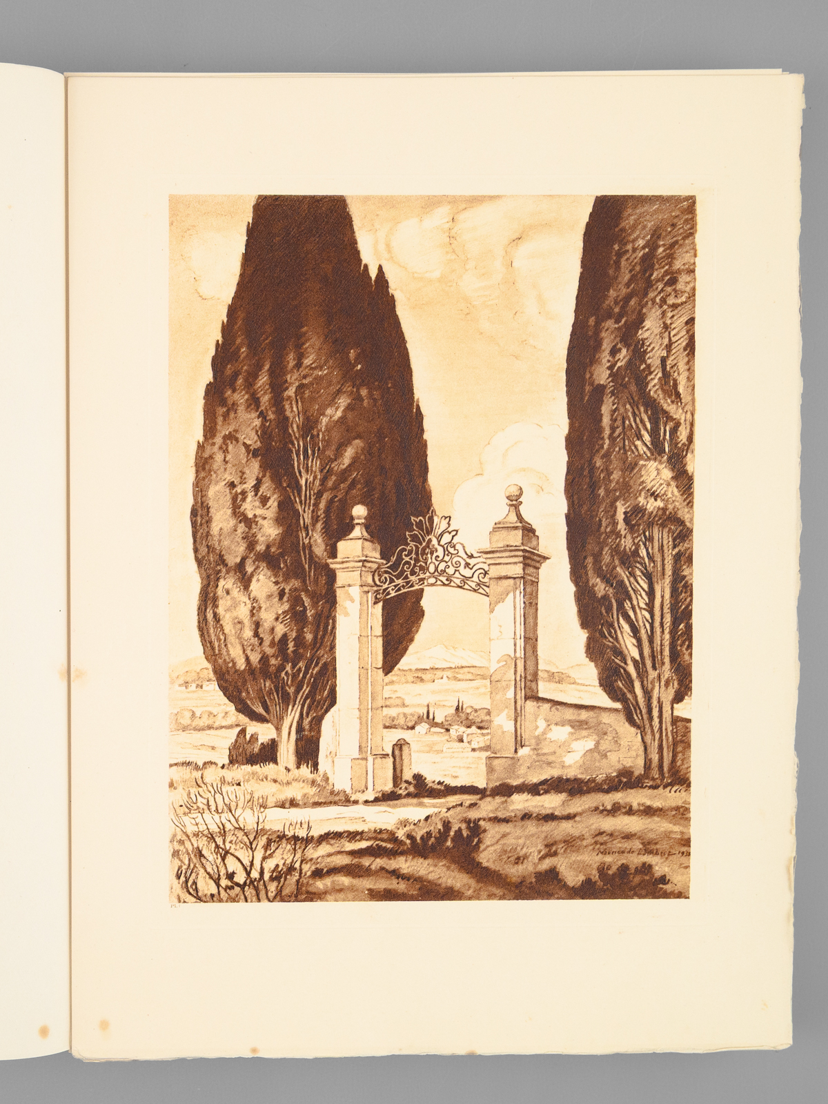 56 Gravures sur Cuivre d'après les Sépias et Sanguines de Maurice de Lambert accompagnée de textes extraits d'auteurs anciens et modernes, Lettre-Préface de Robert de La Sizeranne, Tirage à 996 exemplaires, un des 945 exemplaires sur Rives pur fil à la forme numérotés de 52 à 996 (n° 457), 1 vol. in-4 en feuillets sous chemise cartonnée et étui, Guilhot, Editeur, Paris, 1943, 6 ff. et 56 gravures sous serpente.