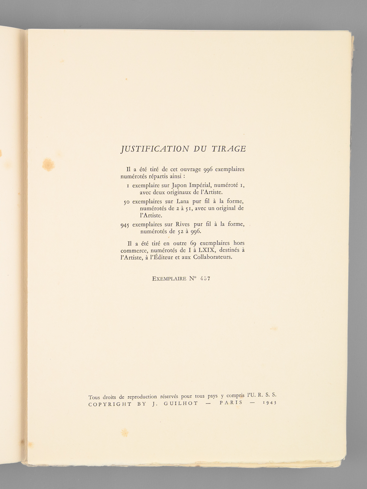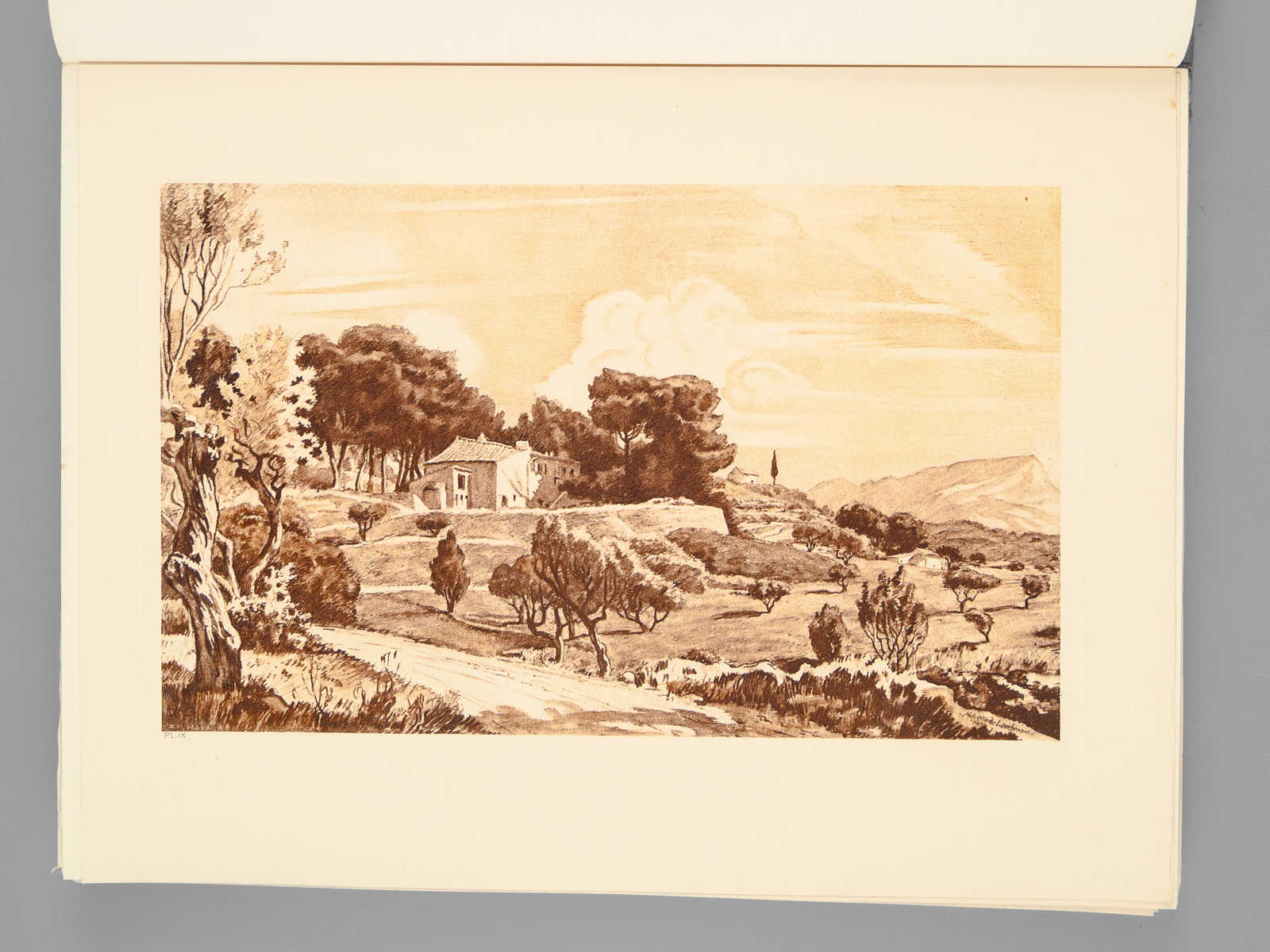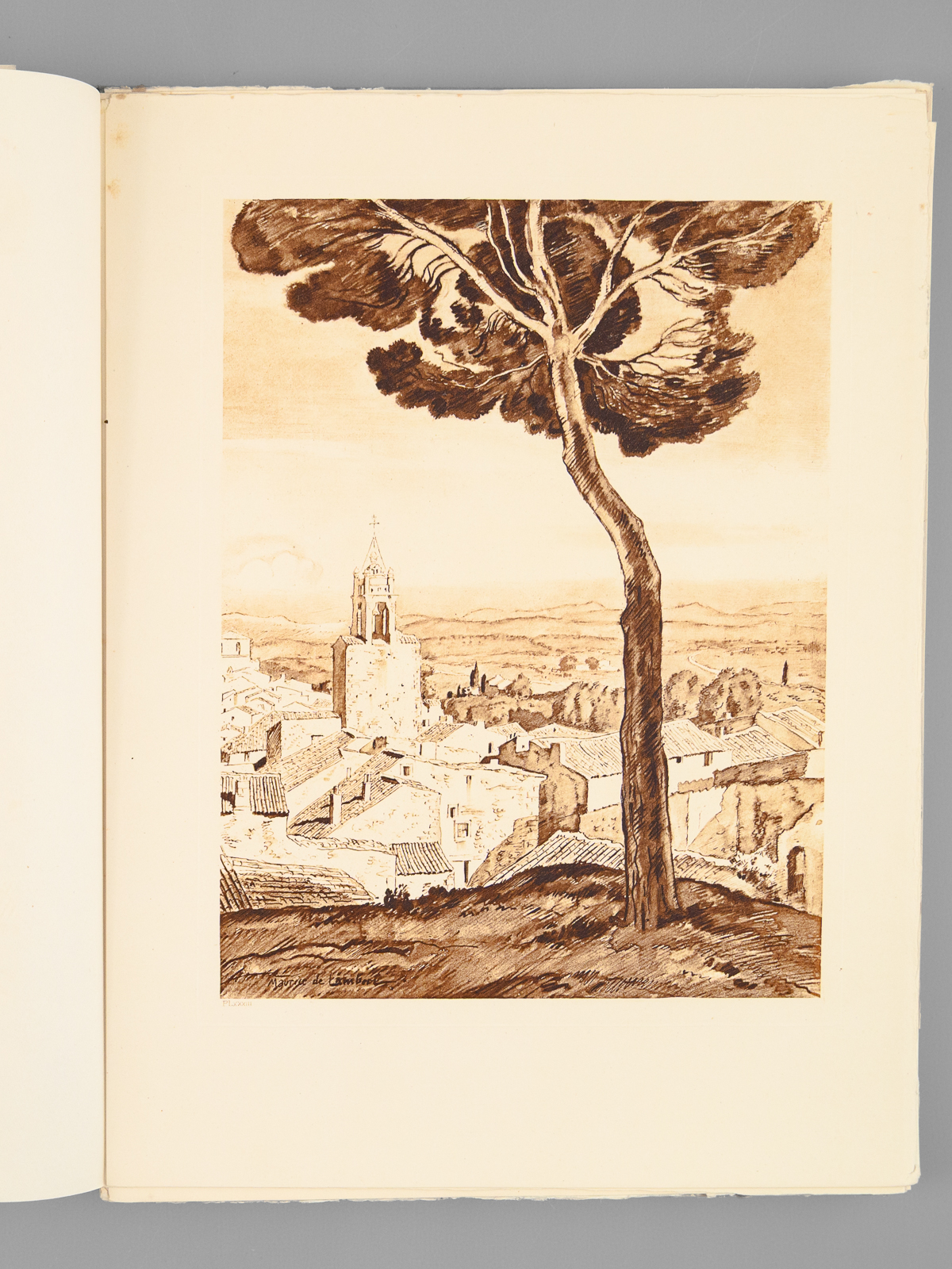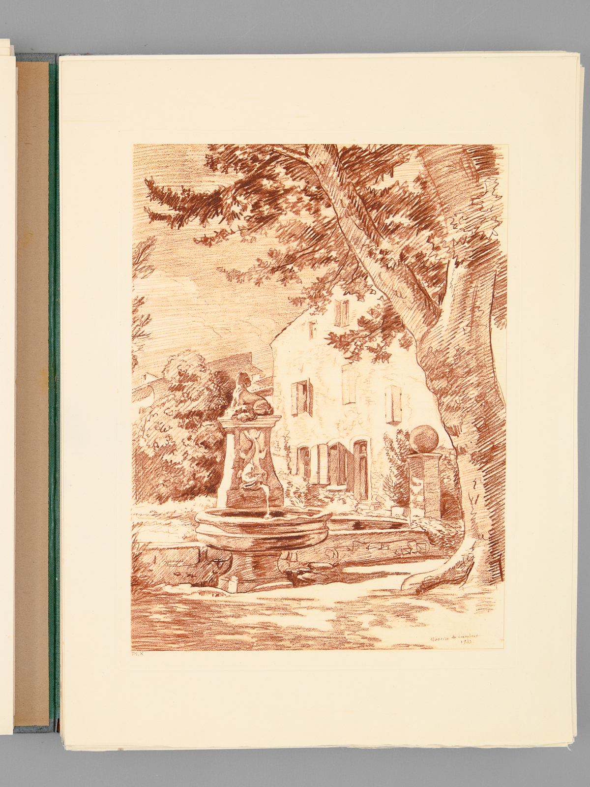 56 Gravures sur Cuivre d'après les Sépias et Sanguines de Maurice de Lambert accompagnée de textes extraits d'auteurs anciens et modernes, Lettre-Préface de Robert de La Sizeranne, Tirage à 996 exemplaires, un des 945 exemplaires sur Rives pur fil à la forme numérotés de 52 à 996 (n° 457), 1 vol. in-4 en feuillets sous chemise cartonnée et étui, Guilhot, Editeur, Paris, 1943, 6 ff. et 56 gravures sous serpente.
