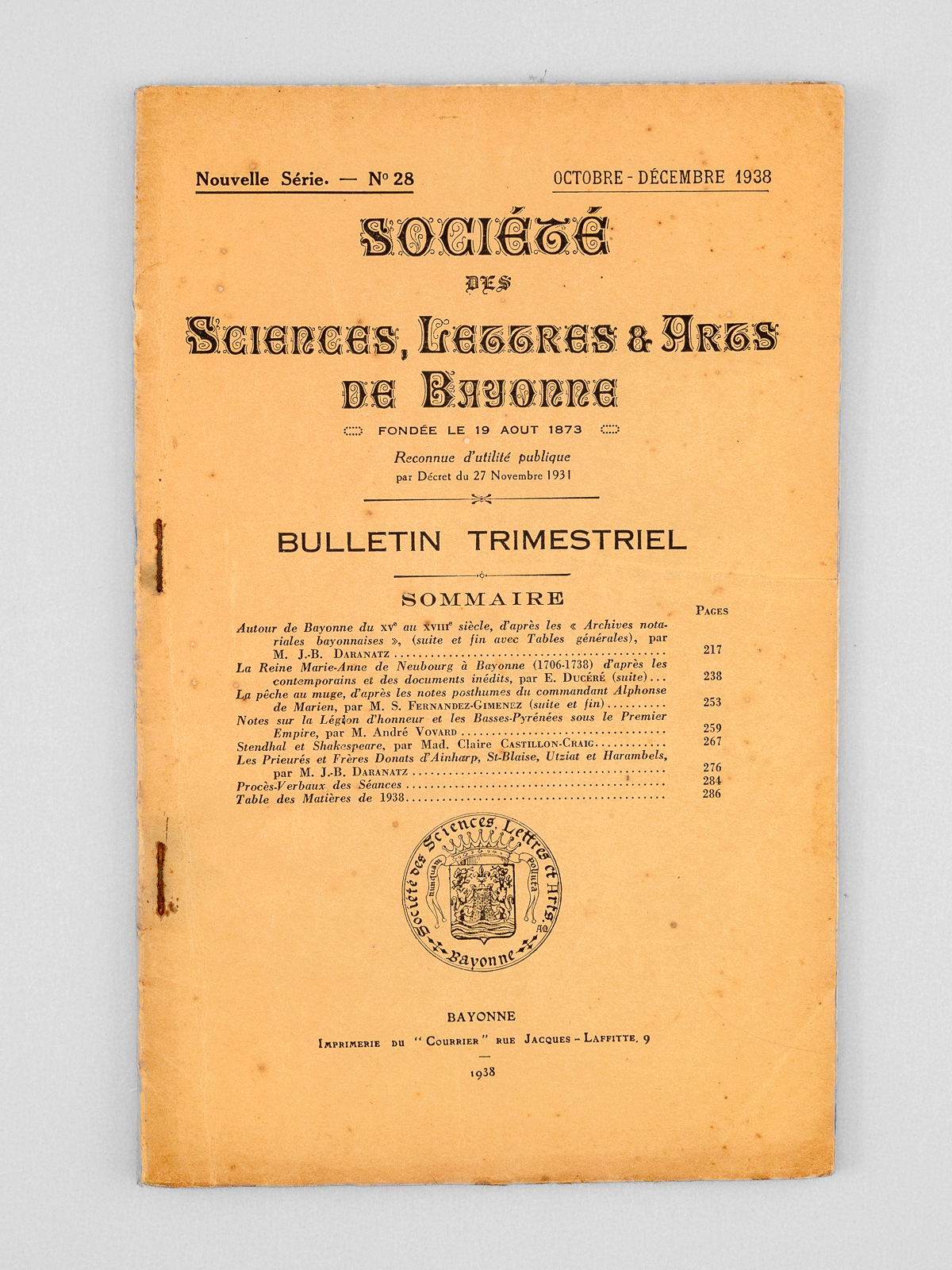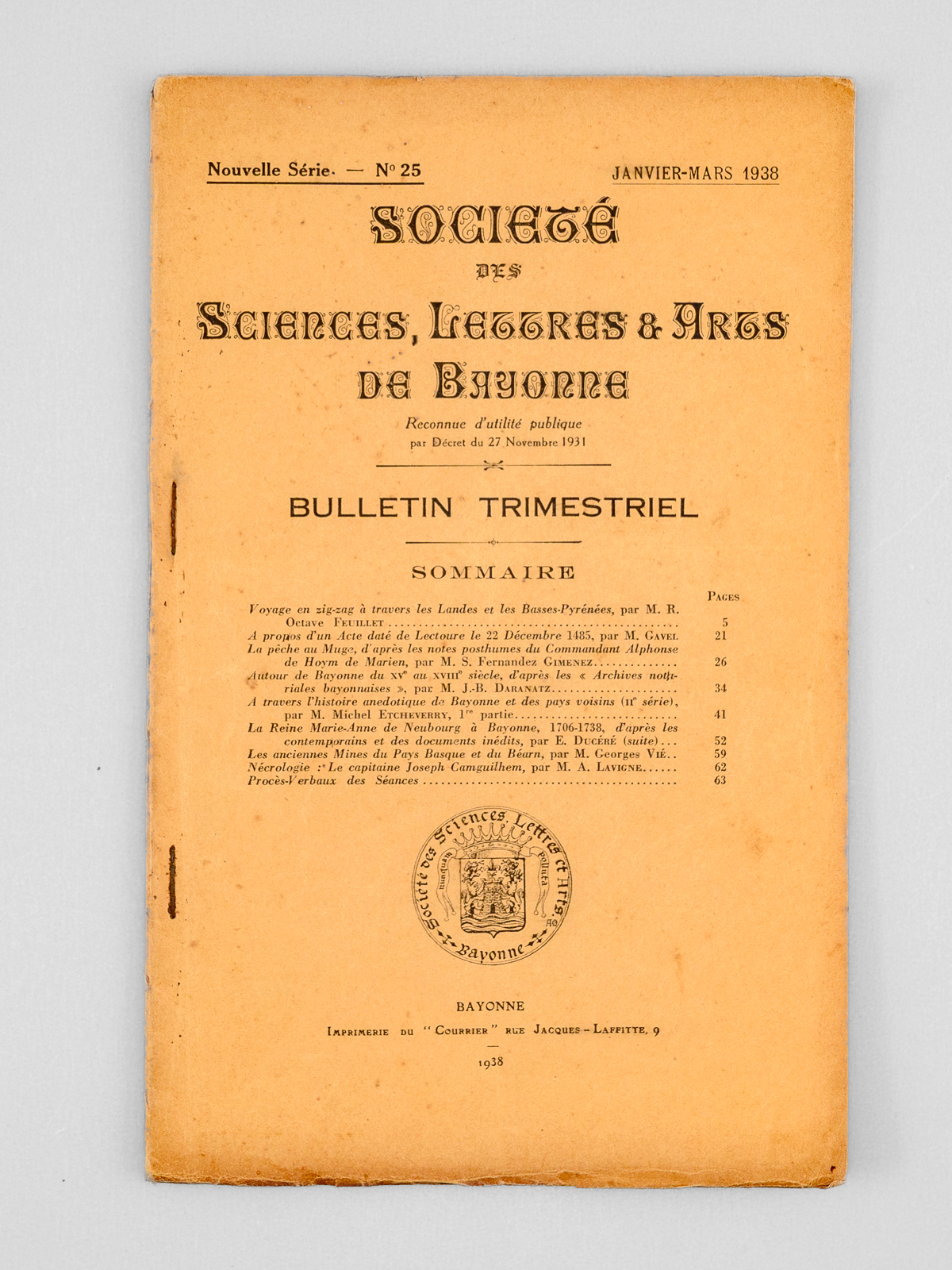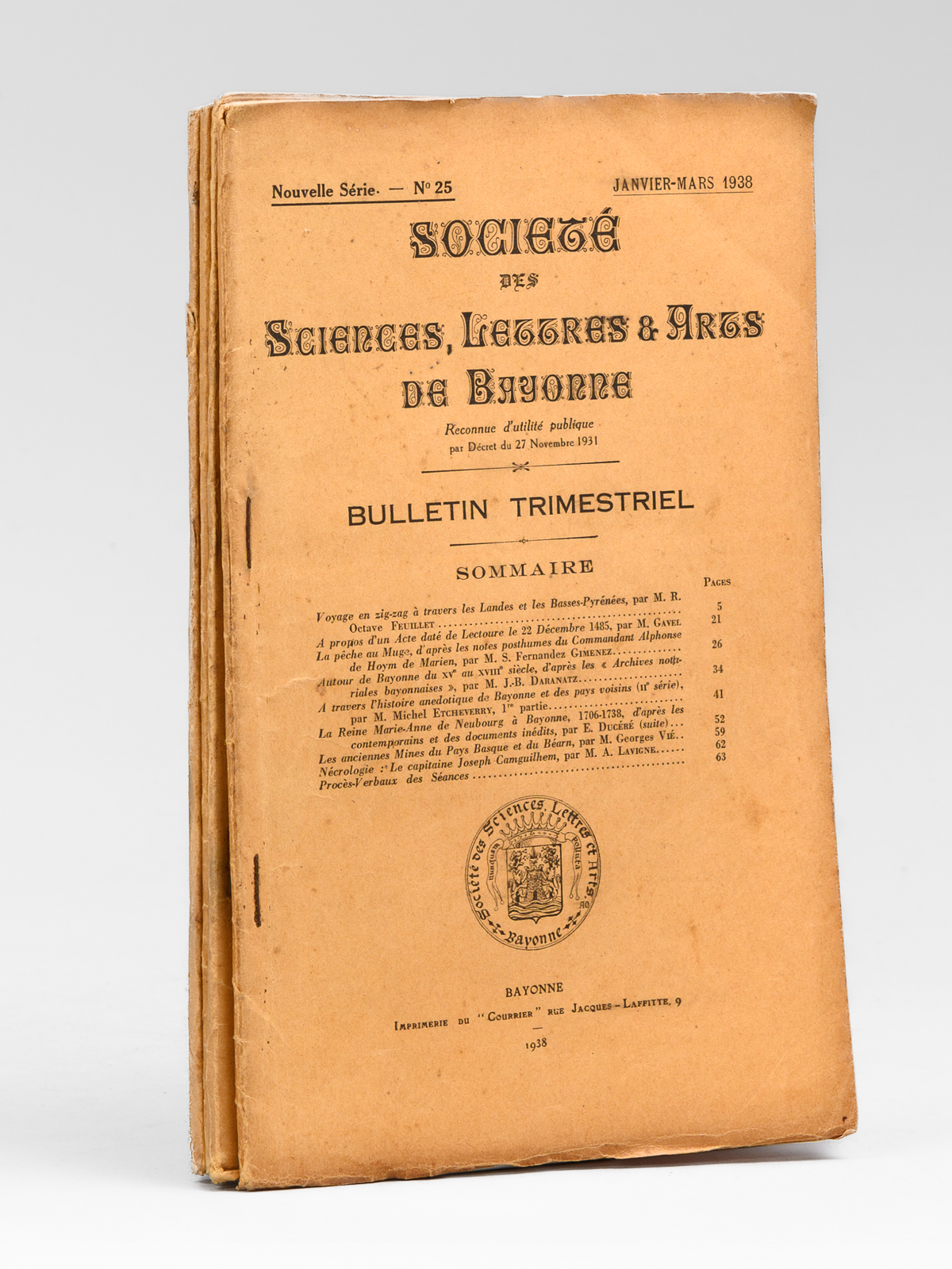 4 vol. in-8 br., Imprimerie du 'Courrier', Bayonne, 1938, 288 pp.. Au sommaire : Voyage en zig-zag à travers les Landes et les Basses-Pyrénées ; Acte daté de Lectoure le 22 Décembre 1485 ; La pêche au Muge ; Autour de Bayonne du XVe au XVIIIe siècle ; A travers l'histoire anecdotique de Bayonne ; La Reine Marie-Anne de Neubourg à Bayonne ; Les anciennes Mines du Pays Basque et du Béarn ; Nécrologie : Le capitaine Joseph Camguilhem ; Lettres sur l'antiquité du siège épiscopal de Bayonne ; Les dons au Louvre ; Les Comètes ; Rectification ; A travers l'histoire anecdotique de Bayonne ; La Cathédrale de Bayonne ; La pêche au Muge ; La culture des perles au Japon ; Le Temple israélite de Bayonne ; Autour de Bayonne du XVe au XVIIIe siècle ; Nécrologie : M. le Commandant A. Lavigne ; Le Voyage de Bayonne au temps des diligences ; A travers l'histoire anecdotique de Bayonne ; Encore les Grottes d'Isturitz ; A propos du cadran solaire de la Cathédrale ; L'Infant-Roi Jean Ier ; La pêche au muge ; Les mines et ferrières de la vallée de la Soule ; Note sur le Couroucou du Muséum d'histoire naturelle ; Un bronze du Pape Urbain VIII ; Autour de Bayonne du XVe au XVIIIe siècle (suite et fin avec Tables générales) ; La Reine Marie-Anne de Neubourg à Bayonne ; La pêche au muge ; Notes sur la Légion d'honneur et les Basses-Pyrénées sous le Premier Empire ; Stendhal et Shakespeare ; Les Prieurés et Frères Donats d'Ainharp, St-Blaise, Utziat et Harambels ; Procès-Verbaux des Séances ; Table des Matières de 1938.