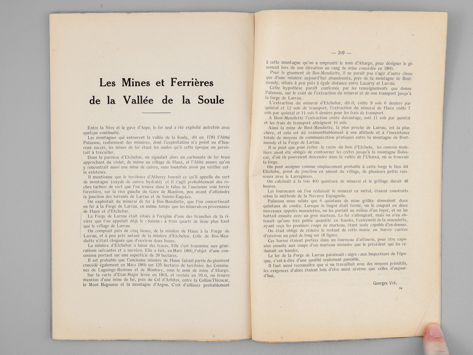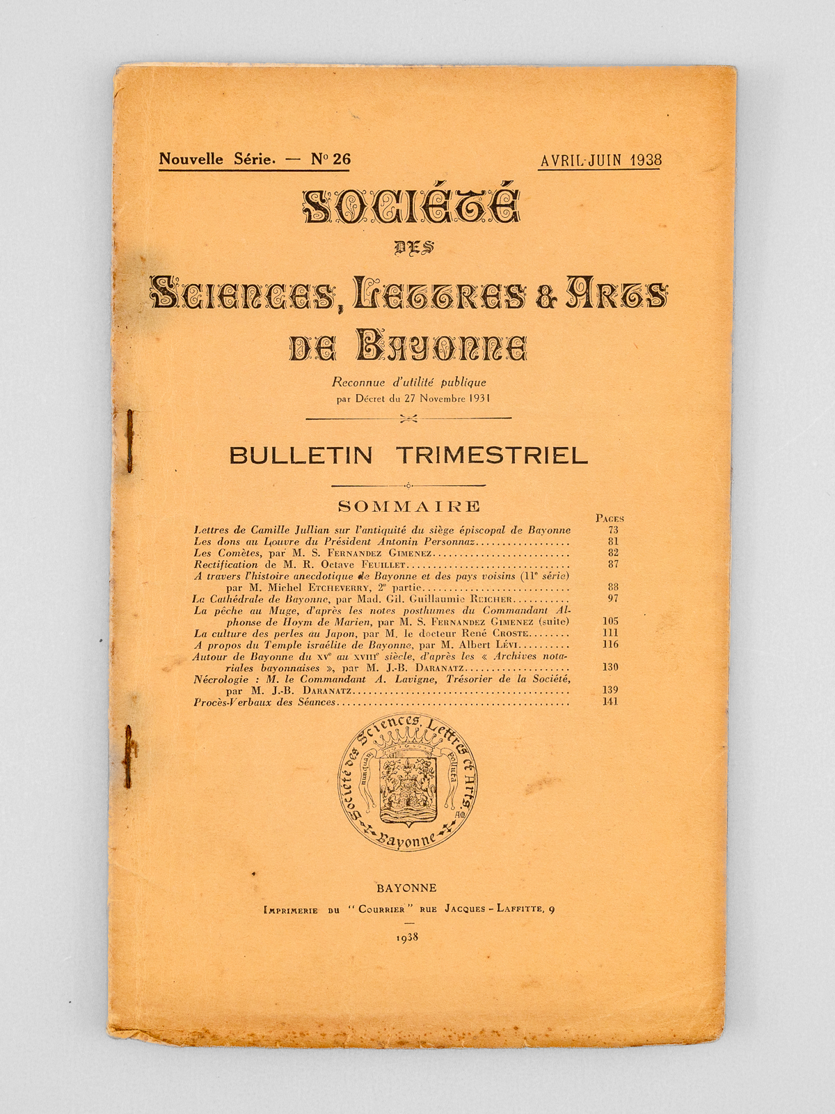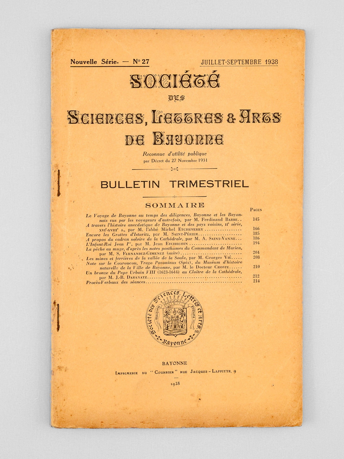 4 vol. in-8 br., Imprimerie du 'Courrier', Bayonne, 1938, 288 pp.. Au sommaire : Voyage en zig-zag à travers les Landes et les Basses-Pyrénées ; Acte daté de Lectoure le 22 Décembre 1485 ; La pêche au Muge ; Autour de Bayonne du XVe au XVIIIe siècle ; A travers l'histoire anecdotique de Bayonne ; La Reine Marie-Anne de Neubourg à Bayonne ; Les anciennes Mines du Pays Basque et du Béarn ; Nécrologie : Le capitaine Joseph Camguilhem ; Lettres sur l'antiquité du siège épiscopal de Bayonne ; Les dons au Louvre ; Les Comètes ; Rectification ; A travers l'histoire anecdotique de Bayonne ; La Cathédrale de Bayonne ; La pêche au Muge ; La culture des perles au Japon ; Le Temple israélite de Bayonne ; Autour de Bayonne du XVe au XVIIIe siècle ; Nécrologie : M. le Commandant A. Lavigne ; Le Voyage de Bayonne au temps des diligences ; A travers l'histoire anecdotique de Bayonne ; Encore les Grottes d'Isturitz ; A propos du cadran solaire de la Cathédrale ; L'Infant-Roi Jean Ier ; La pêche au muge ; Les mines et ferrières de la vallée de la Soule ; Note sur le Couroucou du Muséum d'histoire naturelle ; Un bronze du Pape Urbain VIII ; Autour de Bayonne du XVe au XVIIIe siècle (suite et fin avec Tables générales) ; La Reine Marie-Anne de Neubourg à Bayonne ; La pêche au muge ; Notes sur la Légion d'honneur et les Basses-Pyrénées sous le Premier Empire ; Stendhal et Shakespeare ; Les Prieurés et Frères Donats d'Ainharp, St-Blaise, Utziat et Harambels ; Procès-Verbaux des Séances ; Table des Matières de 1938.