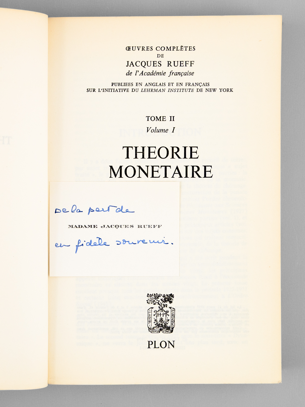 1 vol. in-8 br., Hachette, Paris, 1979, 464 pp. Commentaire : Avec une carte ms. de la veuve de l'auteur, décédé l'année précédente. Exemplaire provenant de la bibliothèque de Maurice Druon. Maurice Druon, qui était neveu de Joseph Kessel, fut résistant, écrivain auteur notamment de la saga historique des Rois maudits, et homme politique. Elu à l'Académie Française en 1968, il en devint le Secrétaire Perpétuel en 1985. Jacques Rueff, quant à lui, avait été élu à l'Académie en 1964. Bon état pour cet exemplaire d'une origine prestigieuse.