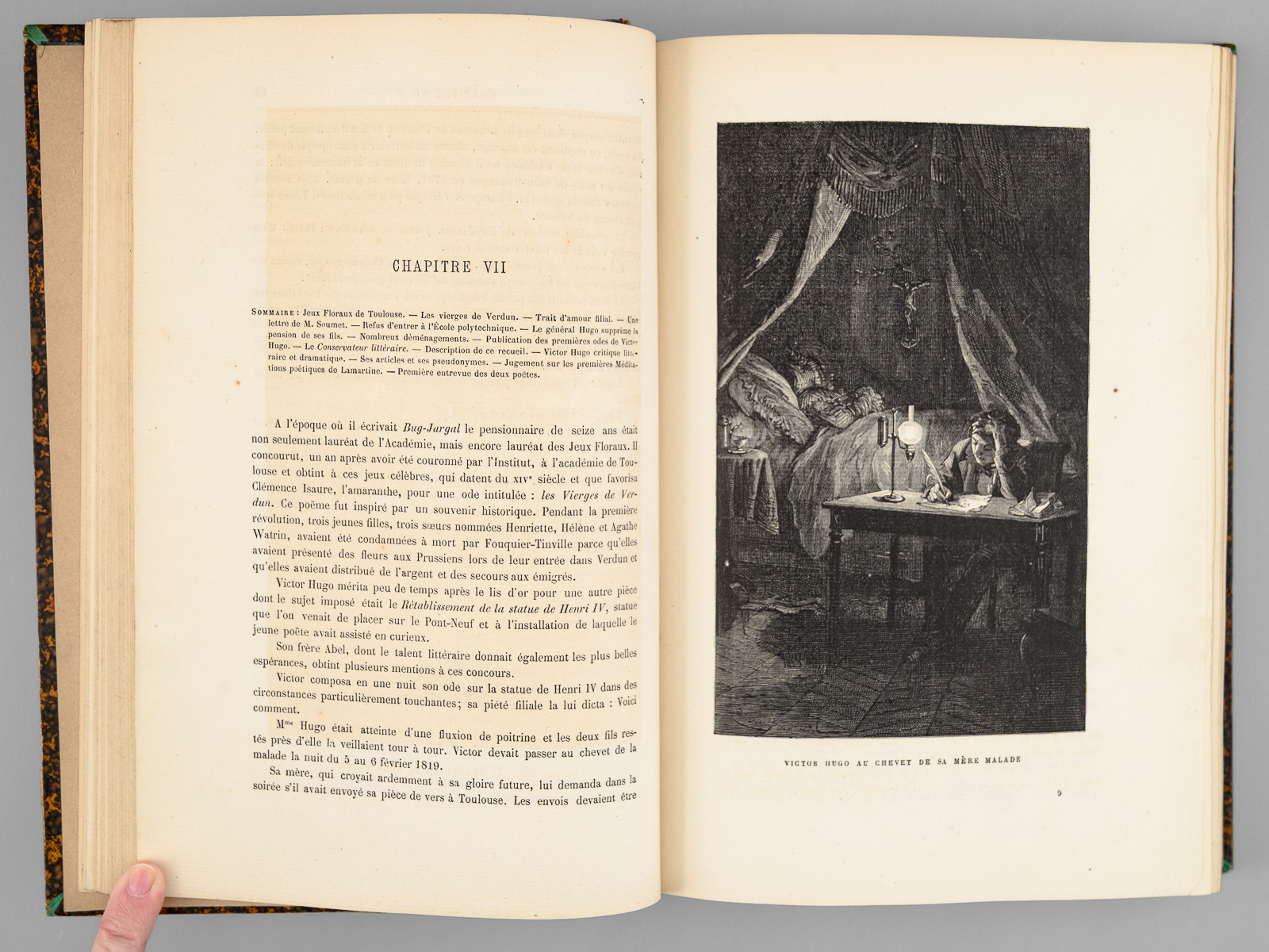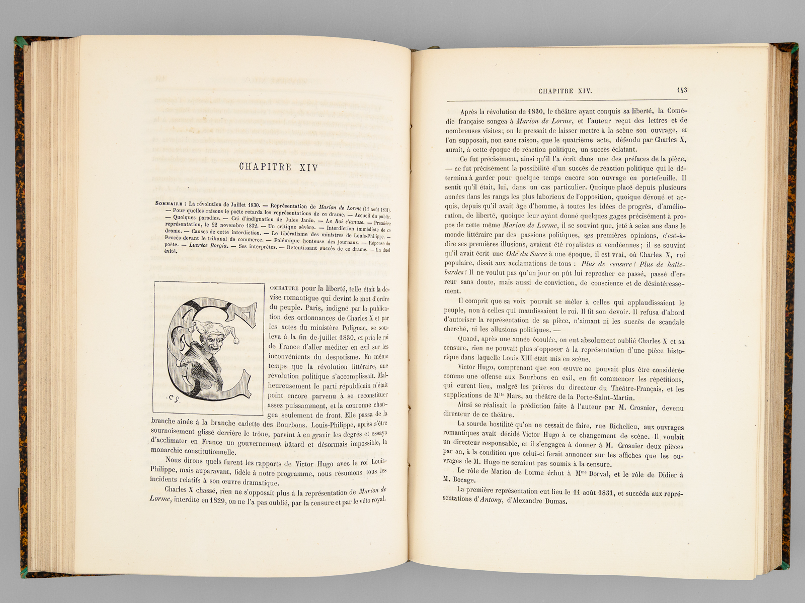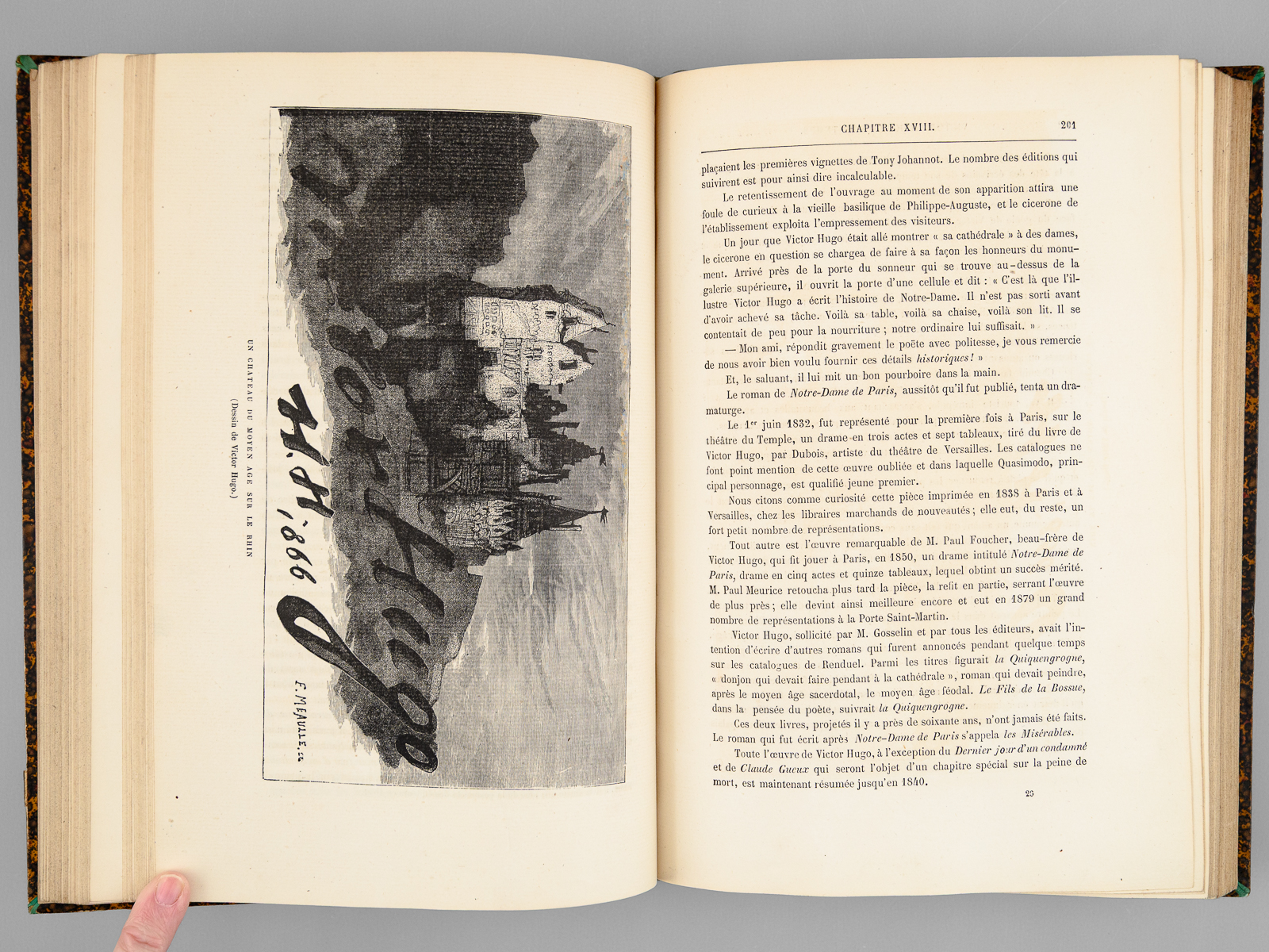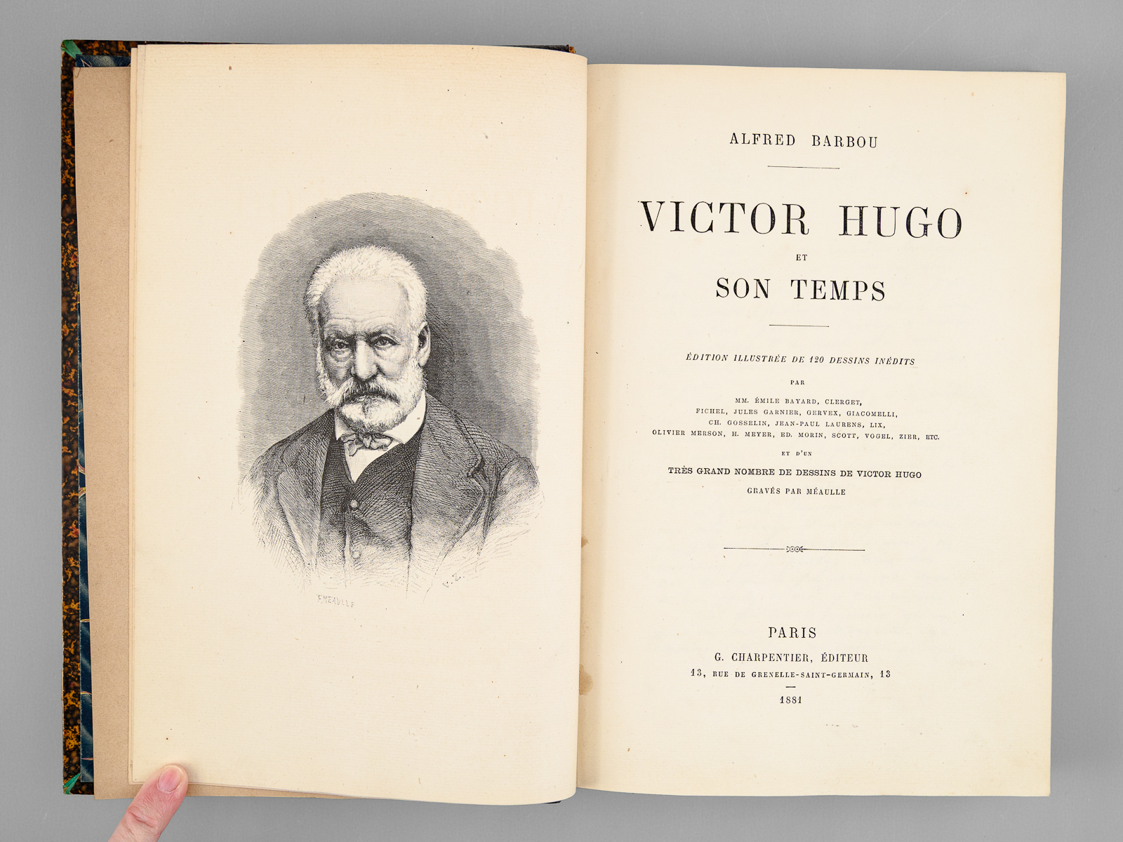 Edition illustrée de 120 dessins inédits par Emile Bayard, Clerget, etc... et d'un très grand nombre de dessins de Victor Hugo, gravés par Méaulle, 1 vol. petit in-4 reliure demi-chagrin brun, dos à 5 nerfs, G. Charpentier, Paris, 1881, 458 pp.