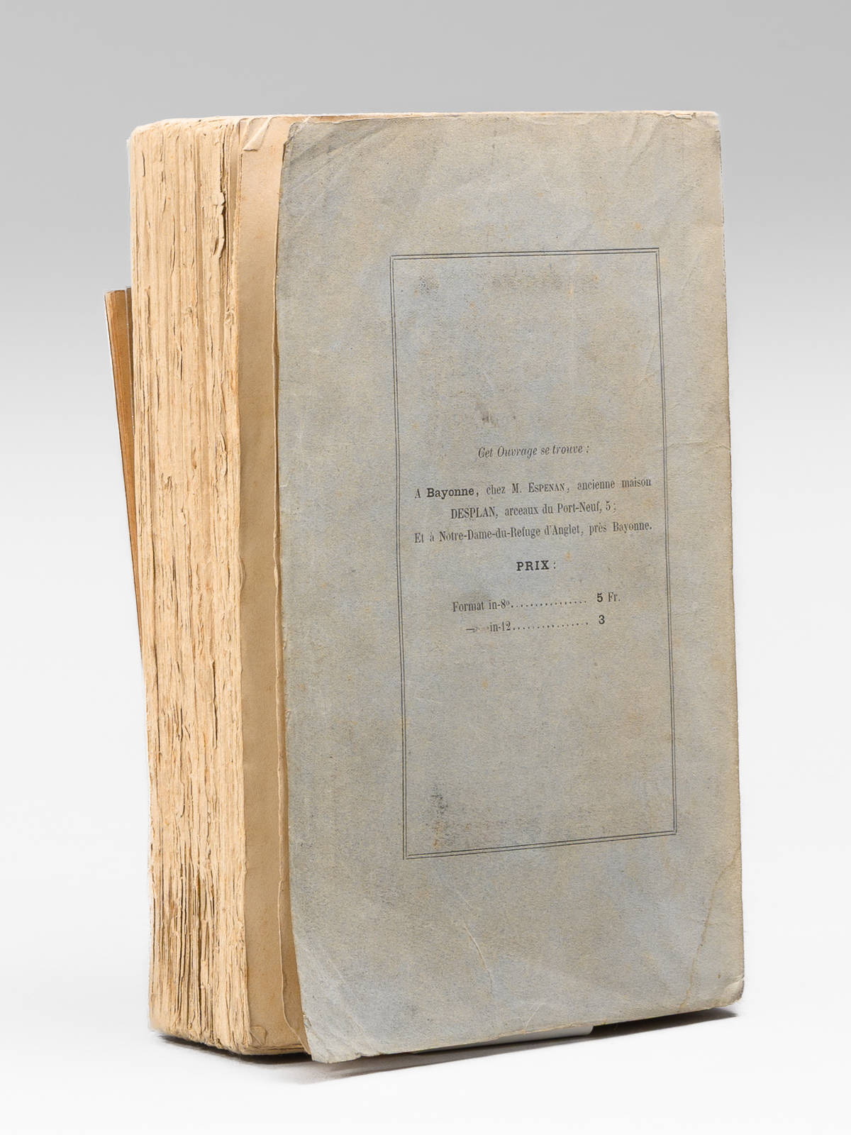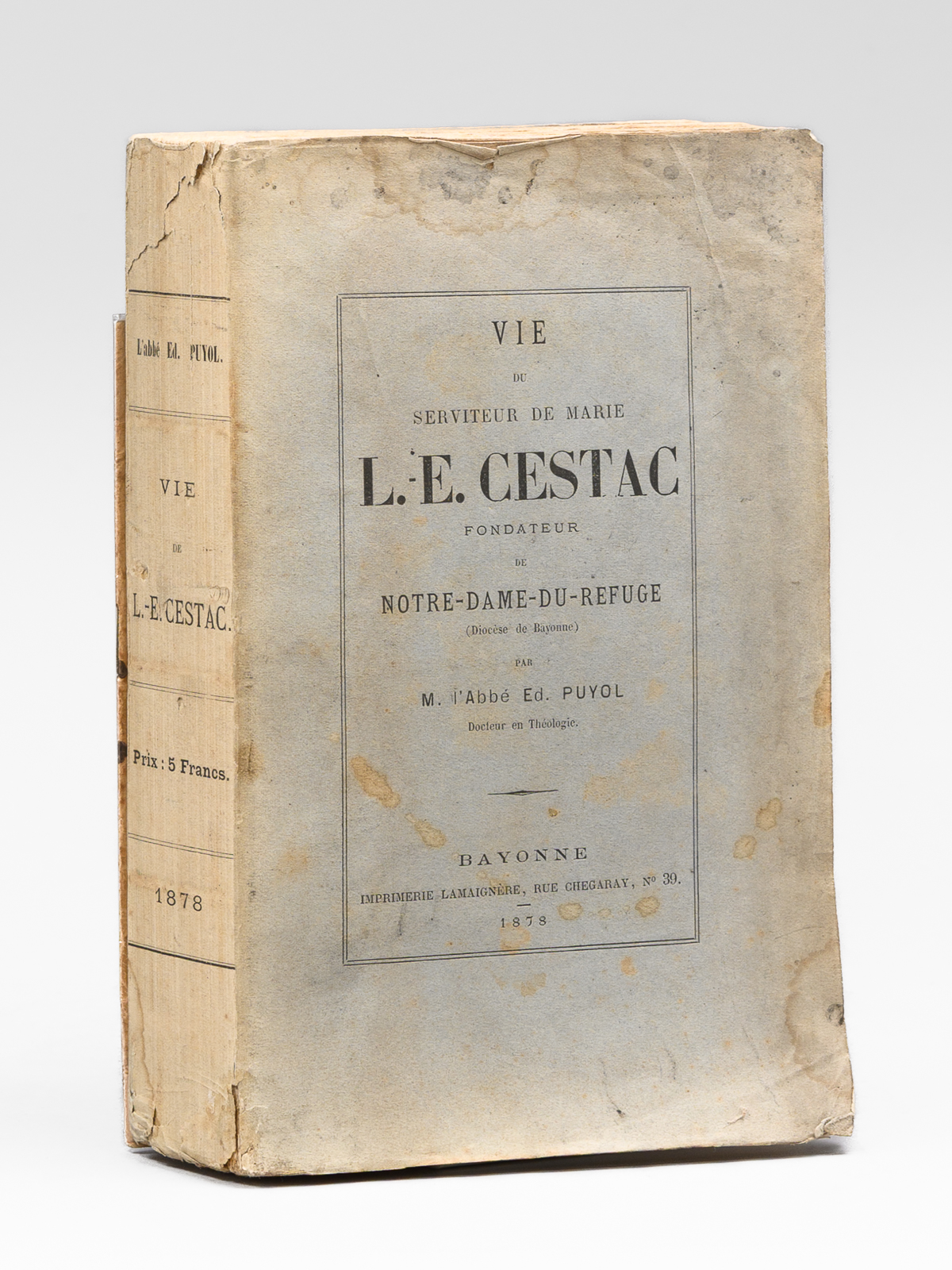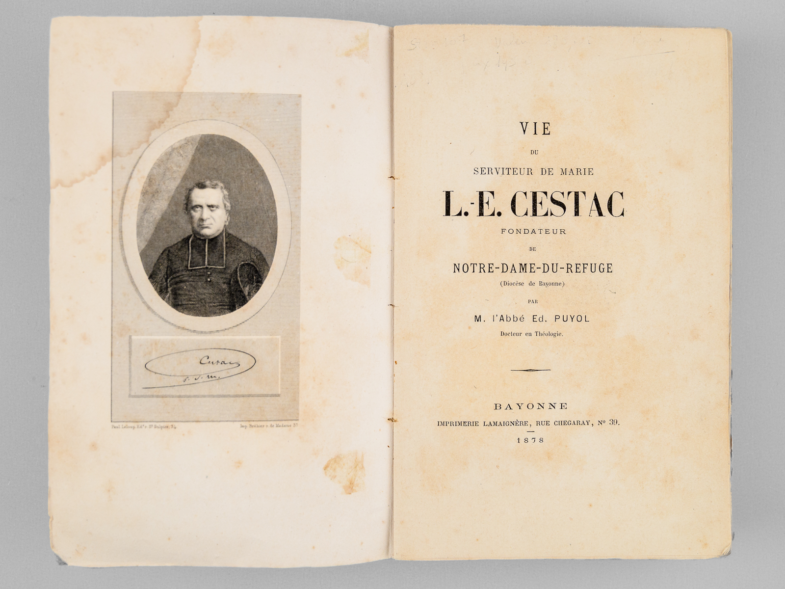 1 vol. in-8 br., imprimerie Lamaignère, Bayonne, 1878, 656 pp. [on joint : ] 1 vol. in-12 br., Apostolat de la Prière, Toulouse, 1929, 31 pp. Commentaire : Etat très satisfaisant (couv. frottée, lég. rousseurs, bon état par ailleurs) pour ce livre et cette brochure consacrés au Bienheureux Louis-Edouard Cestac (1801-1868), prêtre basque qui acheta en 1838 un domaine à Anglet. Il y fondera Notre-Dame-du-Refuge, institution destinée à réinsérer des jeunes femmes voulant quitter le monde de la prostitution. En 1851 y sera fondée une communauté de religieuses contemplatives. Ce site de N.D.-du-Refuge devint également un site pionnier en innovation agronomique, dans un premier temps, pour nourrir les pensionnaires en exploitant au mieux les terres agricoles du domaine.