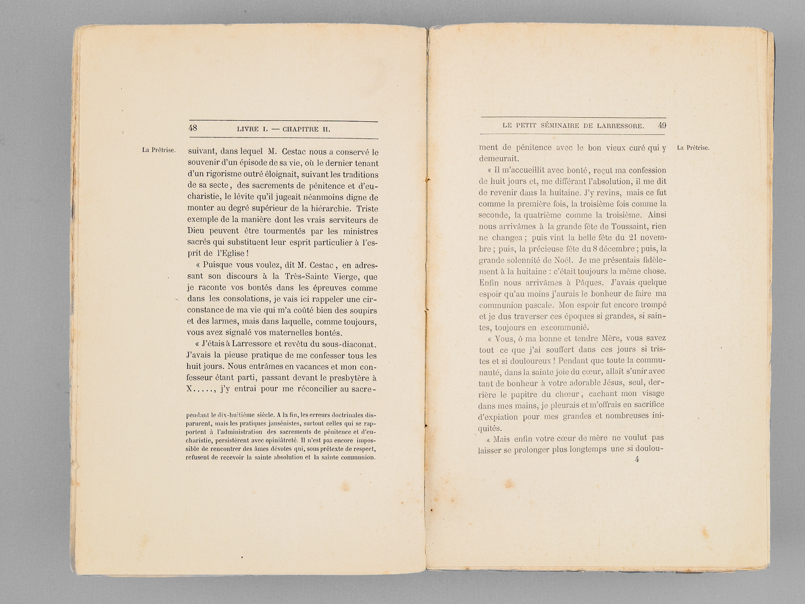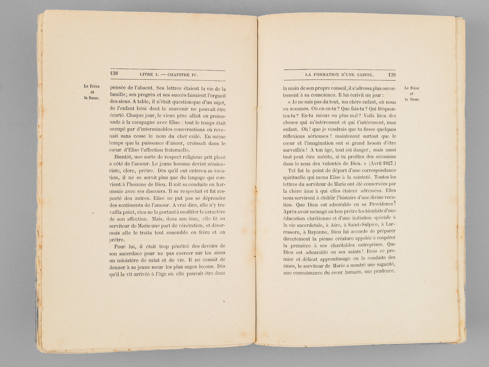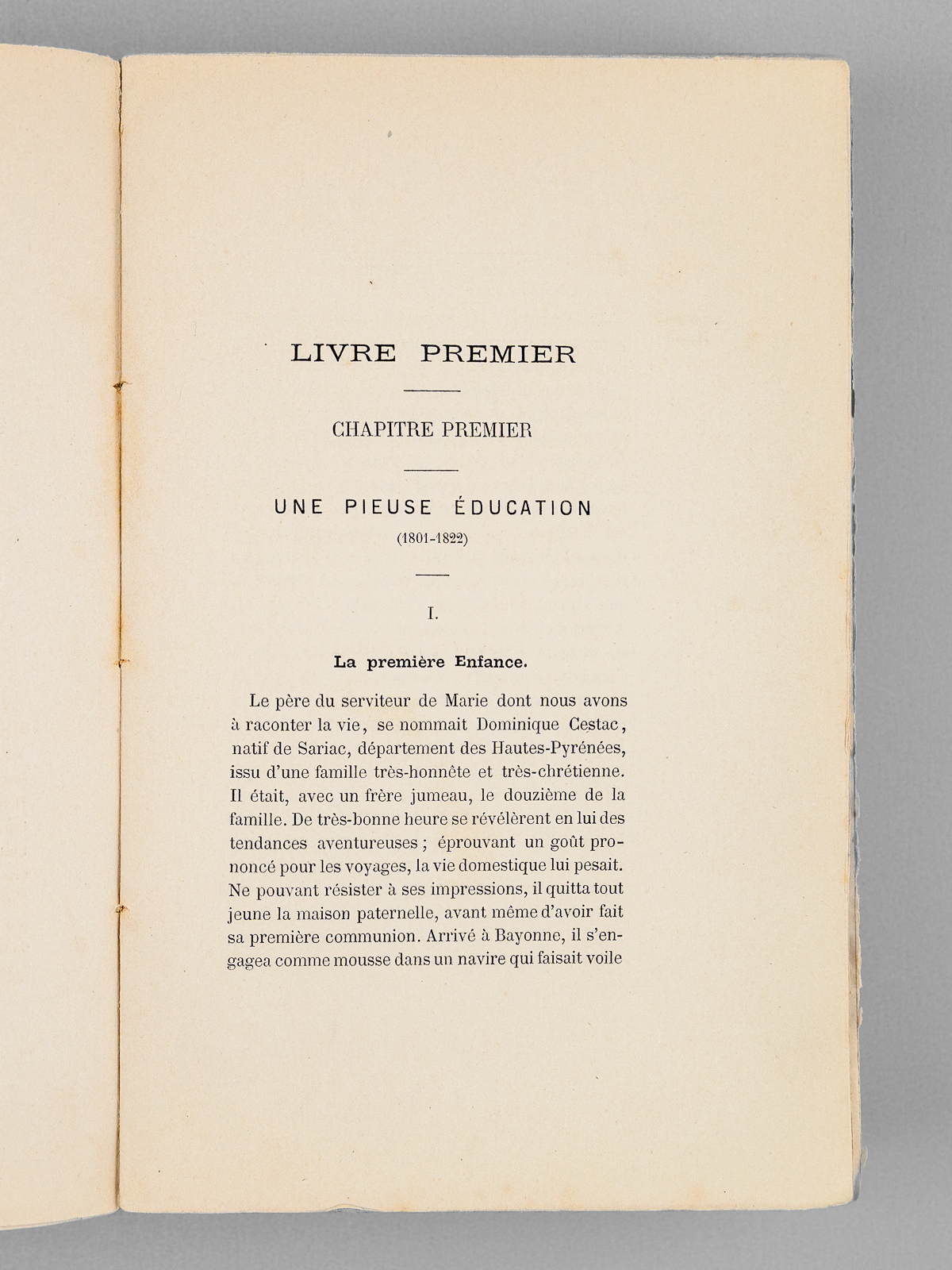 1 vol. in-8 br., imprimerie Lamaignère, Bayonne, 1878, 656 pp. [on joint : ] 1 vol. in-12 br., Apostolat de la Prière, Toulouse, 1929, 31 pp. Commentaire : Etat très satisfaisant (couv. frottée, lég. rousseurs, bon état par ailleurs) pour ce livre et cette brochure consacrés au Bienheureux Louis-Edouard Cestac (1801-1868), prêtre basque qui acheta en 1838 un domaine à Anglet. Il y fondera Notre-Dame-du-Refuge, institution destinée à réinsérer des jeunes femmes voulant quitter le monde de la prostitution. En 1851 y sera fondée une communauté de religieuses contemplatives. Ce site de N.D.-du-Refuge devint également un site pionnier en innovation agronomique, dans un premier temps, pour nourrir les pensionnaires en exploitant au mieux les terres agricoles du domaine.