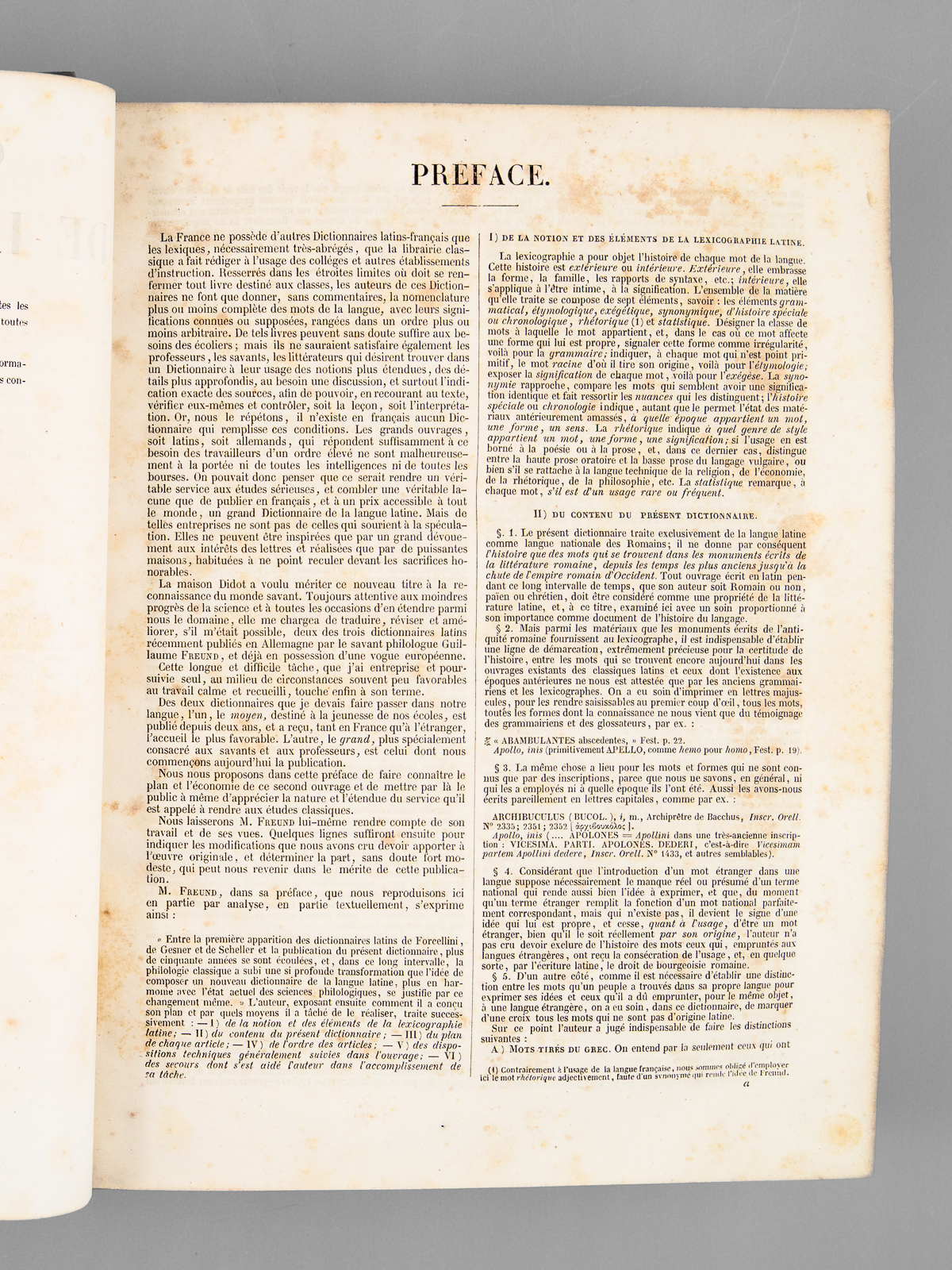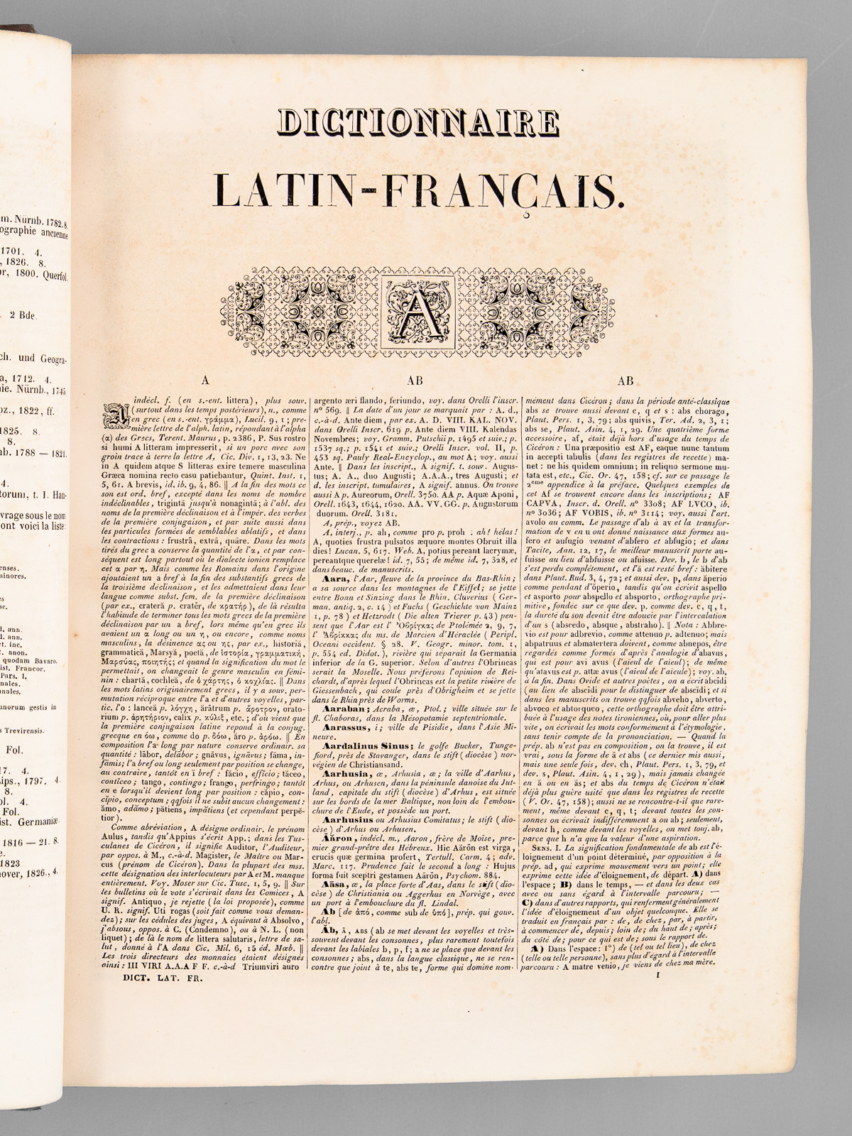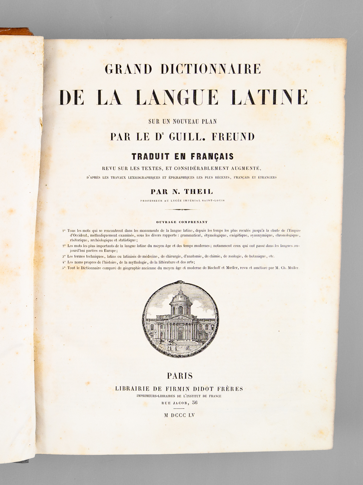 Traduit en français, revue sur les textes et considérablement augmenté, d'après les travaux lexicogaphiques et épigraphiques les plus récents, français et étrangers, 2 vol. in-folio reliure postérieure pleine basane racinée, dos à 4 nerfs dorés, Librairie de Firmin Didot Frères, Paris, 1855, 1862, 1865, 2 ff., XXXV-1160 pp. ; 2 ff., 957 pp., 2 ff., 612 pp. Commentaire : Rare exemplaire bien complet des 3 tomes du 'Grand Dictionnaire de la Langue Latine' du philologue juif prussien Wilhelm Freund (1806-1884), dans l'édition originale de la traduction, très augmentée, établie par le philologue Jean-François-Napoléon Theil, né à Langon en 1808. Etat très satisfaisant (accrocs avec mq. en coiffes, reliure frottées mais bien solides, bon état par ailleurs).